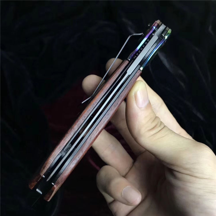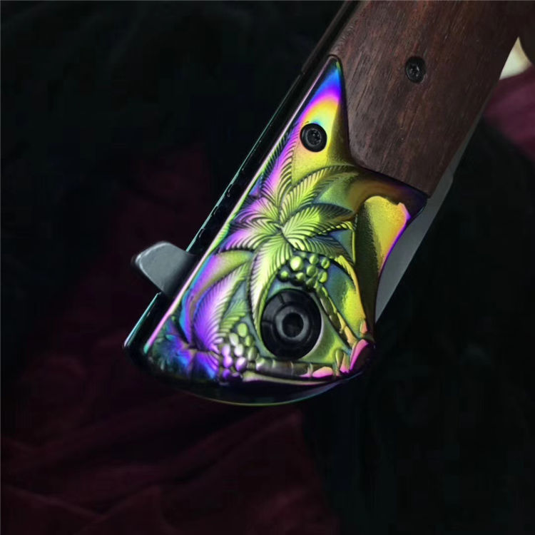全长:22.5cm 刃长:9cm 柄长:13cm 刃宽:2cm 刃厚:2.5mm 刃材:3Cr13Mov 重量:200g(含包装) 硬度:56HRC 表面:拉丝 柄材:全钢镭射刻花+彩木 锁型:内衬锁 包装:纸盒