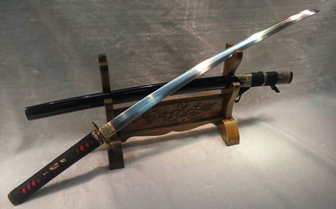 全长:102cm 刃长:72cm 柄长:27cm 刃宽:3.2cm 刃厚:0.75cm 全重:1400 g (含鞘) 总重:2500g(含锦盒) 刃材:精炼地基钢,手工覆土烧刃 鞘材:手工包半鲨鱼皮加油黑色烤漆 装具配件:手工精品全铜刻花 日本工艺镏金锍银 柄材:硬木精细扎绳加工工艺 工艺:包钢缚土烧刃,传统古法14道研磨。 硬度区间:刃口62HRC;刀身:58HRC 性能:削纸断竹砍铁 备注:手工产品存在误差,规格仅供参考,请以实物为准!