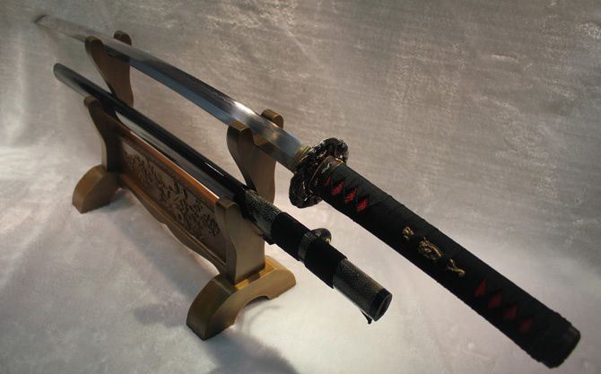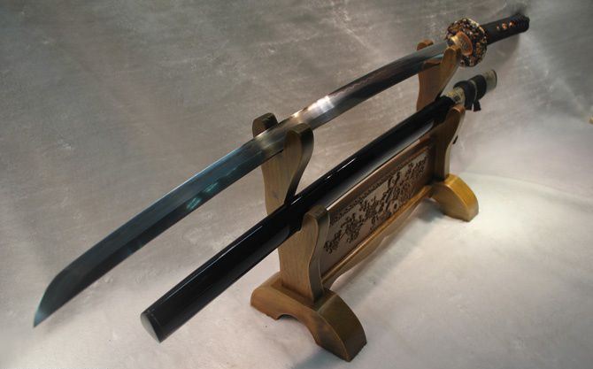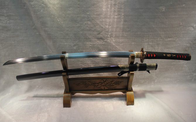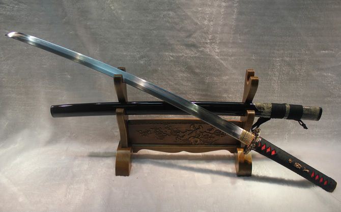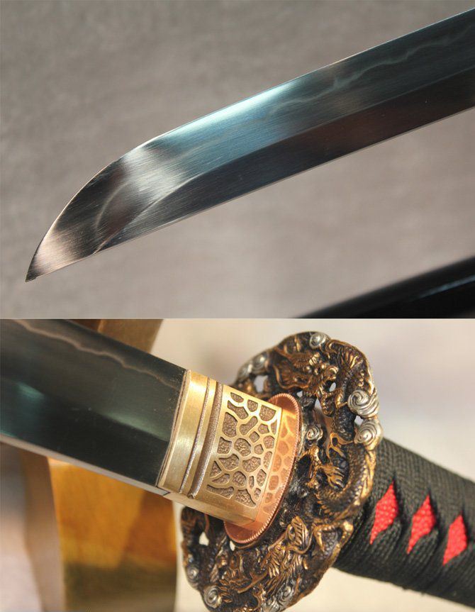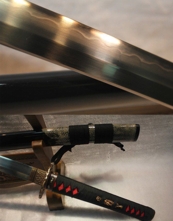 卷龙半包鱼皮烧刃日本刀 全长:102cm 刃长:72cm 柄长:27cm 刃宽:3.2cm 刃厚:0.75cm 全重:1400 g (含鞘) 总重:2500g(含锦盒) 刃材:精炼地基钢,手工覆土烧刃 鞘材:手工包半鲨鱼皮加油黑色烤漆 装具配件:手工精品全铜刻花 日本工艺镏金锍银 柄材:硬木精细扎绳加工工艺 工艺:包钢缚土烧刃,传统古法14道研磨。 硬度区间:刃口62HRC;刀身:58HRC 性能:削纸断竹砍铁 备注:手工产品存在误差,规格仅供参考,请以实物为准!