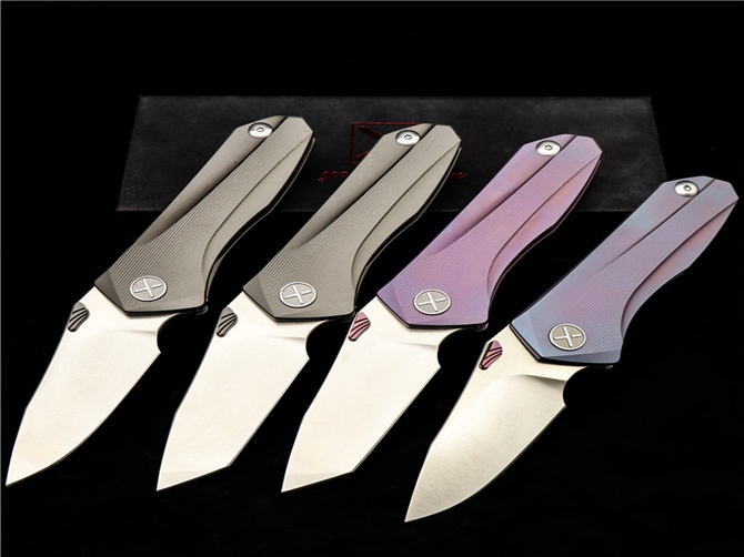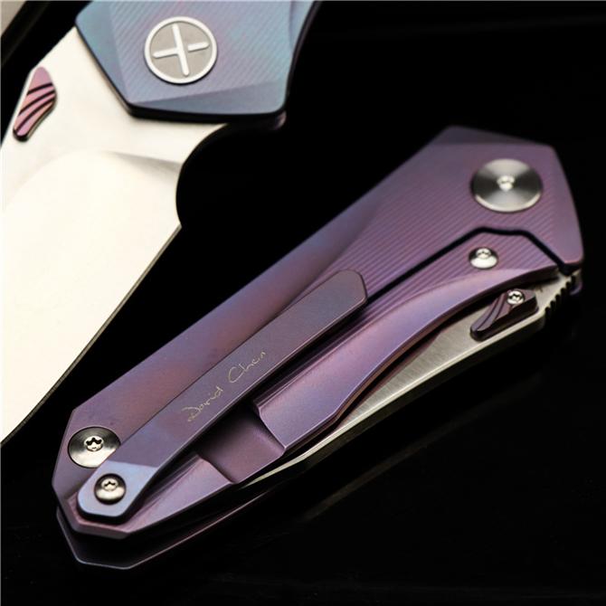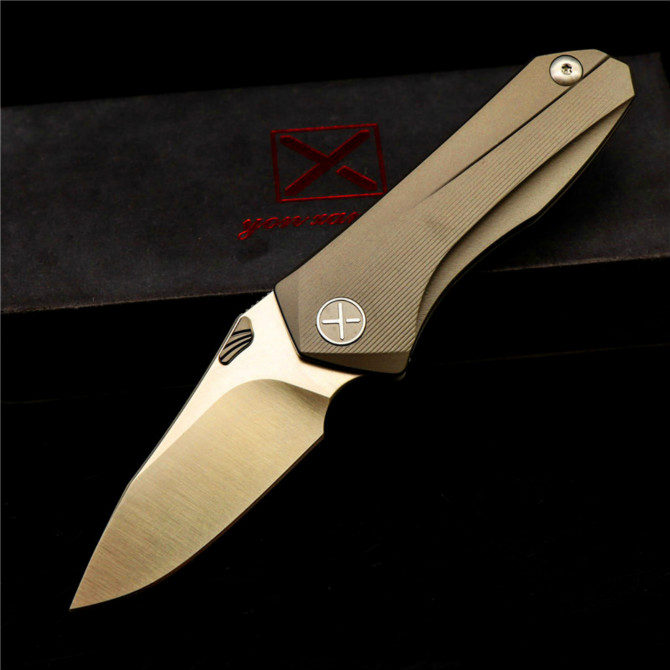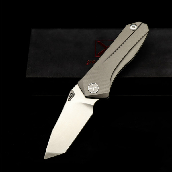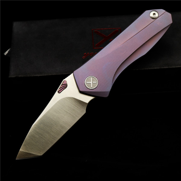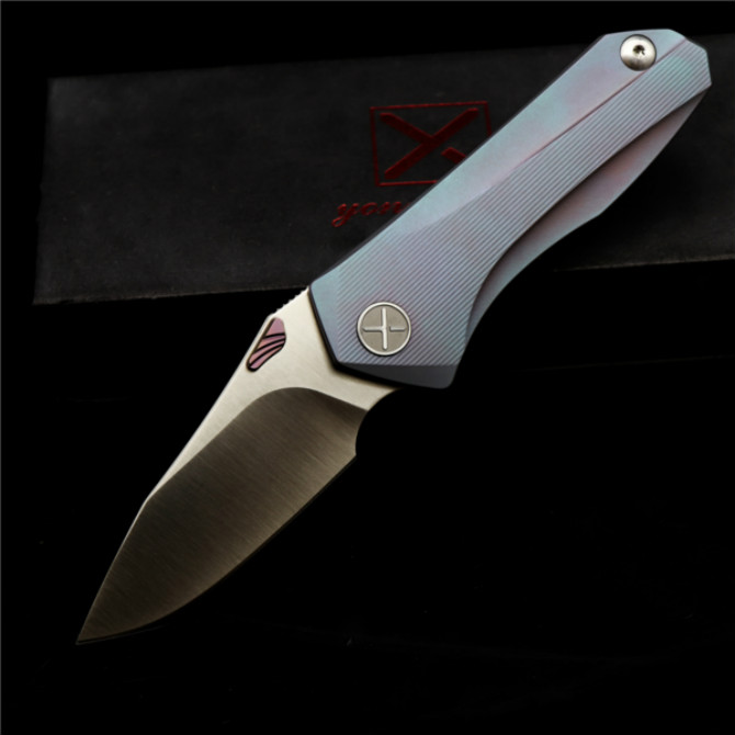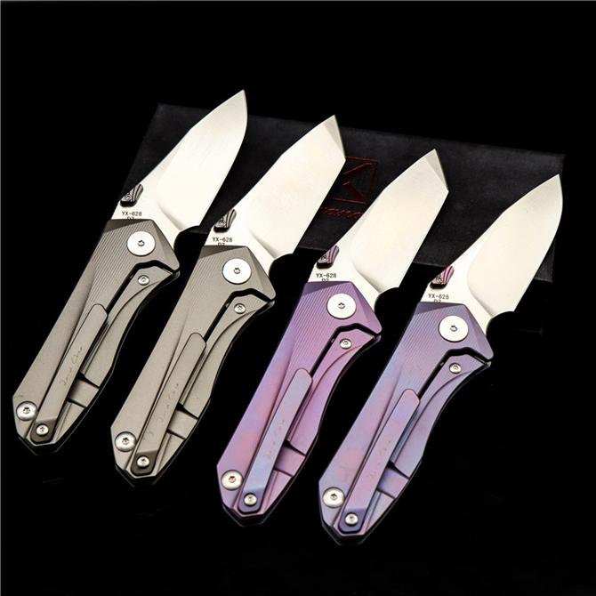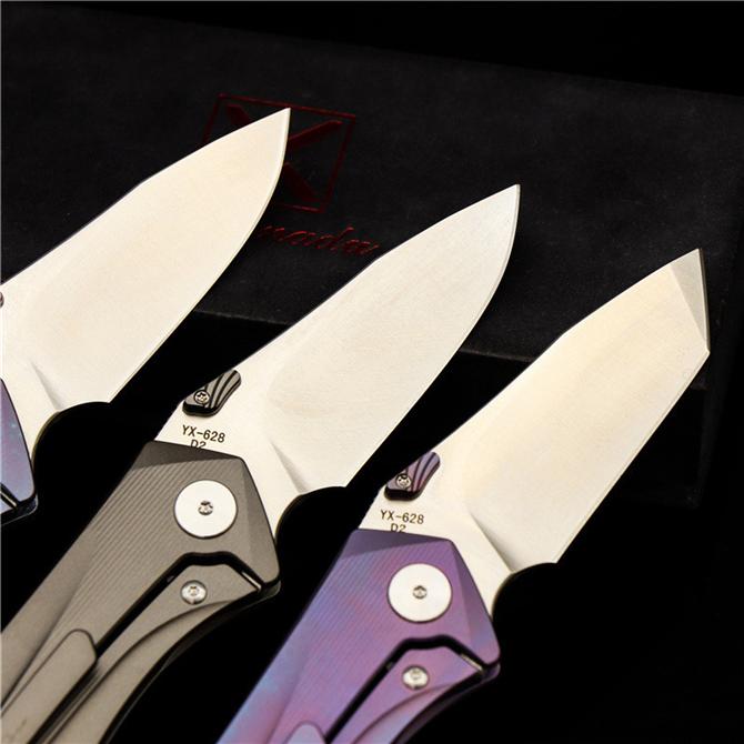 D2钢YX628折刀 叶片角度:60度 全长:161毫米 刀片长度:60mm 手柄长度:90mm 刀片宽度:26mm(最宽) 刀片厚度:3mm 刀锋:D2 净重:120 硬度:60HRC 表面:研磨 手柄:TC4钛合金
