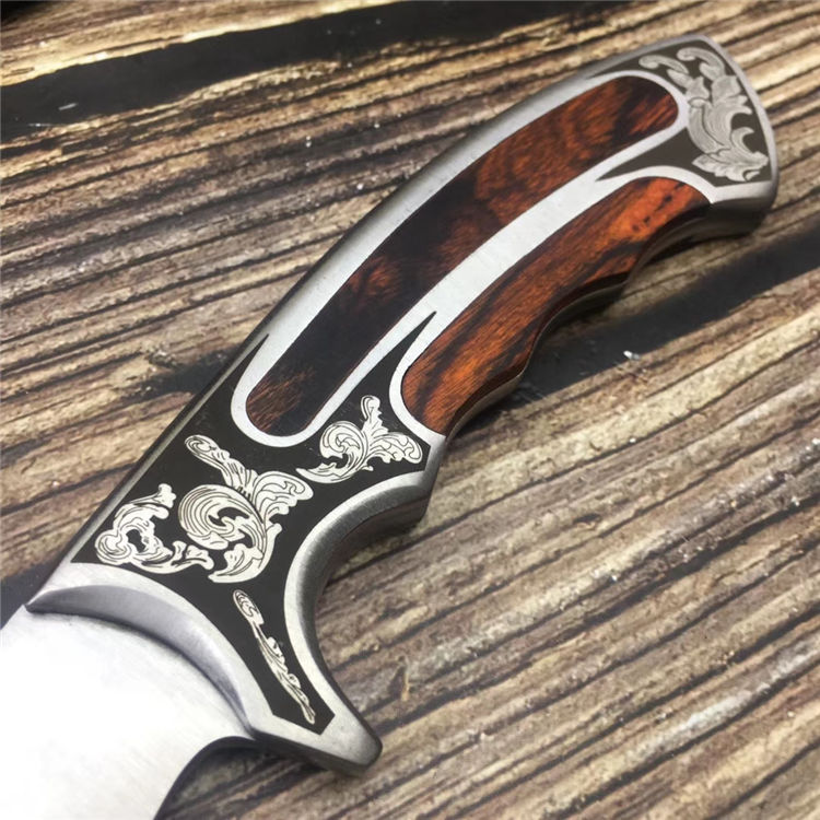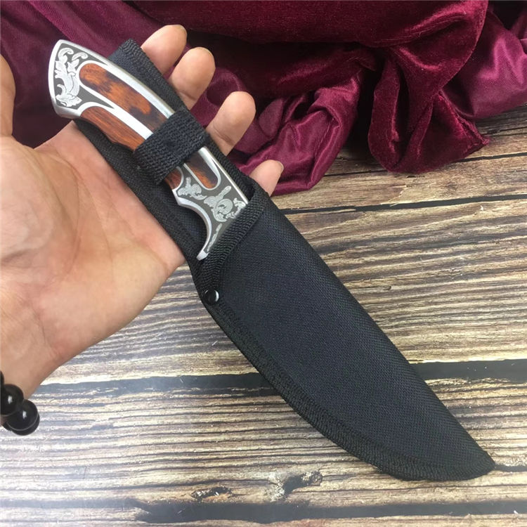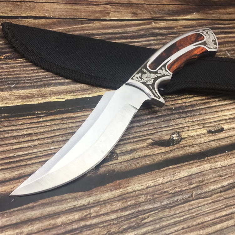 迪拜战术弯刀 类型:弯刀 全长:25cm 刃长:12.4cm 刃宽:3cm(最宽处) 刃厚:0.4cm 柄长:12.6cm 表面: 拉丝+镜光 刃材: 3CR13 硬度: 57HRC 柄材: 钢柄+进口彩木 重量: 350克(含包装) 包装:尼龙套
