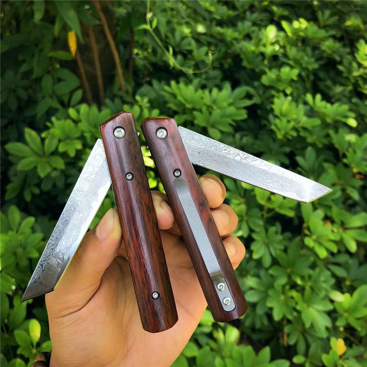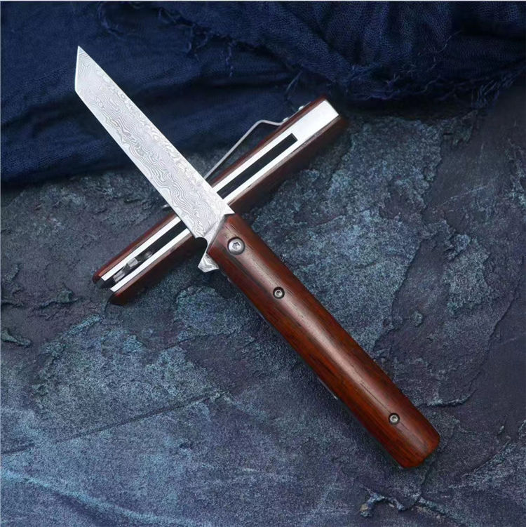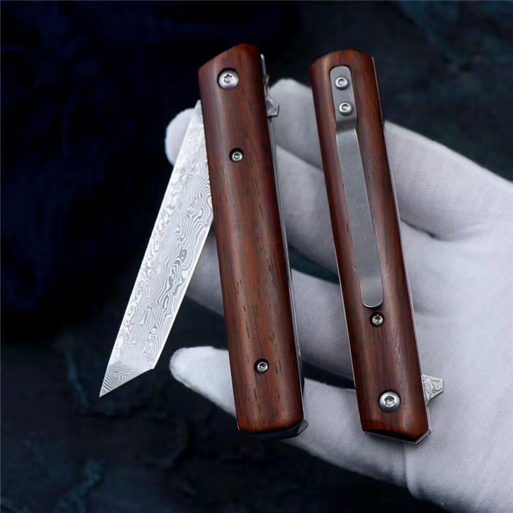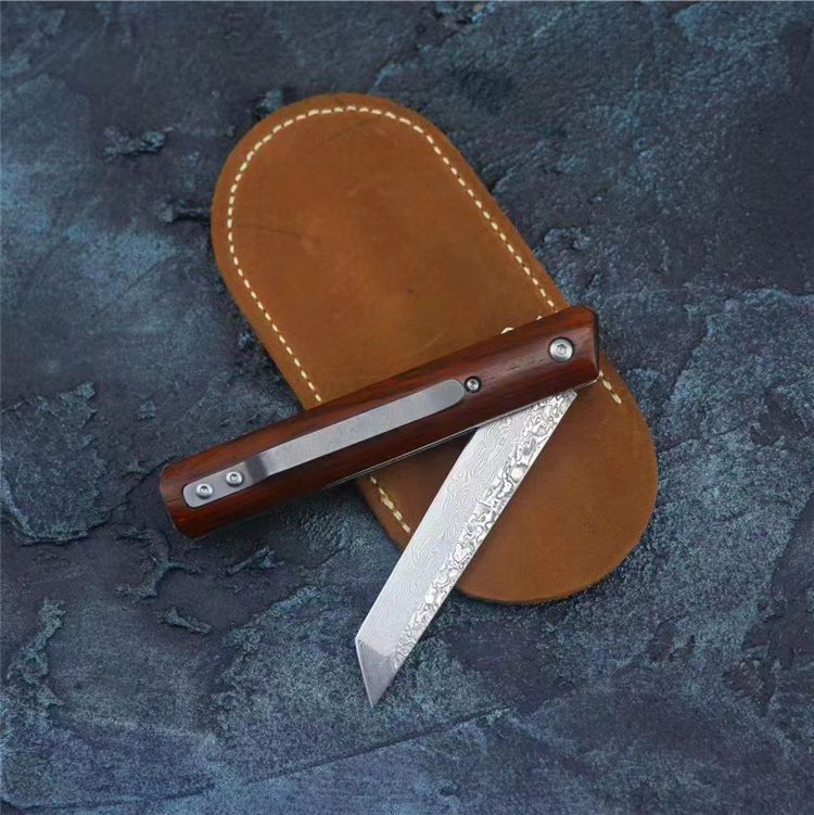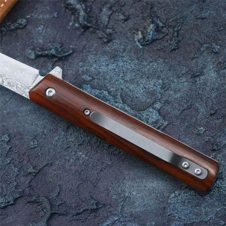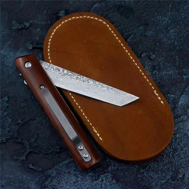 大马士革军需官折刀 总长:18.6cm 刃长:8cm 折合长:10.6cm 刃宽:1.6cm 厚度:2.5mm 刃材:进口锻造大马士革钢 硬度:60HRC,真空热处理 手柄:进口微粒黄檀木木 开刃方式:二次手工开刃 内部结构:轴承滚珠结构 包装:黑色礼品小盒