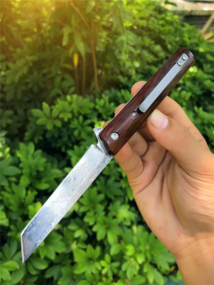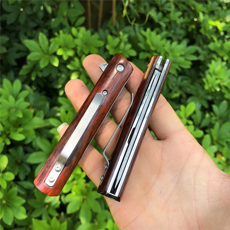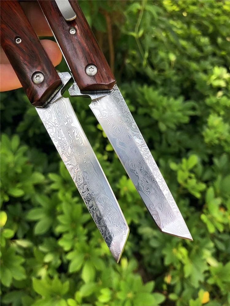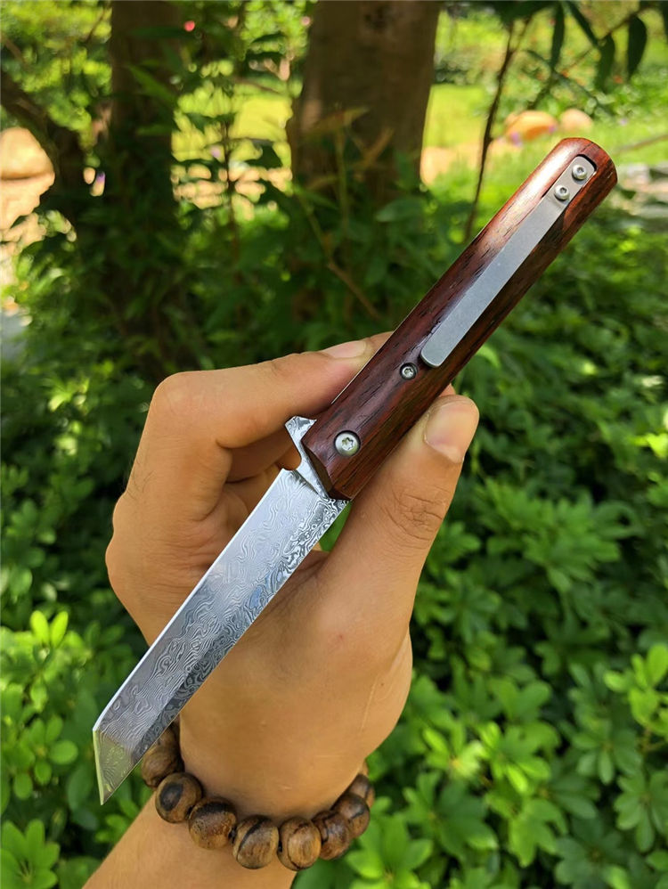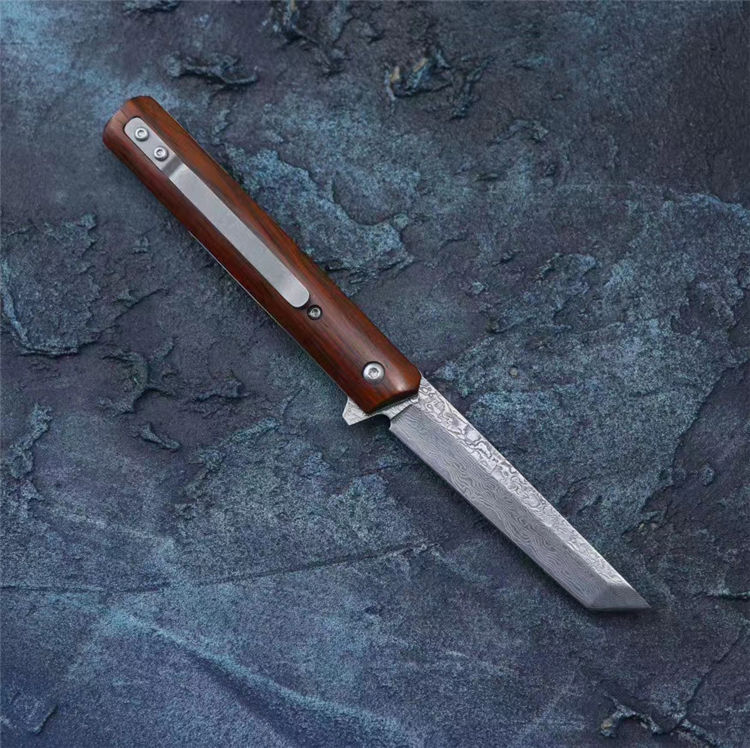 大马士革军需官折刀 总长:18.6cm 刃长:8cm 折合长:10.6cm 刃宽:1.6cm 厚度:2.5mm 刃材:进口锻造大马士革钢 硬度:60HRC,真空热处理 手柄:进口微粒黄檀木木 开刃方式:二次手工开刃 内部结构:轴承滚珠结构 包装:黑色礼品小盒