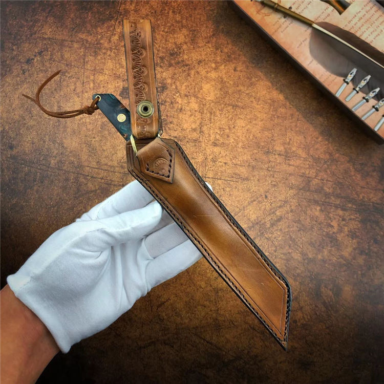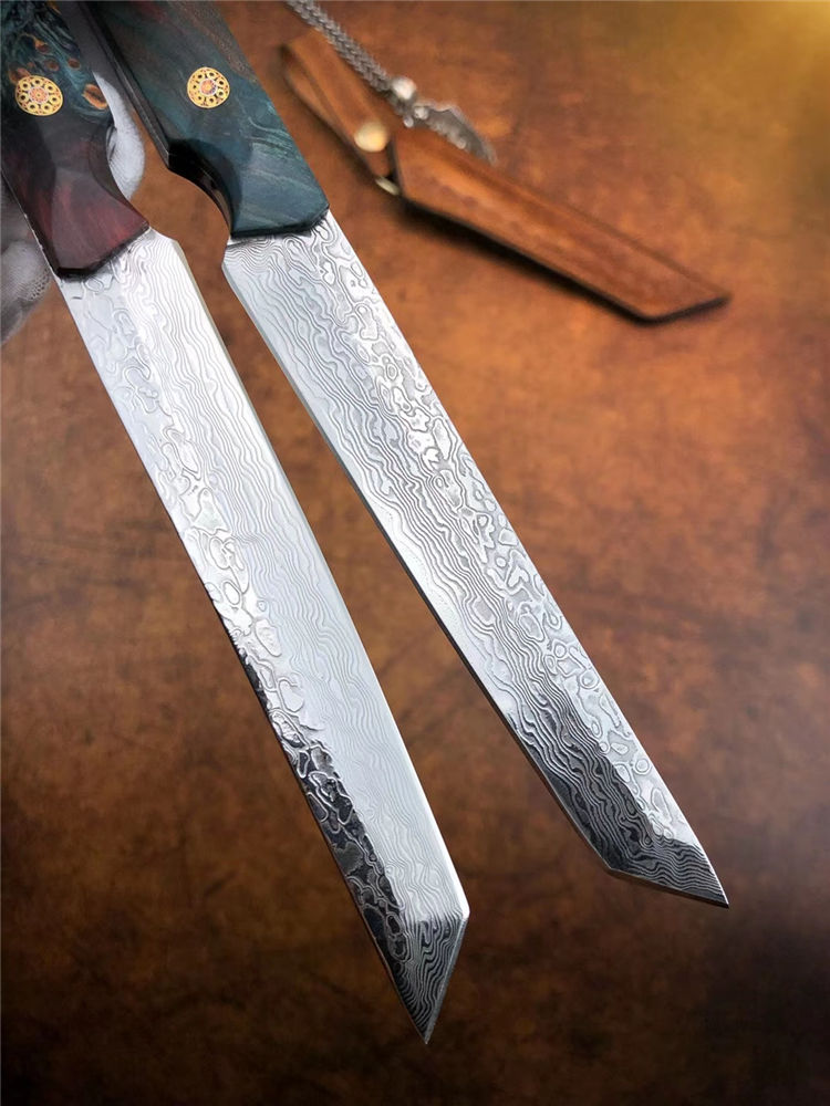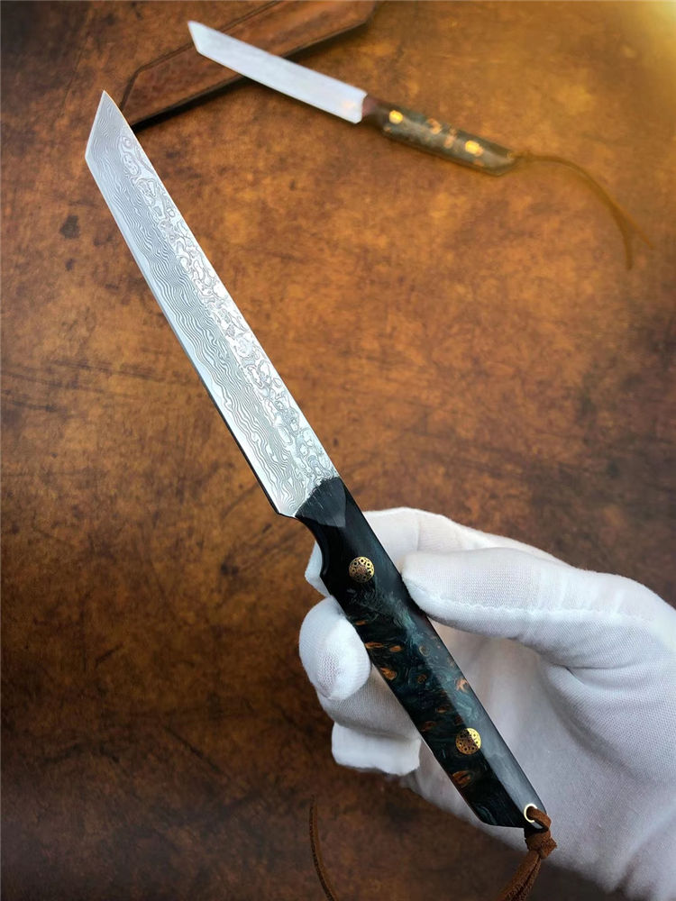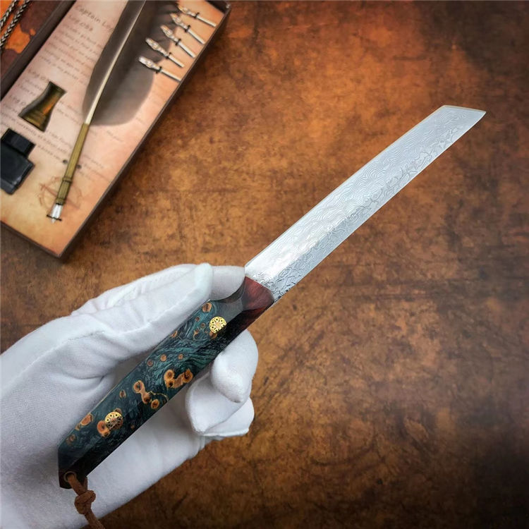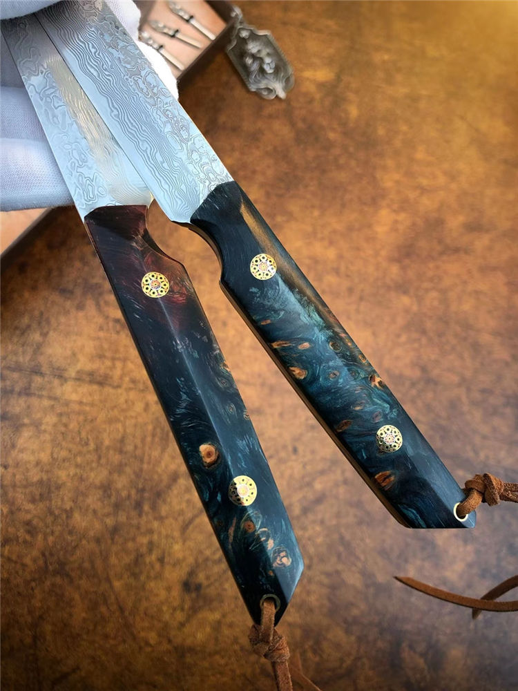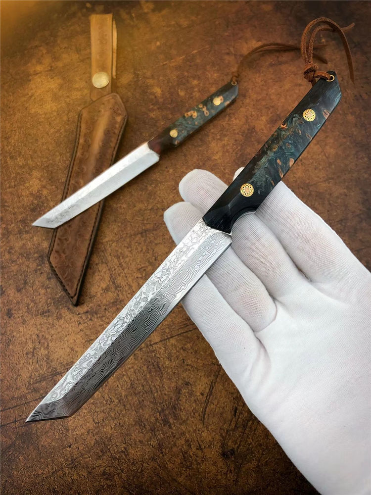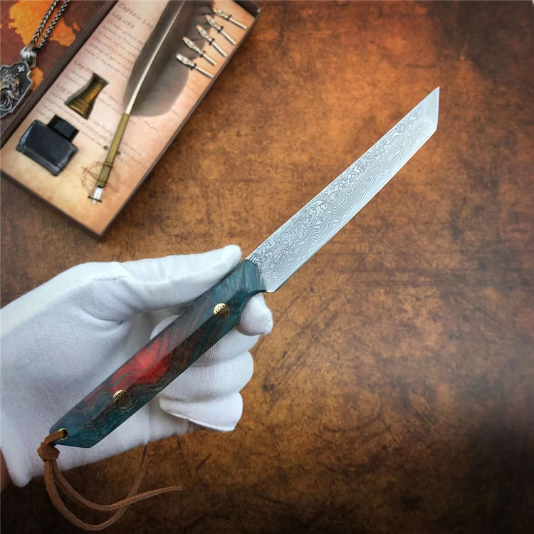 大马士革必杀武士直刀 总长:21.5cm 刃长:11cm 手柄:10.5cm 厚度:3.2mm 宽度:1.8cm 钢材:进口锻造一体龙骨大马士革钢 硬度:60-61HRC 手柄:稳定固化木材+马赛克柳丁 包装:手工盒
