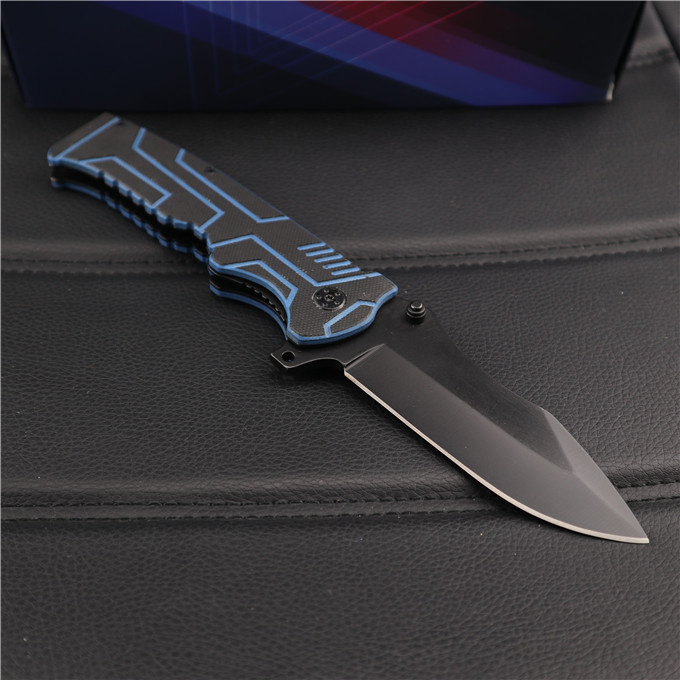 瓦尔特蓝黑部队折刀 全长:22.5cm 刀刃:9.6cm 刃厚:0.34cm 刃宽:2.7cm 柄长:12.7cm 硬度:58HRC 净重:173g 材料:5Cr13 柄材:黑蓝G10 锁型:侧锁 其他:高品质
