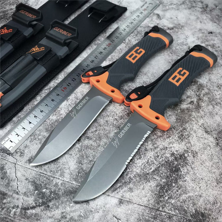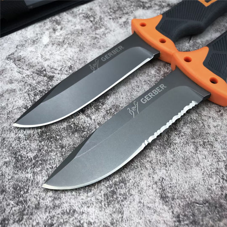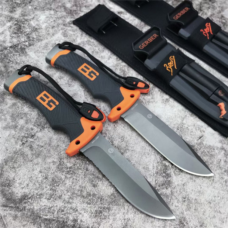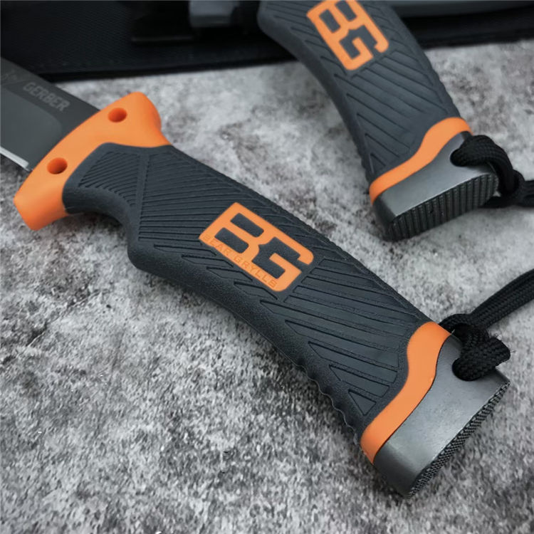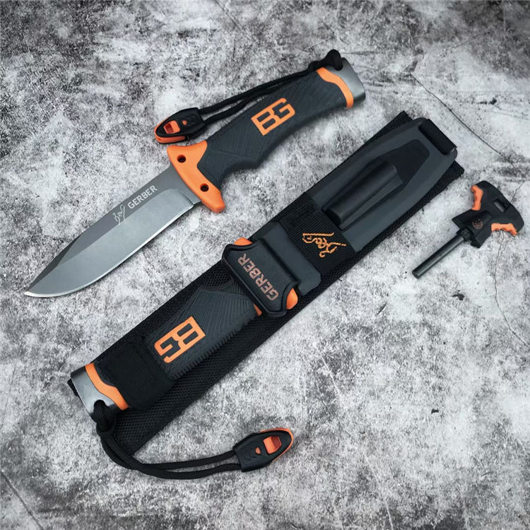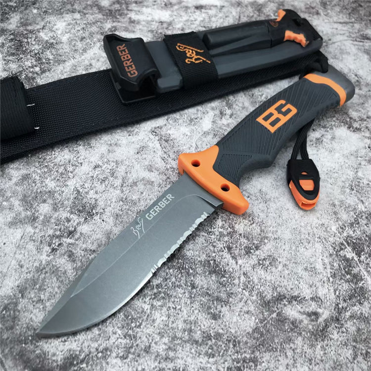 外贸版Gerber戈博贝尔荒野求生直刀 总长:27cm 刃长:12厘米 刃厚:0.5厘米 刀重:240g 毛重:450g 刃材:AUS-8A 硬度:59HRC 表面:钛离子 柄材:尼龙+工程塑料 刀鞘:ABS鞘 代工正品配件齐全:打火石金刚磨刀石刀绳救生口哨尼龙绑腿