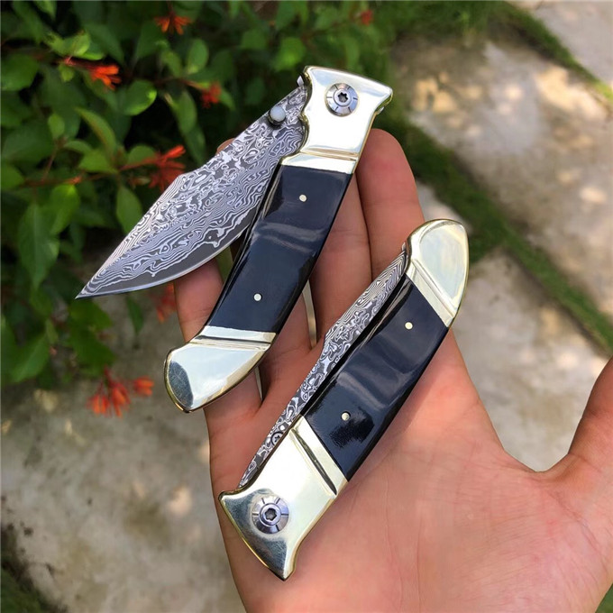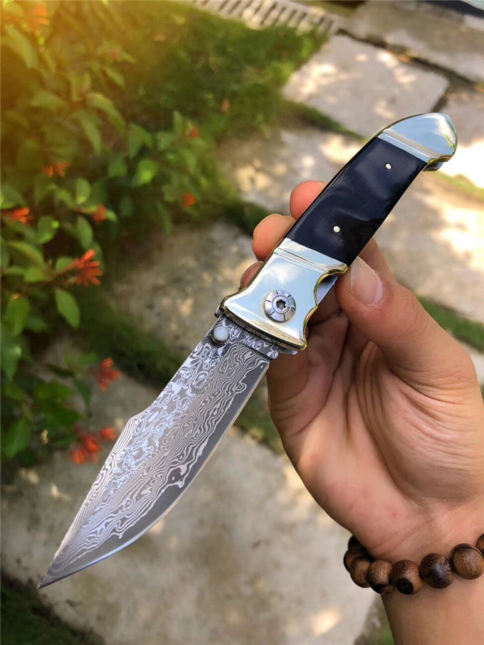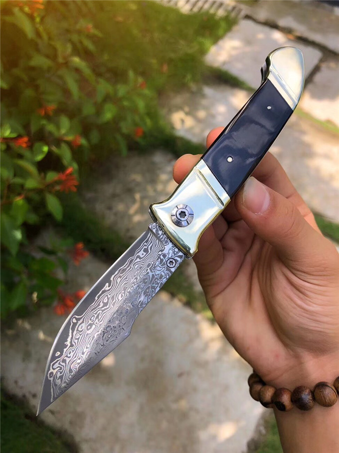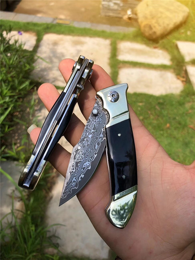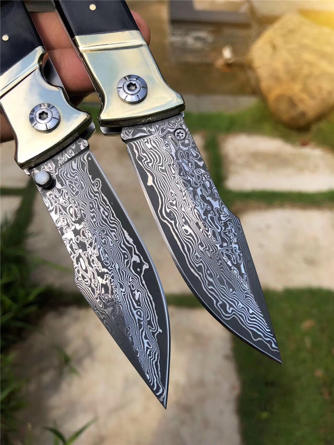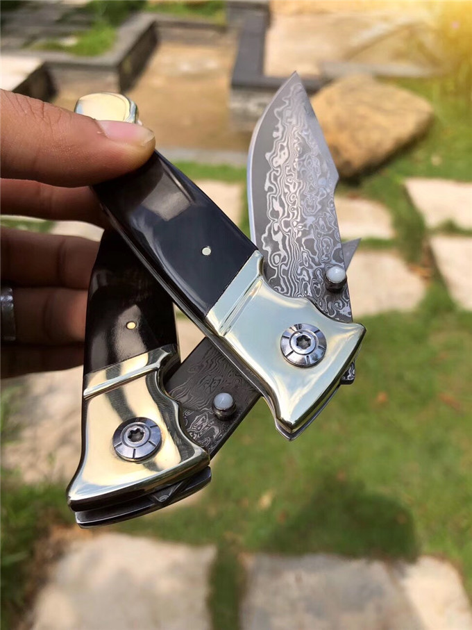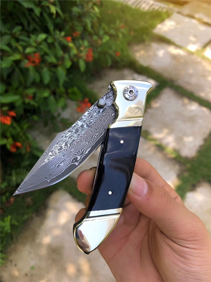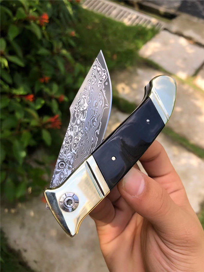 大马士革小牛艇折刀 全长:20cm 刃长:8.5cm 闭合:11.5cm 刃宽:2.5 刃厚:2.8mm 刃材:进口日本锻打大马士革VG10芯层钢 硬度:60HRC 柄材:实心纯黄铜+老料花牛角 内部结构:黄铜垫片 开刃方式:三次手工开刃 包装:保养油+出厂包装盒