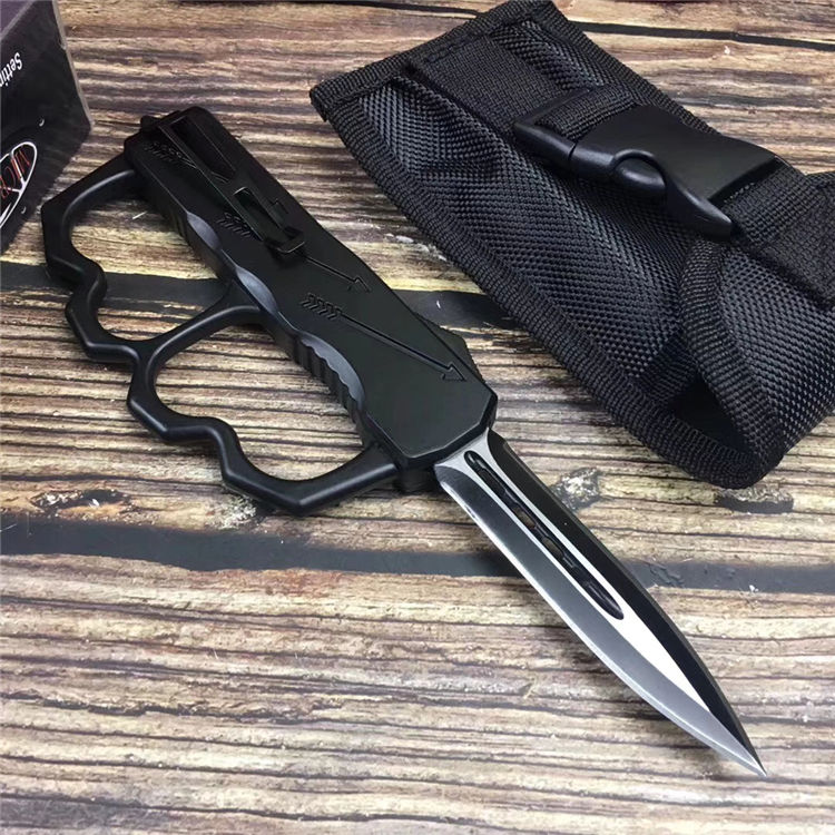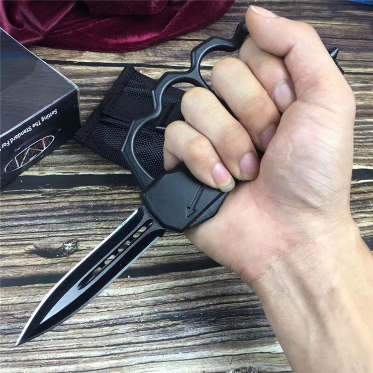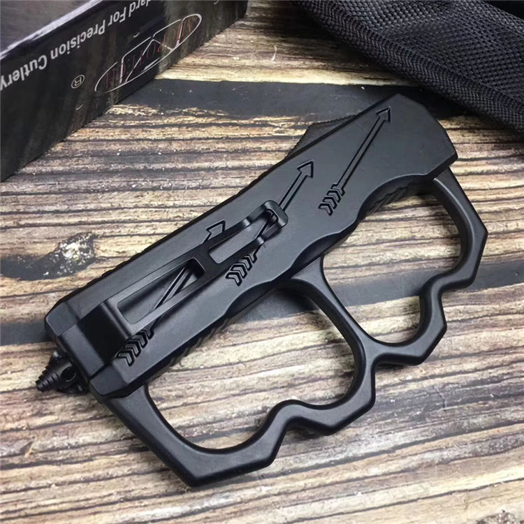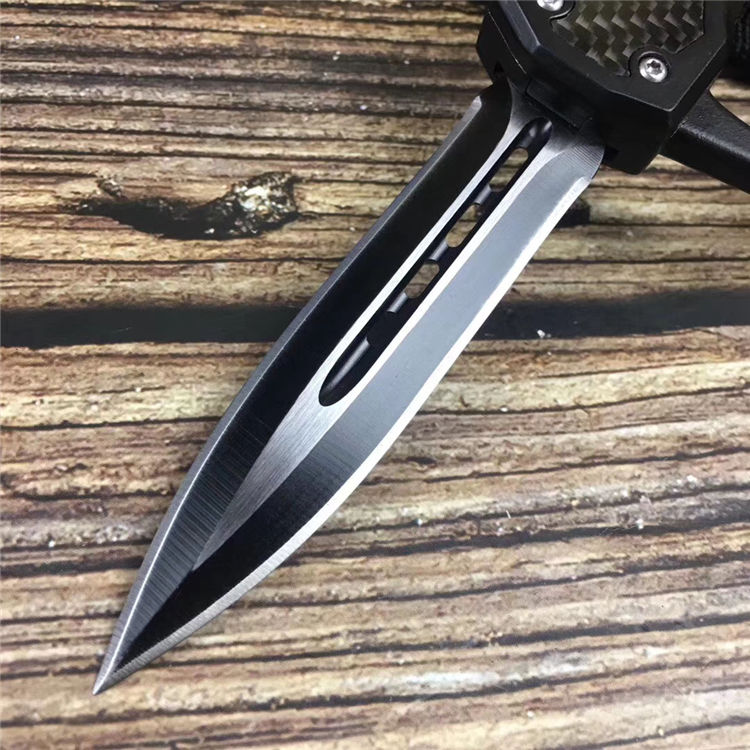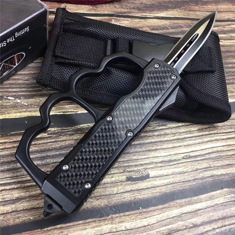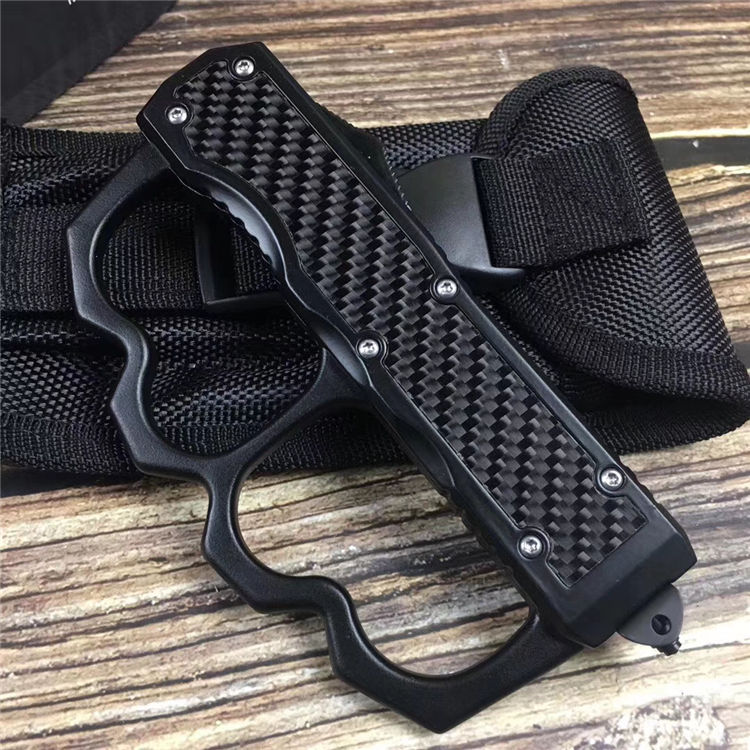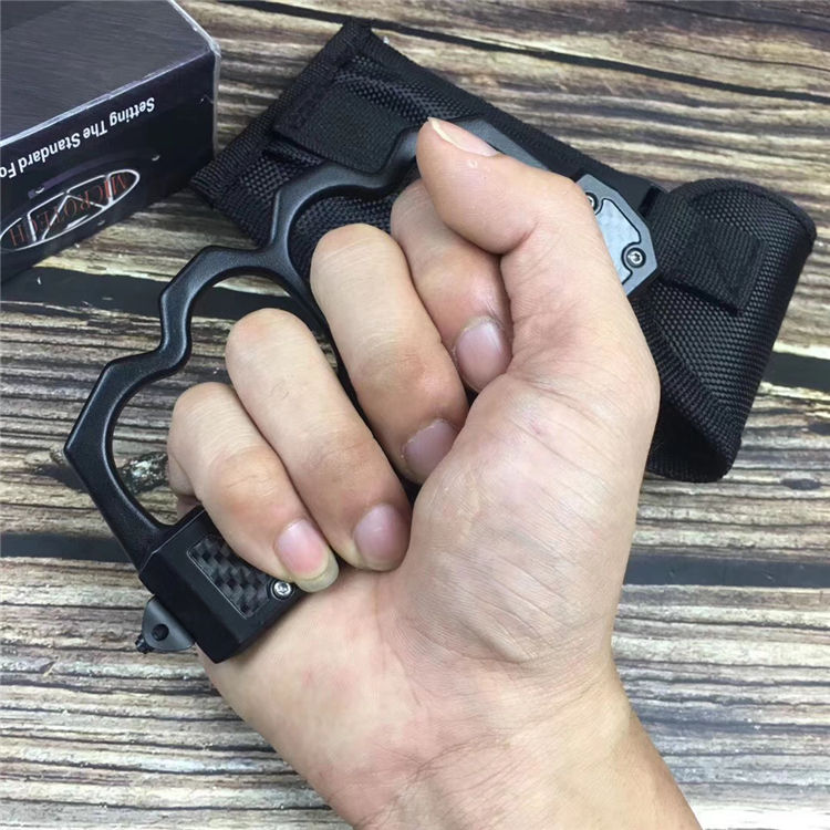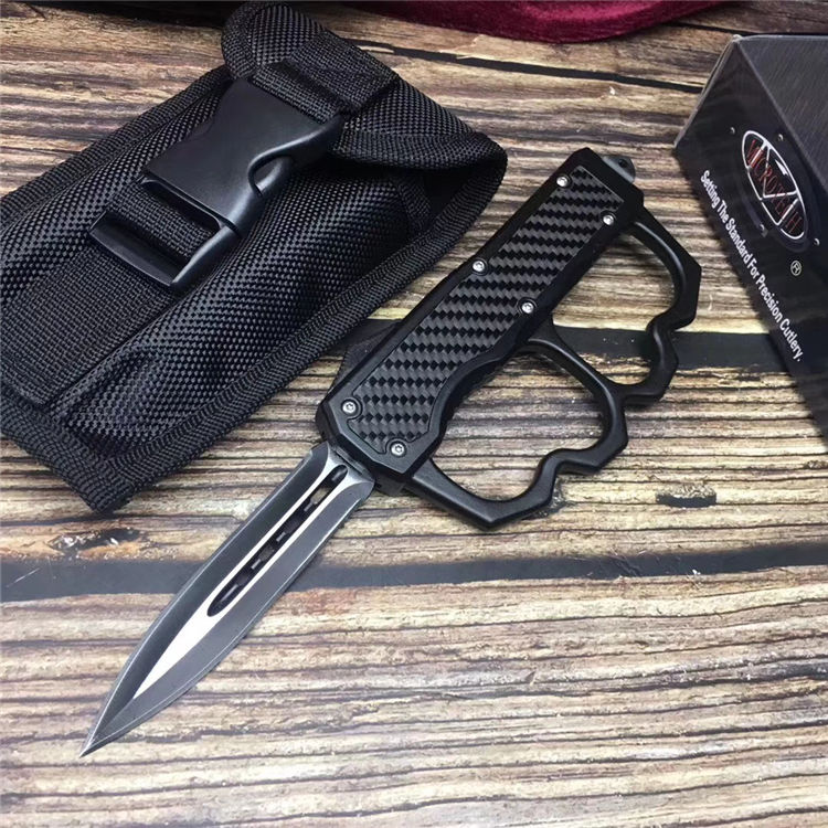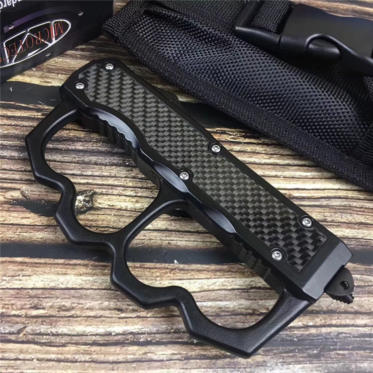 微技术拳套直出跳刀 全长:22.5cm 刃长:9cm 刃厚:2.1mm 刃材:440 硬度:57HRC 刀重:220g 毛重:340g 表面:氧化白 柄材:锌铝合金(碳纤) 刀鞘:尼龙 锁闭:直出弹簧+拳套