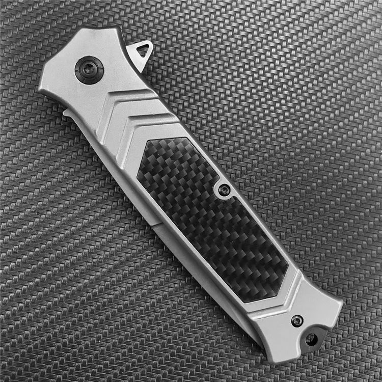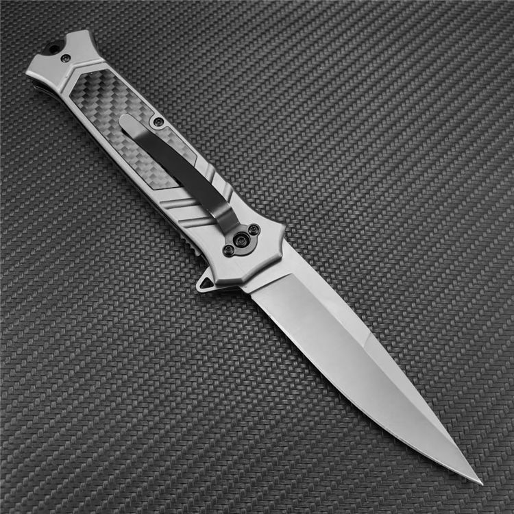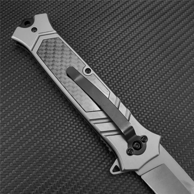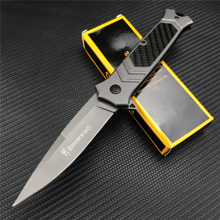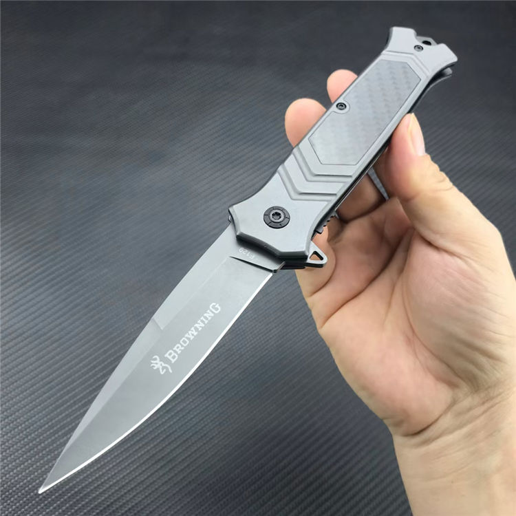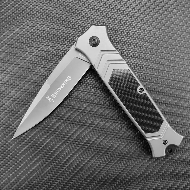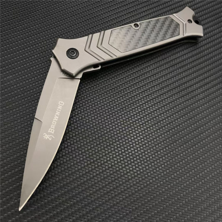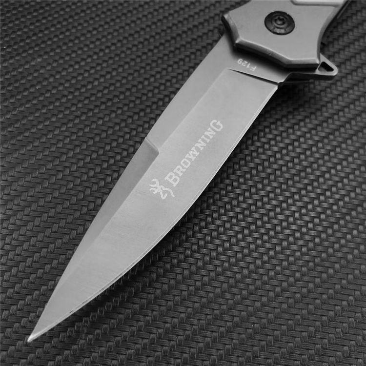 勃朗宁F129快开折刀 总长:22.5cm(含尾部) 刃长:9.5cm 柄长:13cm 刃宽:2.2cm(最宽处) 刃厚:3.0mm 刃材:5CR13MOV 硬度:58HRC 刀柄:全钢+G10 表面:灰钛 重量:221g含包装 配原厂包装