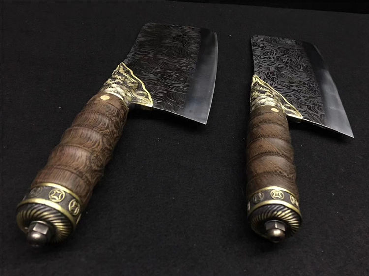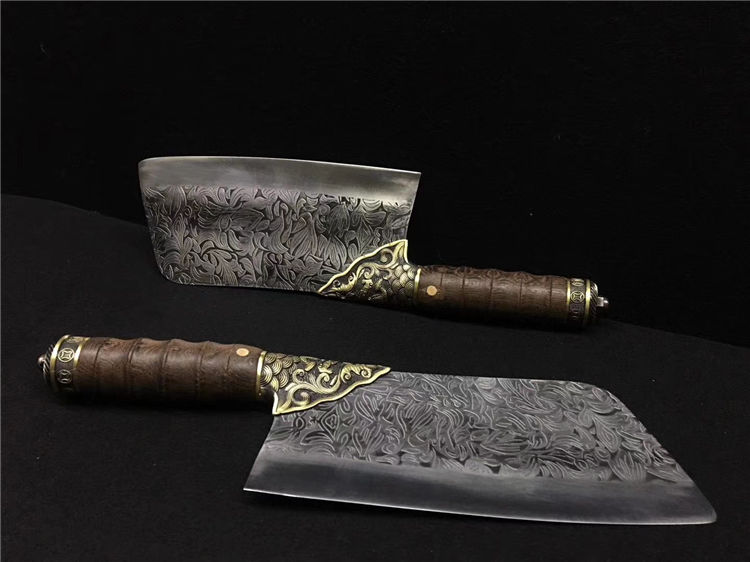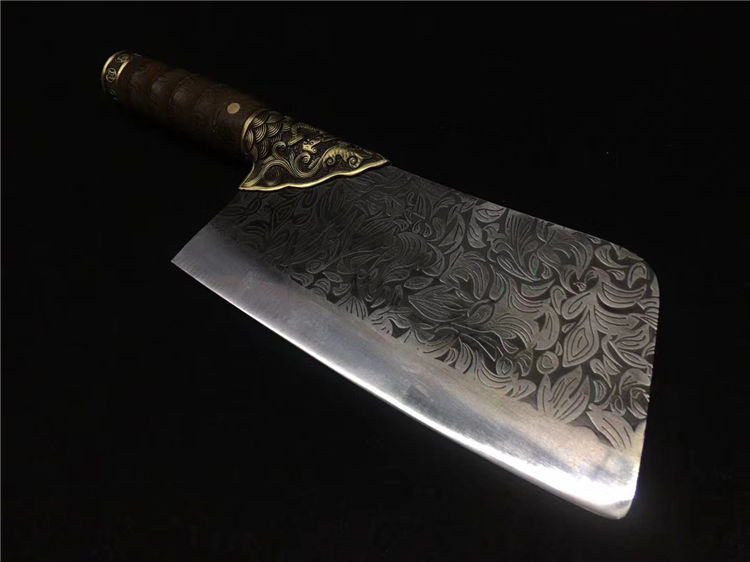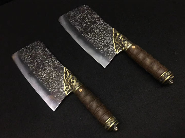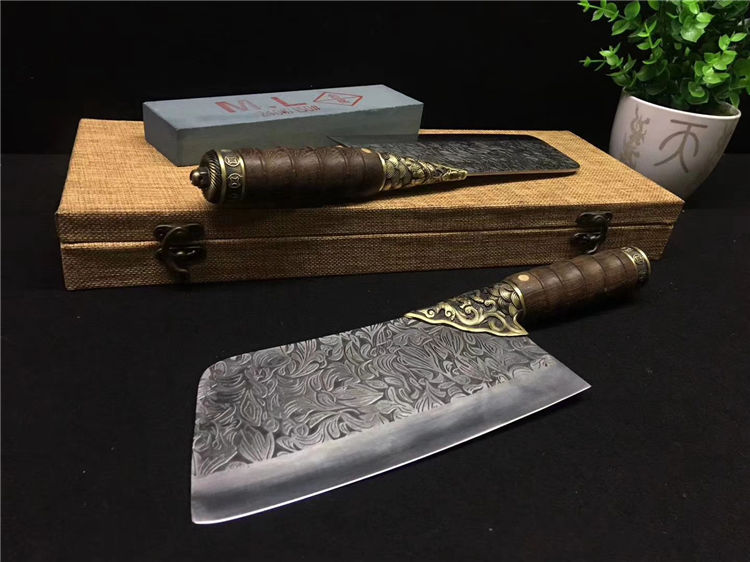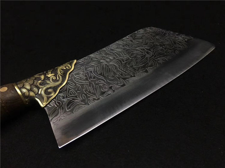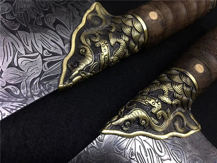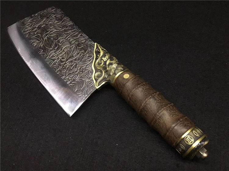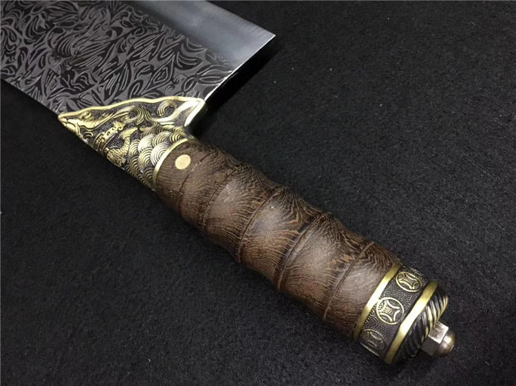 鲤鱼菜刀 全长:30cm 刃长:20cm 宽:9.0cm 厚:0.25cm 重:0.45kg 纯铜装精工处理不绣钢440工艺手工磨可切可砍