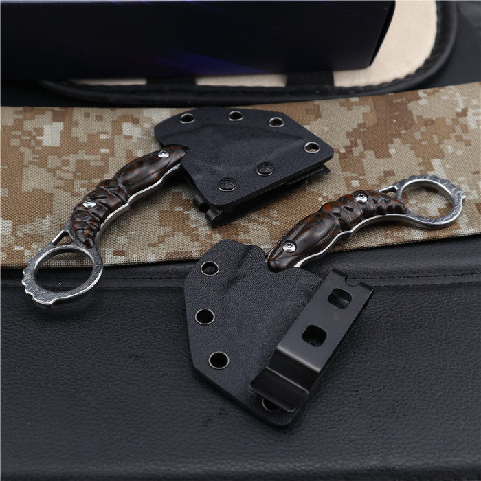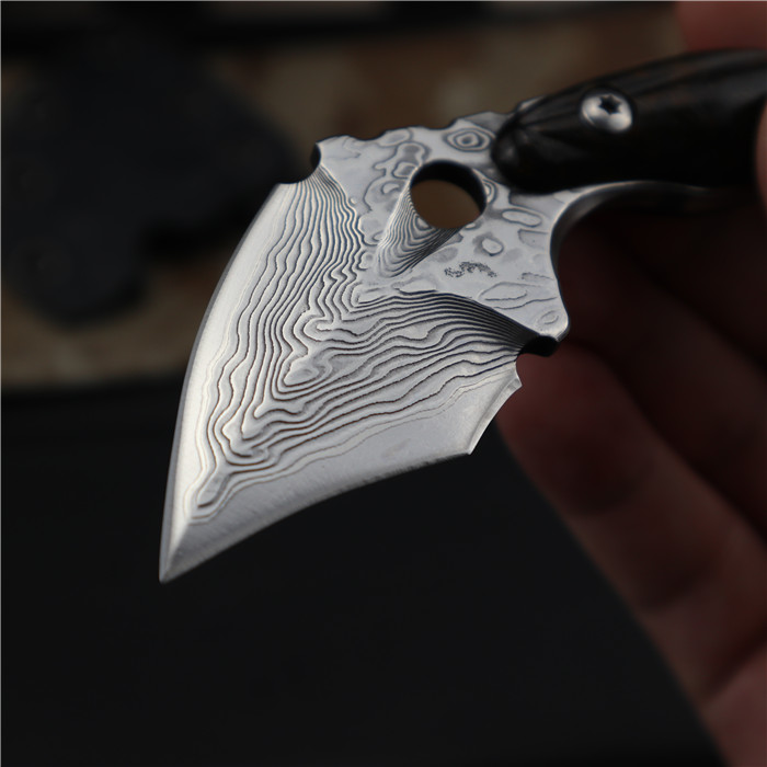 大马士革胡蜂莹光碳纤柄爪刀 全长:14.6CM 刃长:4CM 刃厚:0.5CM 刃宽:3.7CM 钢材:一体VG10大马士革钢 硬度:59-60HRC(真空油冷热处理) 表面:镜光 刀柄:莹光碳纤 柄厚:2CM 刀套:K鞘 重量:155g(含包装) 包装:黑色礼品盒