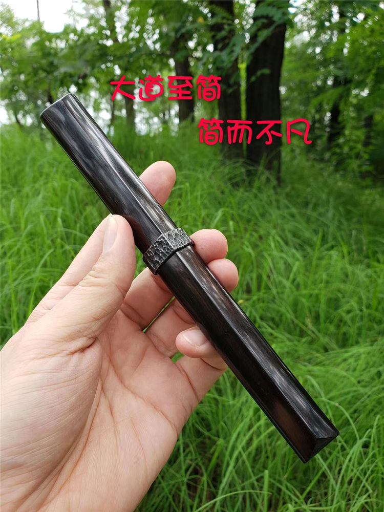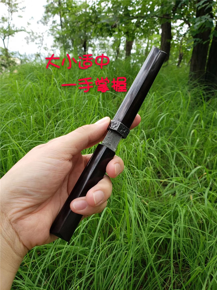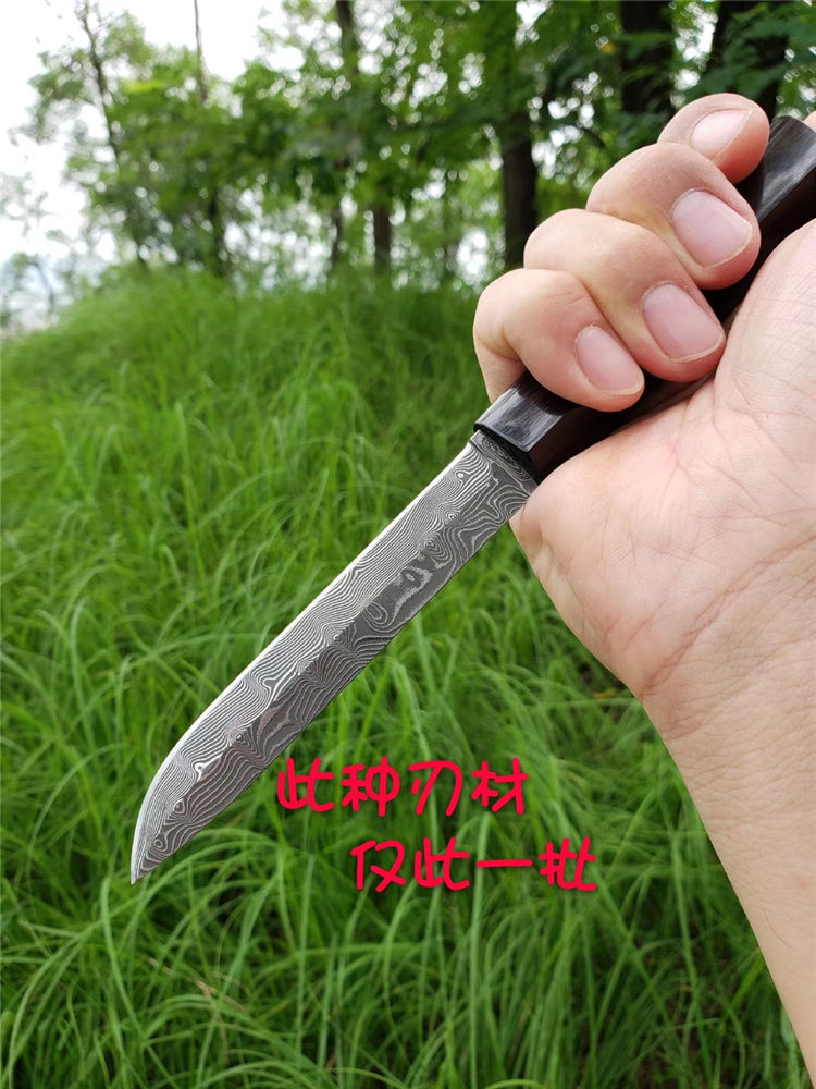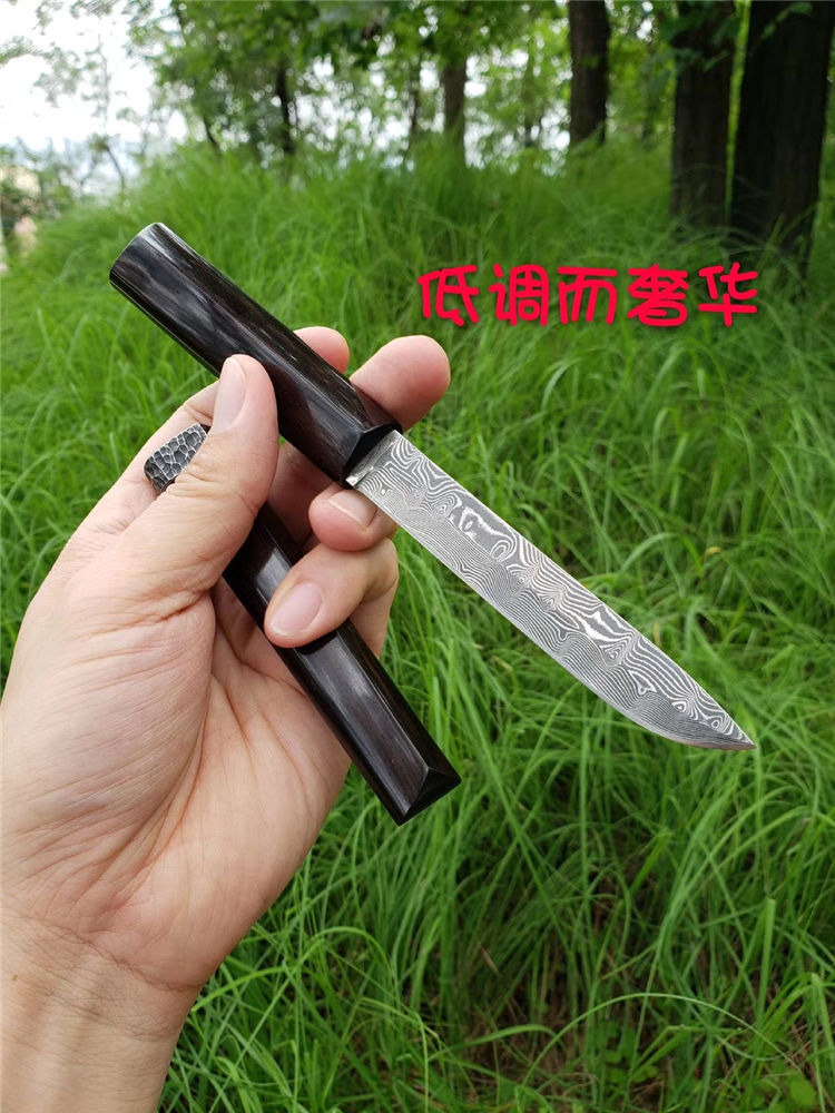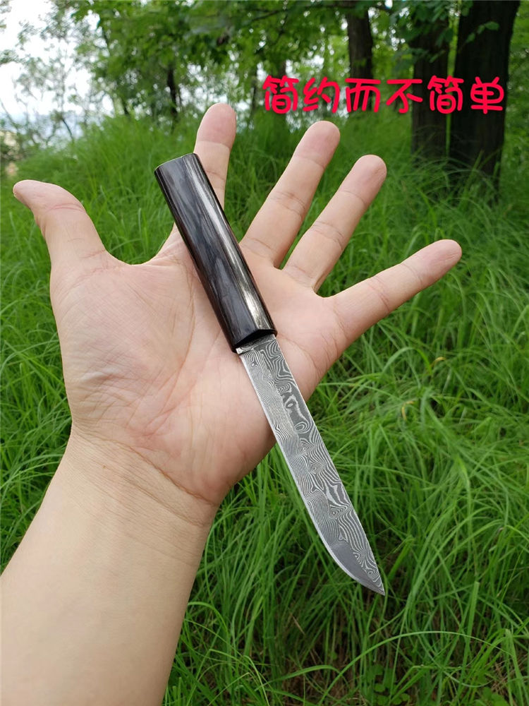 简师傅大马士革简武士直刀 全长:20.5CM 刃长:10.4CM 刃厚:3MM 刃宽:1.6CM 此款作品是简师傅对这句话完美的诠释,【简】外观简洁明了,细节之处却又与众不同,刀柄至刀鞘端由宽渐变而窄、由厚至薄,两端心形一线相连堪称点睛之笔。刀隔不锈钢手工雕刻陨石坑复古工艺,低调而又奢华。刀刃选用俄罗斯大马士革,花纹随性自然与众不同,精工开刃,锋利无比,刀鞘与刀柄精选老料黑檀木,复古礼盒包装