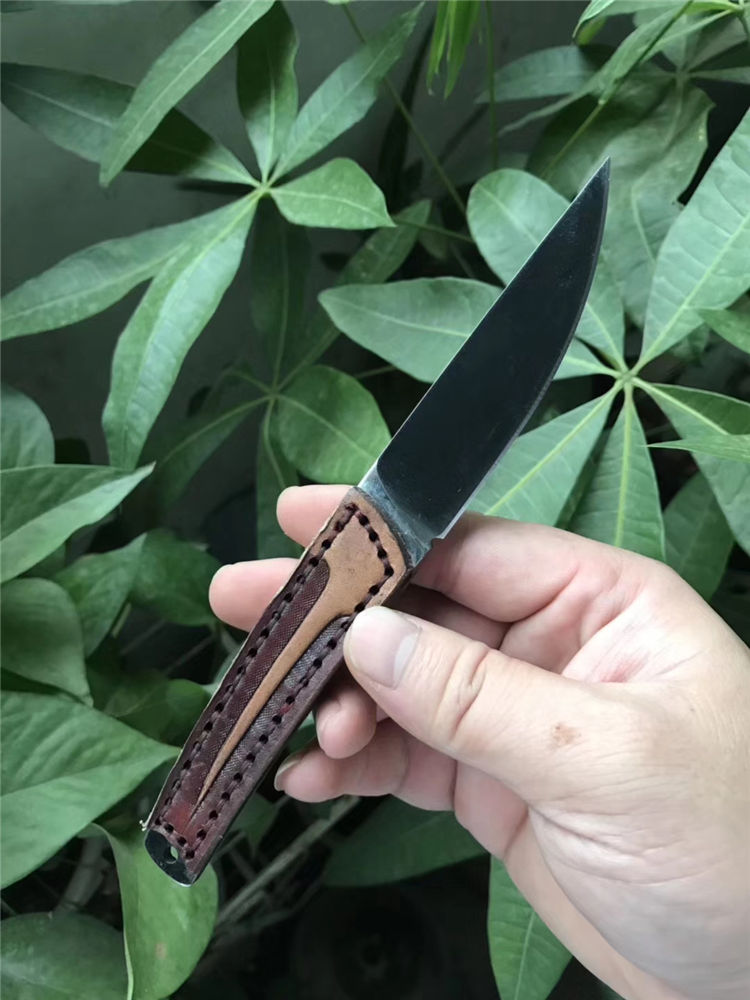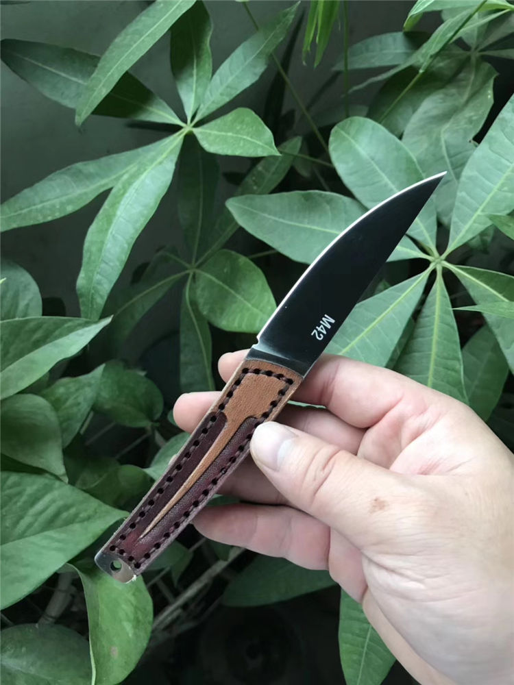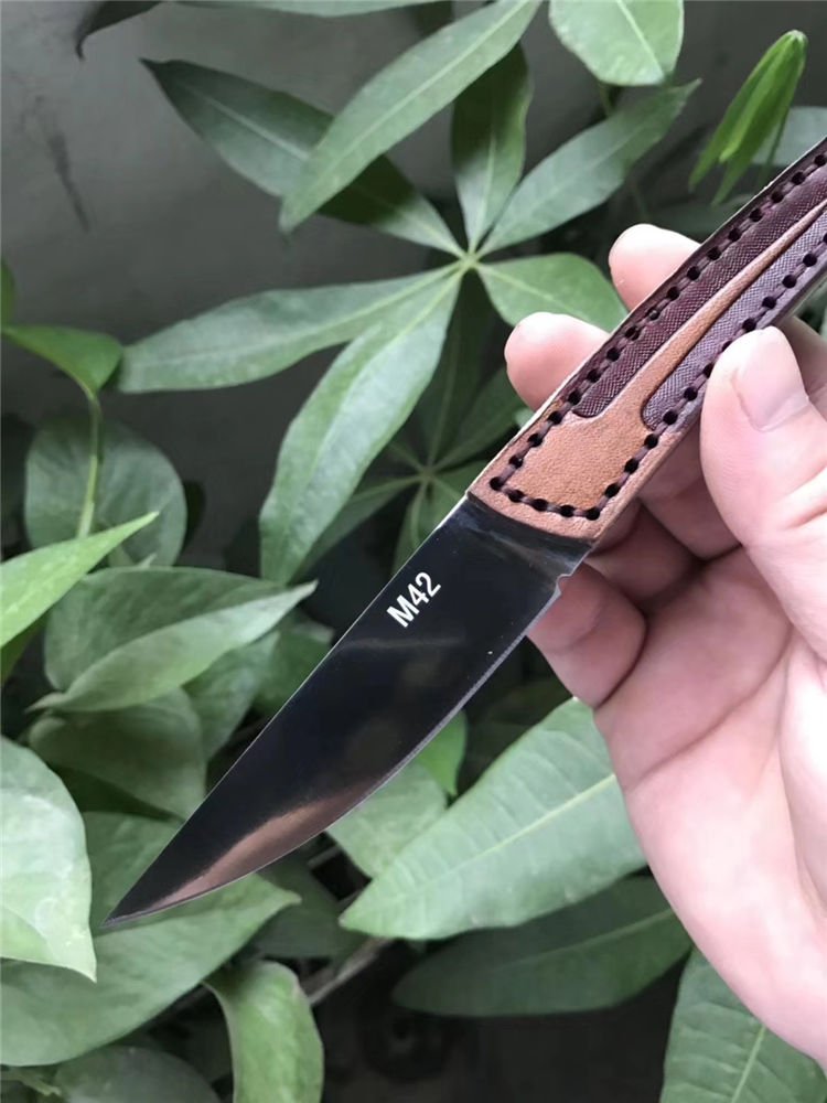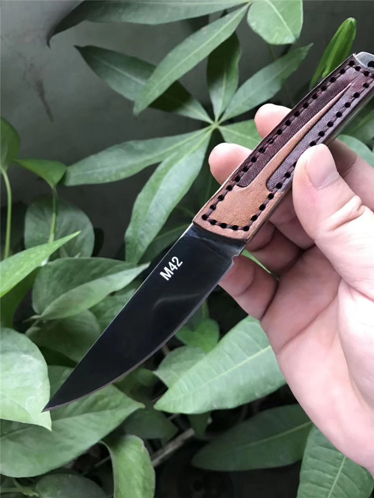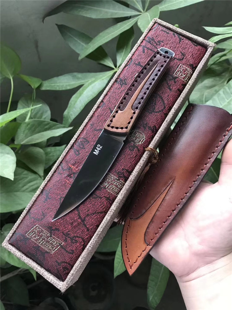 M42高硬度直刀 全长:180mm 刃长:90mm 刃厚:4左右 刃宽:22mm 硬度:65 手柄:牛皮雕花贴片 配礼盒,手工牛皮套