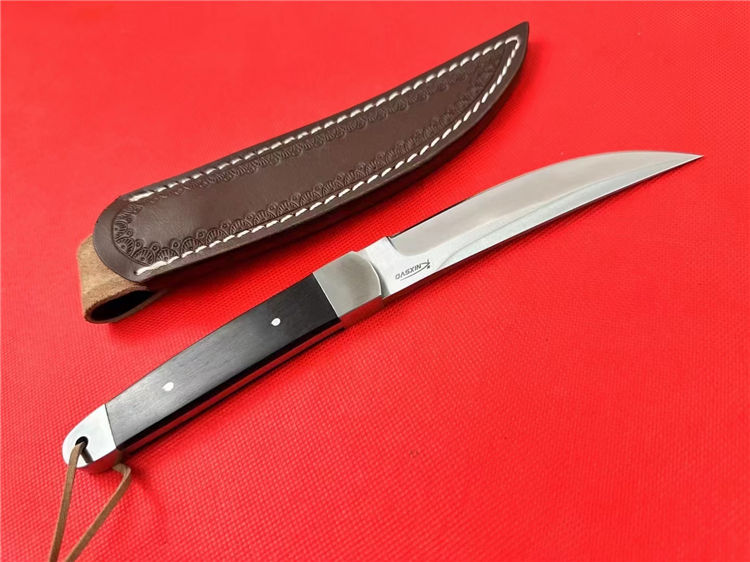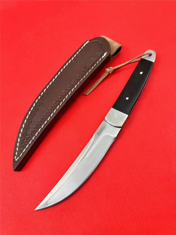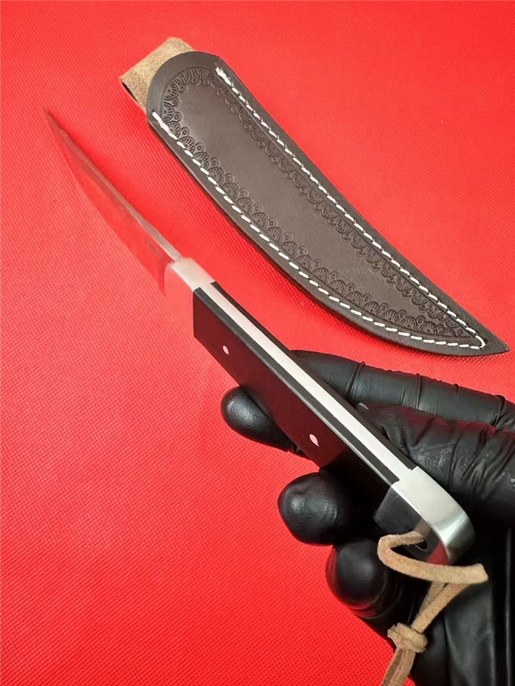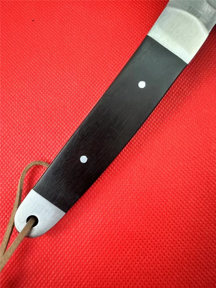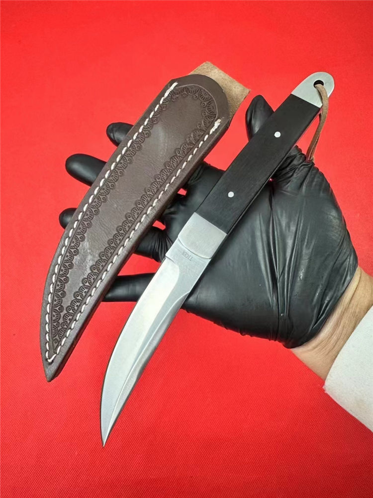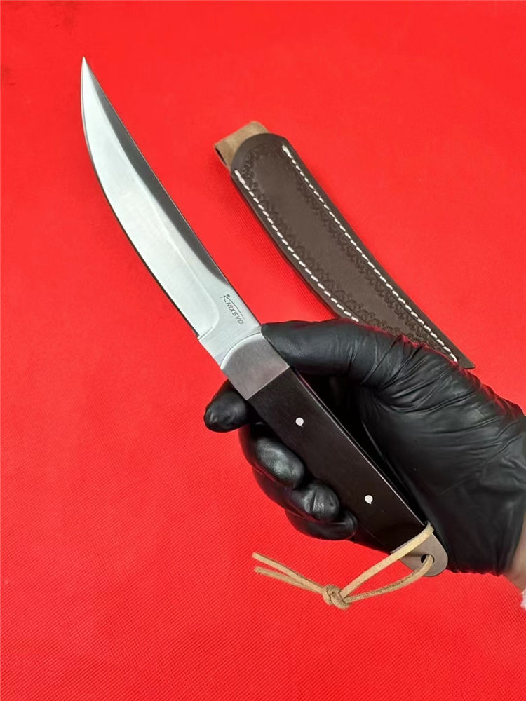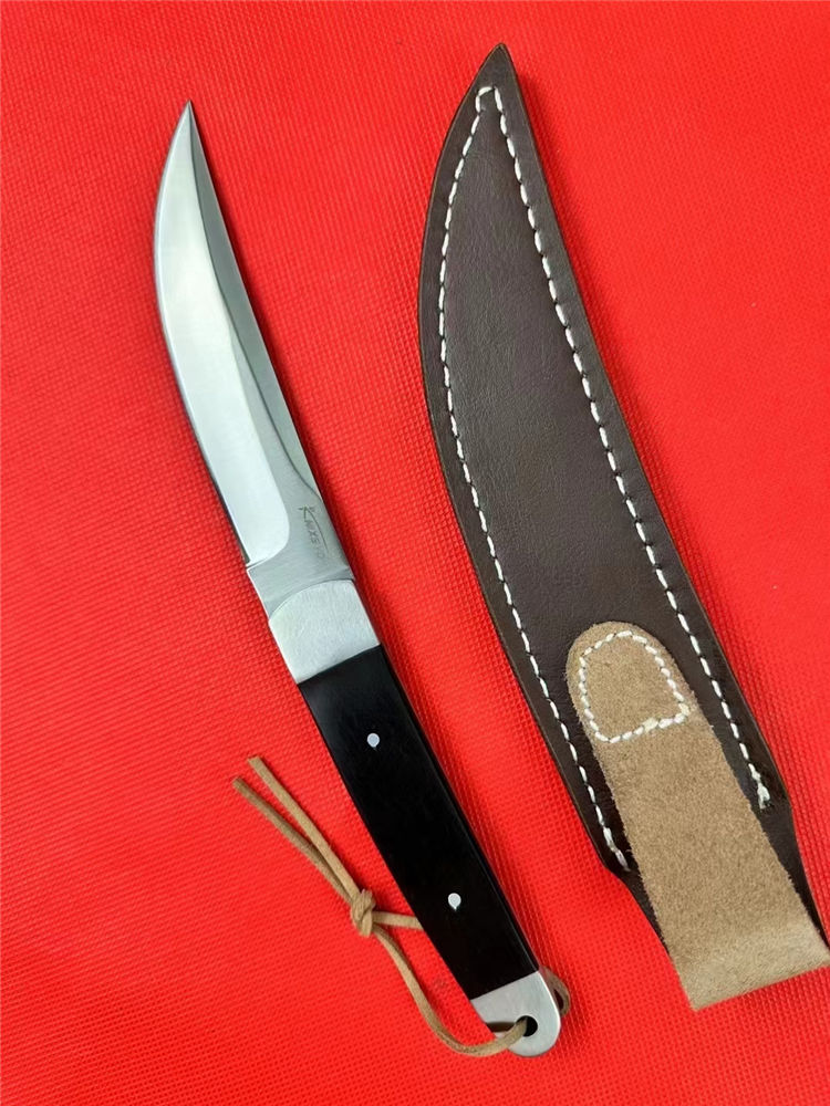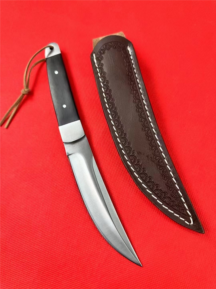 月牙狼直刀 全长:24.5cm 刃长:13cm 柄长:11.5cm 刃宽:2.5cm 刃厚:4mm 刃材:D2钢 柄材:黑檀木 硬度:59-60HRC 骨架:龙骨一体真空热处理 刀鞘:高端头层皮 重量:202g