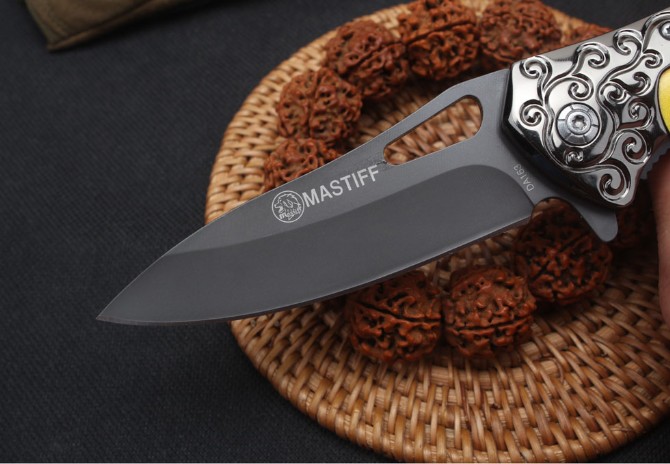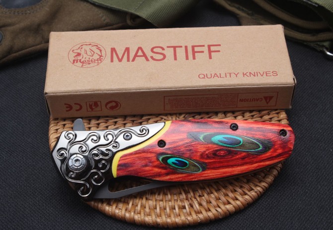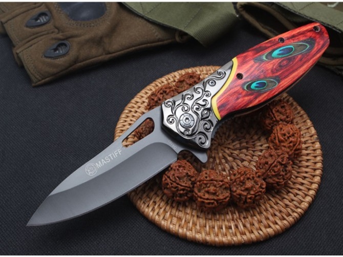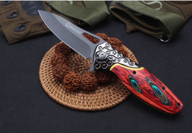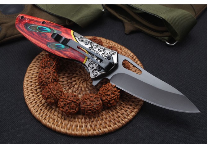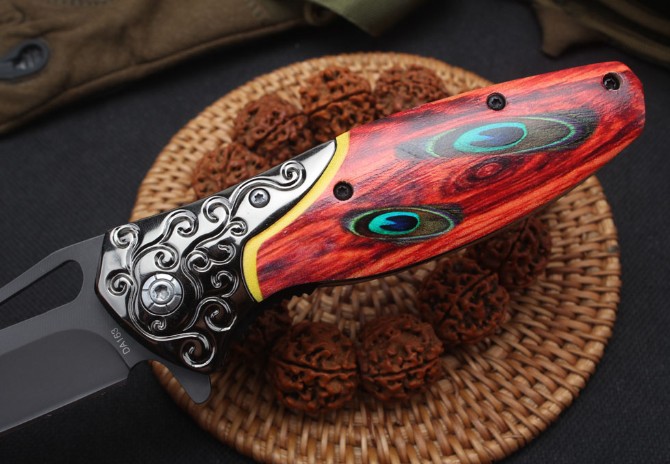 DA157快开折刀 全长:20.1cm 刃长:8.7cm 柄长:11.6cm 刃宽:3.0cm 刃厚:2.6mm 刃材:440 重量:128(含包装) 硬度:57HRC 表面:灰钛 柄材:雕花钢头+钢片+彩木+羽纹 锁型:线锁