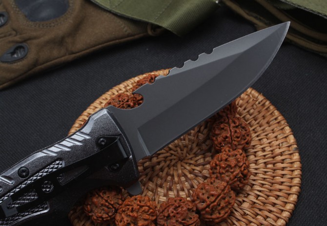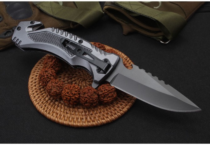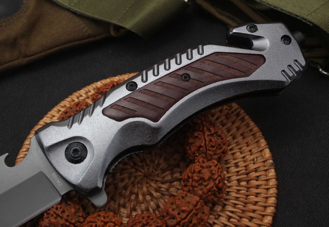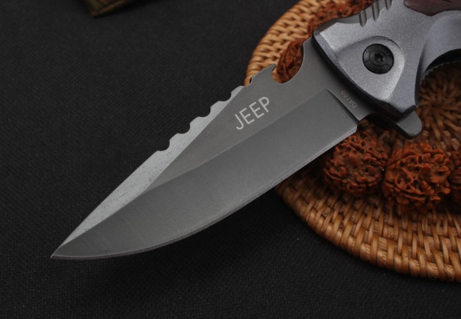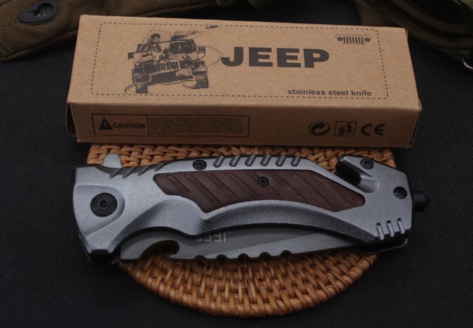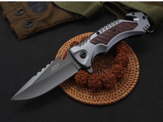 JEEP169快开折刀 全长:230mm 刃长:98mm 柄长:131mm 刃宽:30mm 刃厚:3.5mm 刃材:5C515Mov 重量:210g(含包装) 硬度:57HRC 表面:灰钛 柄材:钢柄+木 锁型:快开 其他:配彩盒