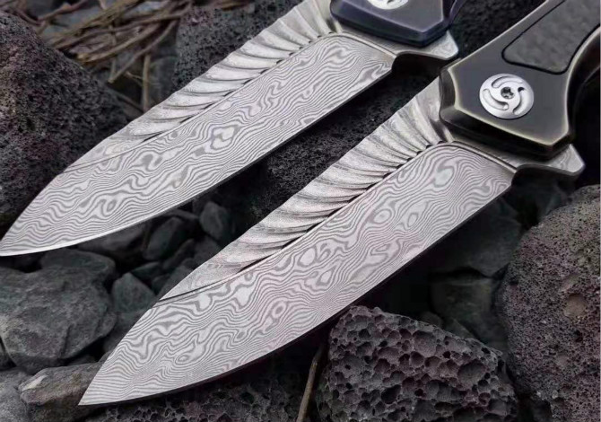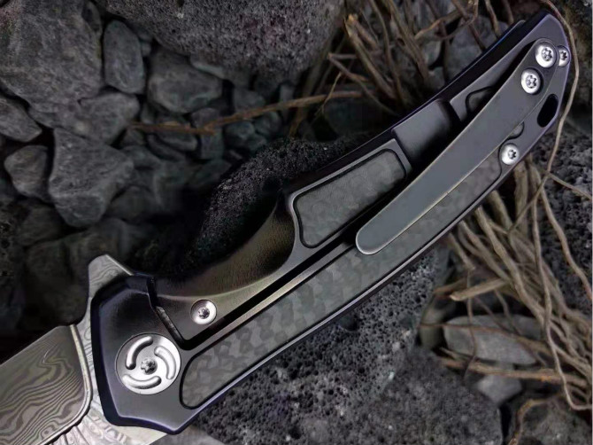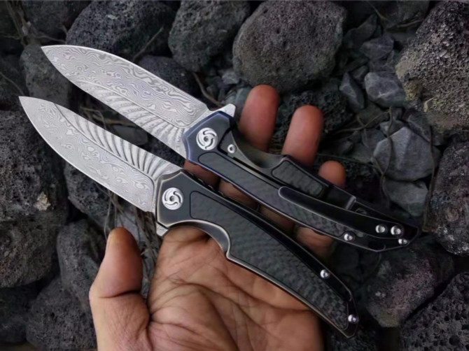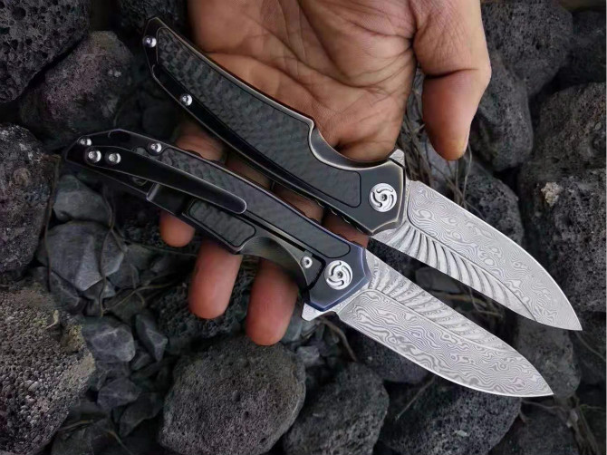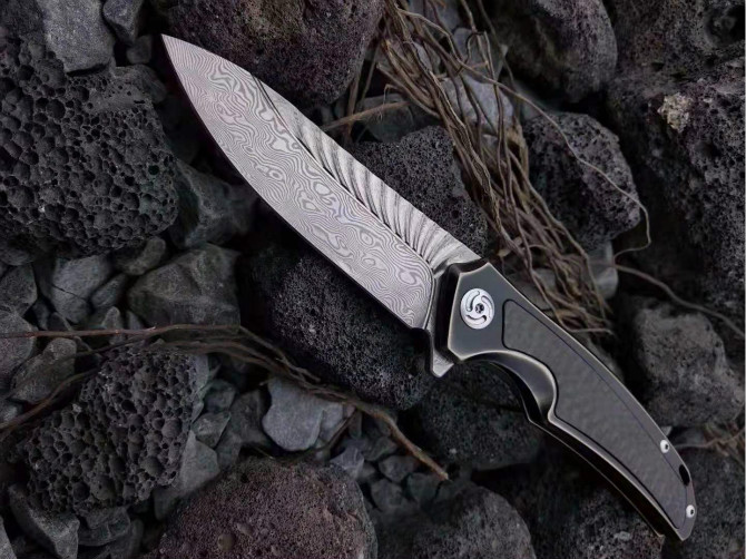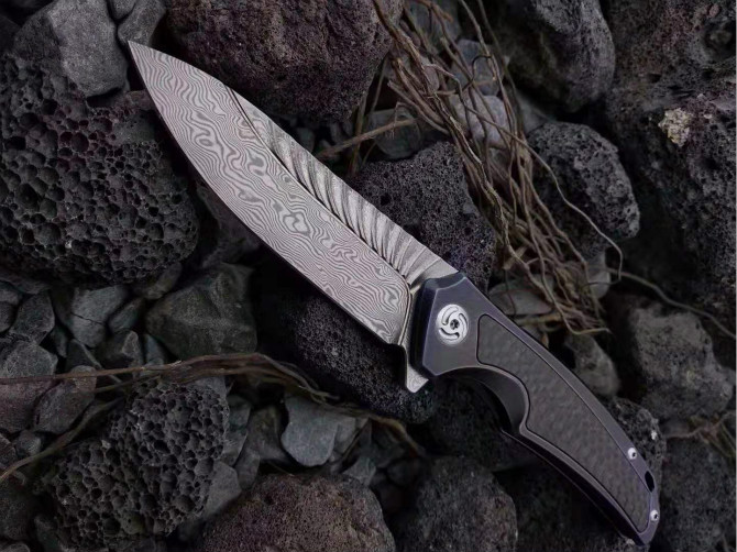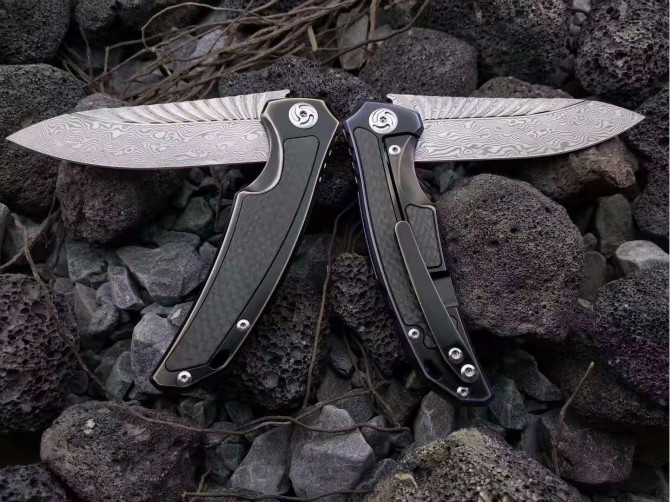 大马士革魔鬼之翼快开折刀 全长:195mm 刃长:86mm 刃厚:3.5mm 柄材:钛合金镶嵌碳纤维 刃材:千锤百炼折叠锻打大马士革钢 颜色分类:古铜款、变色龙款