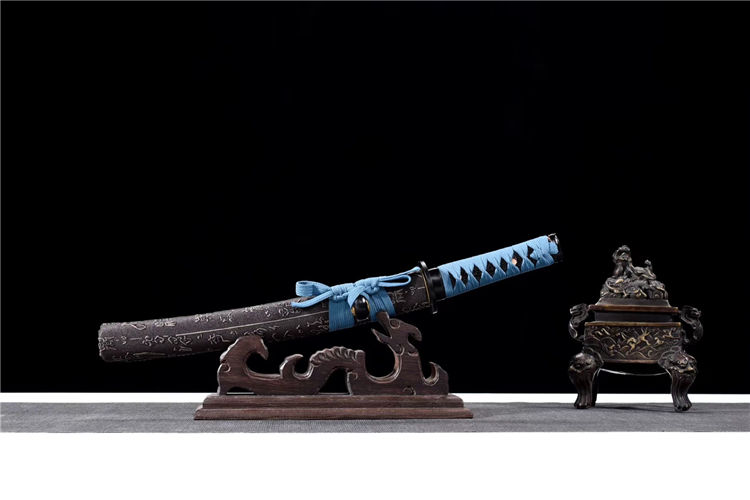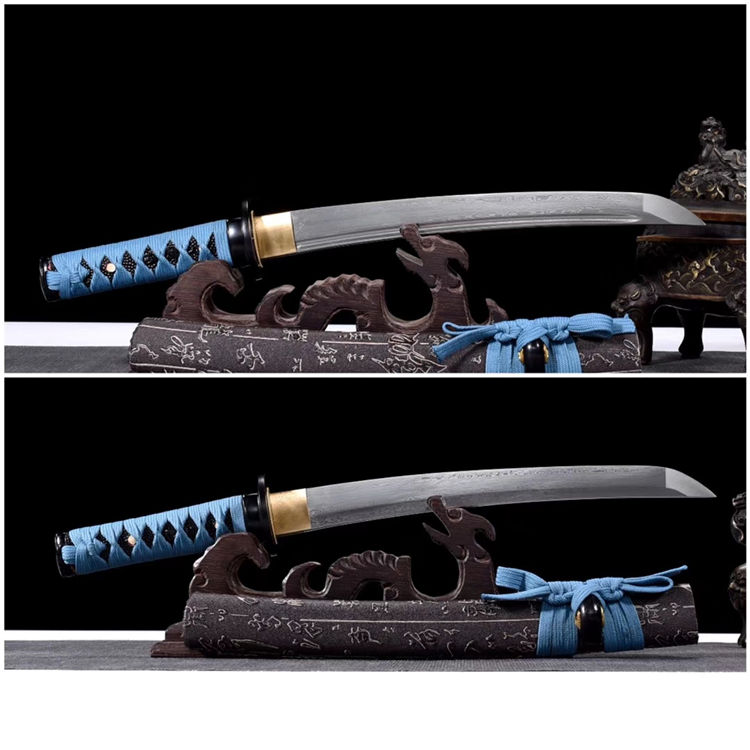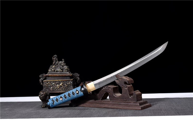 小武藏花纹钢版武士短刀 专业测试、请勿模仿 工艺:龙泉古法传统手工艺 装具:铁装 刃材:高性能花纹钢 柄材:实木绕绳 鞘材:实木漆鞘 赠品:锦盒、养护油、布