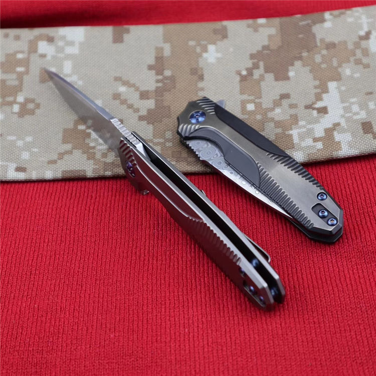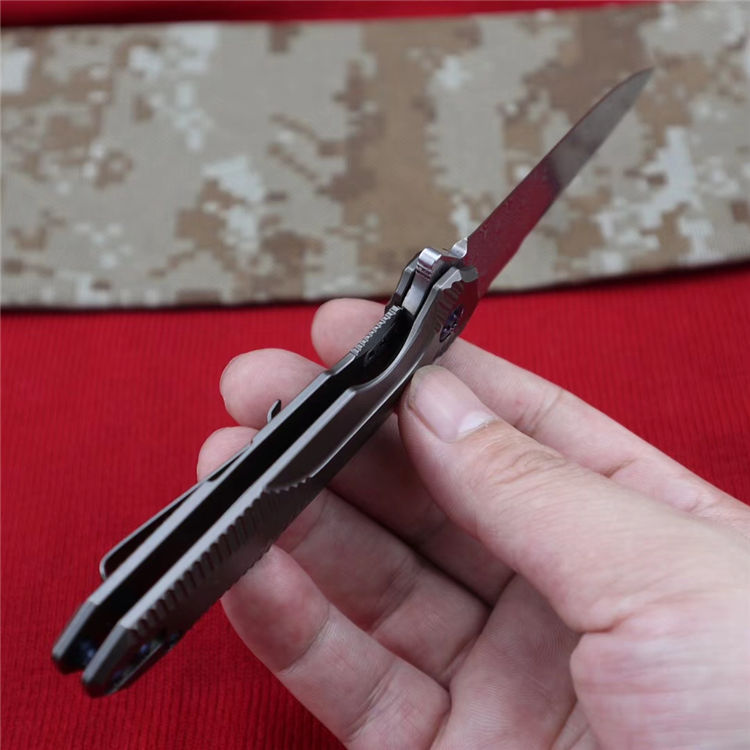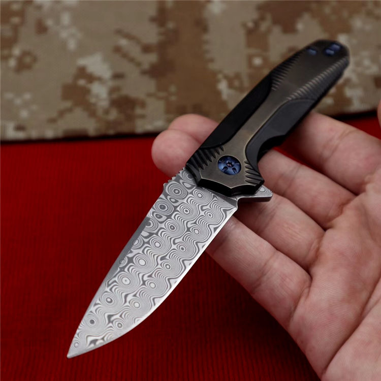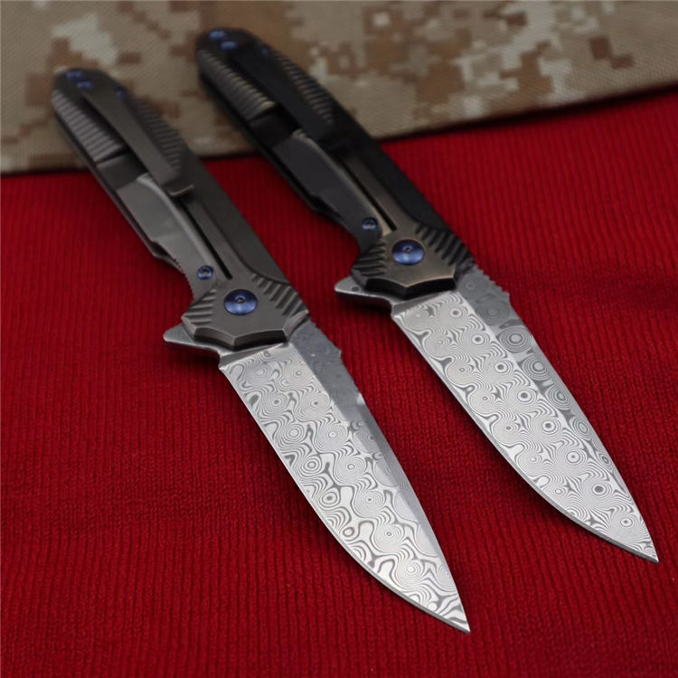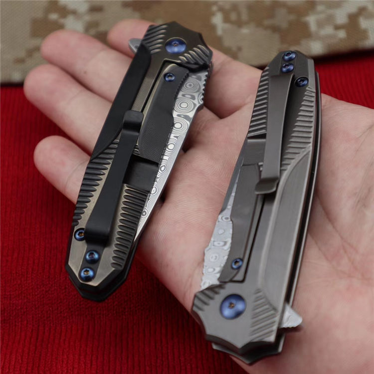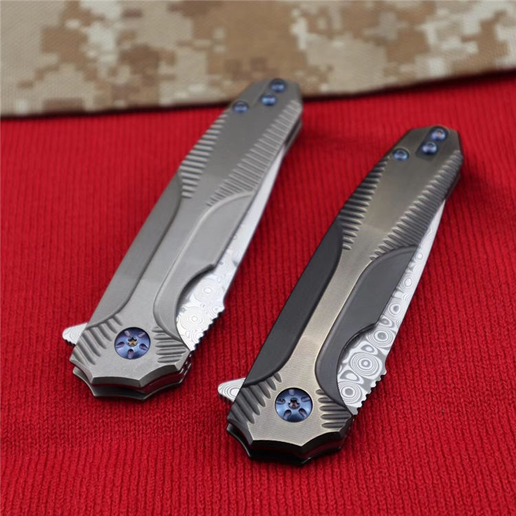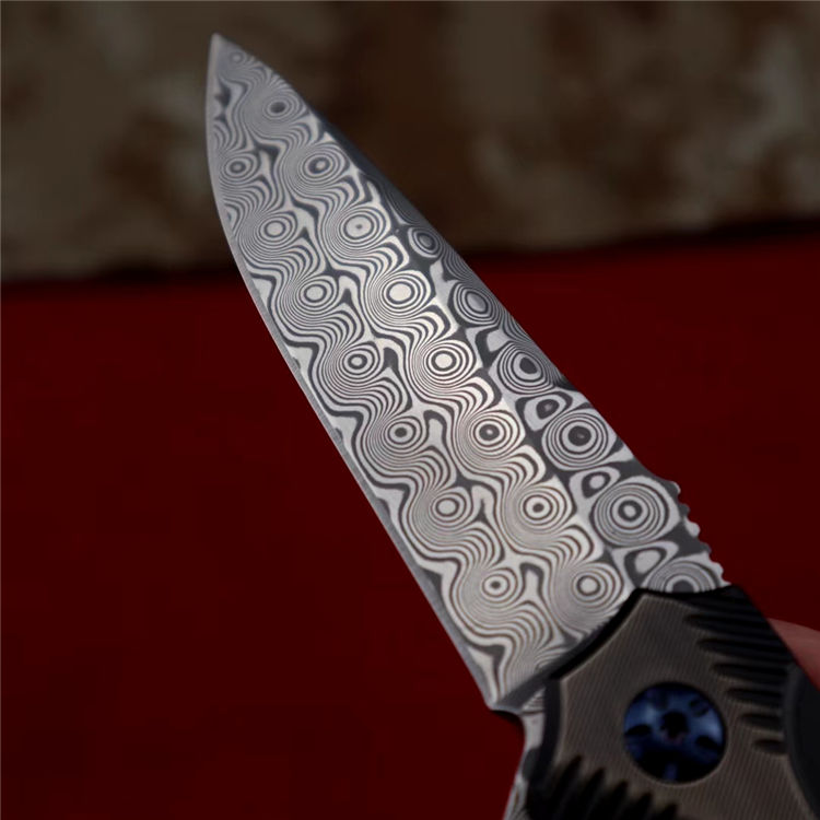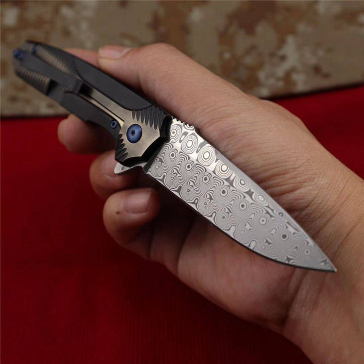 大马士革长风傲视者折刀 类型:轴承快开 总长:180mm 刃长:76mm 刀刃:进口大马士革 硬度: 60º±1ºHRC 刃厚:3.0mm 表面:指纹花纹 手柄内衬:2.0mm不锈钢减重内片 手柄:TC4钛合金 重量:91g