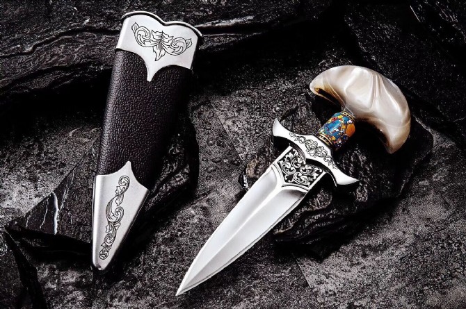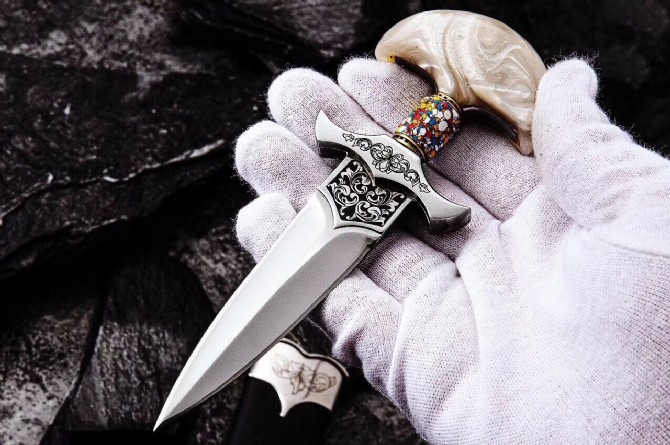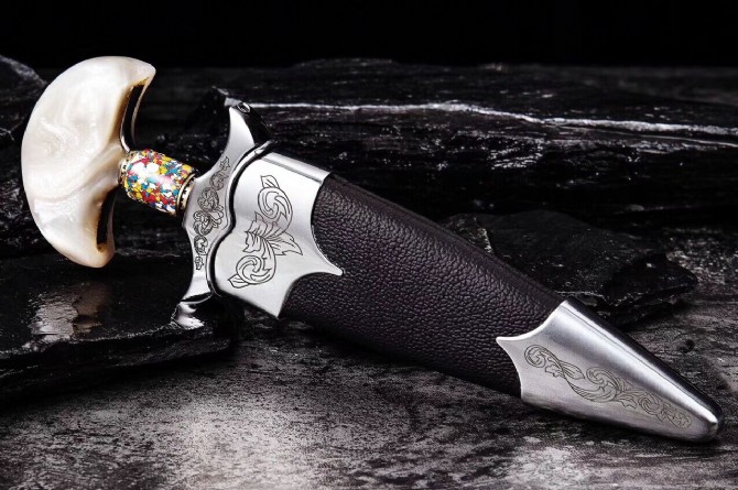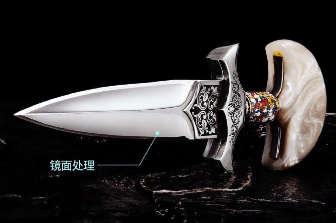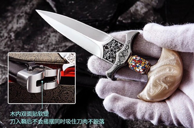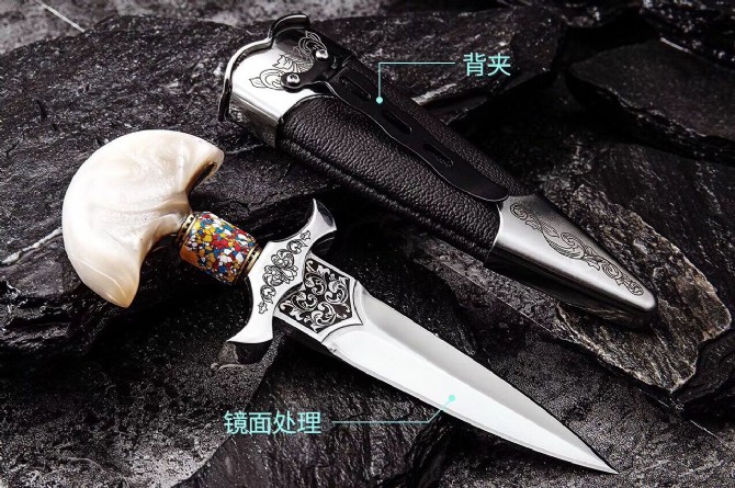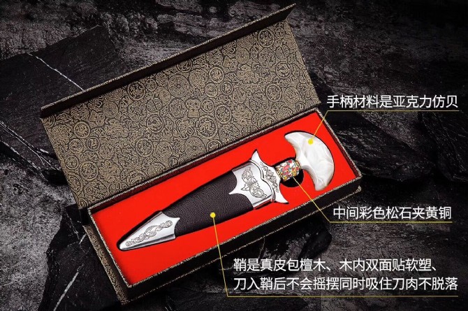 其他:手柄材料是亚克力仿贝,中间彩色松石夹黄铜完美组合,鞘是手刺之中最新设计,真皮包檀木而且木内双面贴软塑,刀入鞘后不会摇摆同时吸住刀刃不脱落,刀面是镜面处理,带背夹仔很值得收藏的一把手刺来的