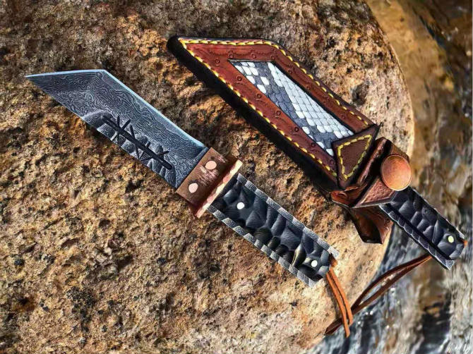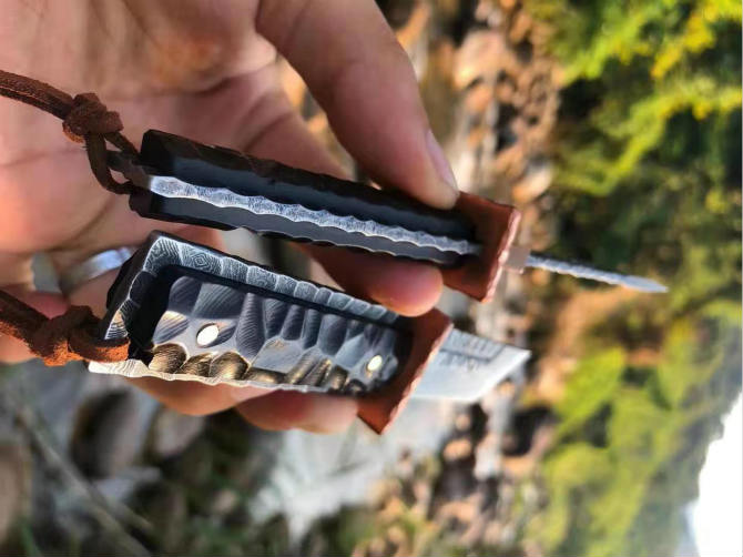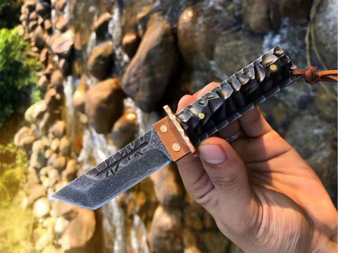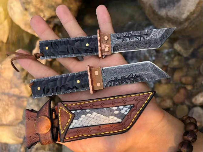 大马士革般若复古小武士刀 总长:15cm 刃长:7cm 手柄:8cm 厚度:3mm 刃宽:4.1cm 钢材:进口锻造大马士革一体钢 硬度:60HRC 热处理:高温真空热处理 开刃方式:手工三道研磨工序 柄材:紫铜护手+雕刻黑檀木 包装:复古皮套+手工小盒 皮套:进口意大利植鞣革皮纯手工雕花镶嵌蛇皮刀套