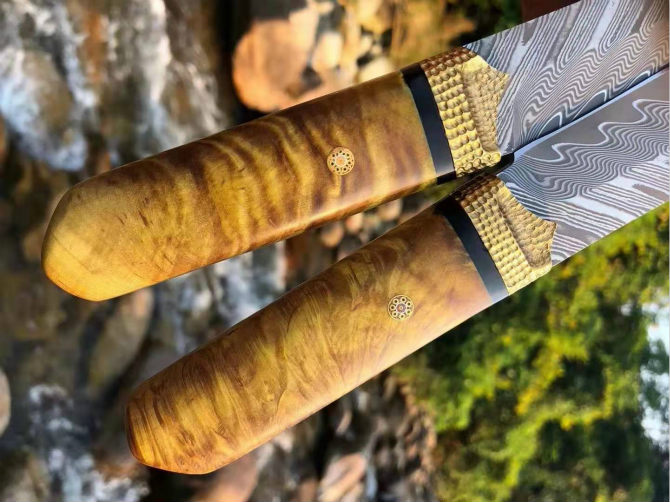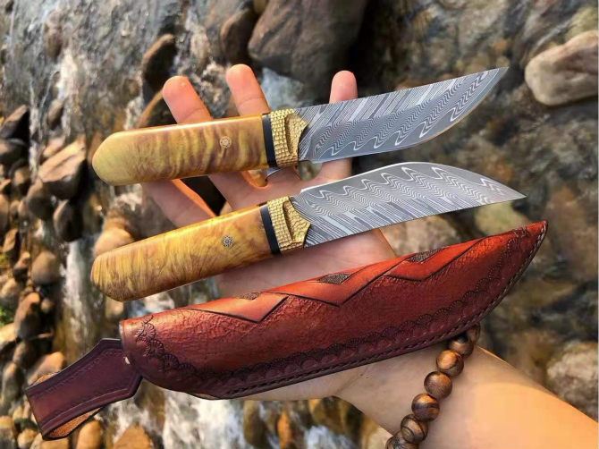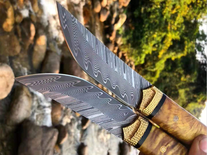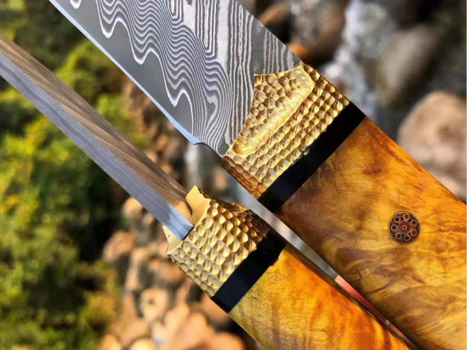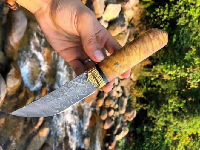 大马士革罗兰武士刀 全长:22cm 刃长:10.2cm 手柄:11.8cm 厚度:3.5mm 刃宽:2.9cm 钢材:进口锻造大马士革钢 硬度:60HRC 热处理:高温真空热处理 开刃方式:纯手工三道研磨 柄材:纯黄铜镶嵌+进口金丝楠木, 皮套:意大利进口植鞣革皮手工雕花缝线刀套,经典怀旧气息 包装:手工黑色盒装 柄部造工:纯黄手工镶嵌注入雕刻捶打微粒纹理,搭配进口金丝楠木材,每把纹理独一无二,细选装合