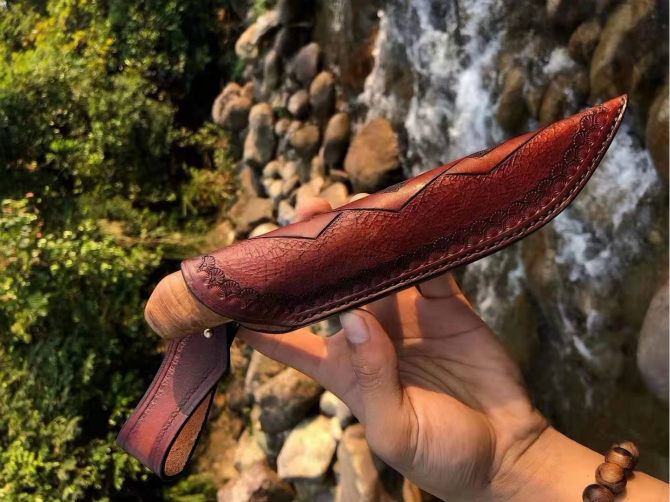 皮套:意大利进口植鞣革皮手工雕花缝线刀套,经典怀旧气息