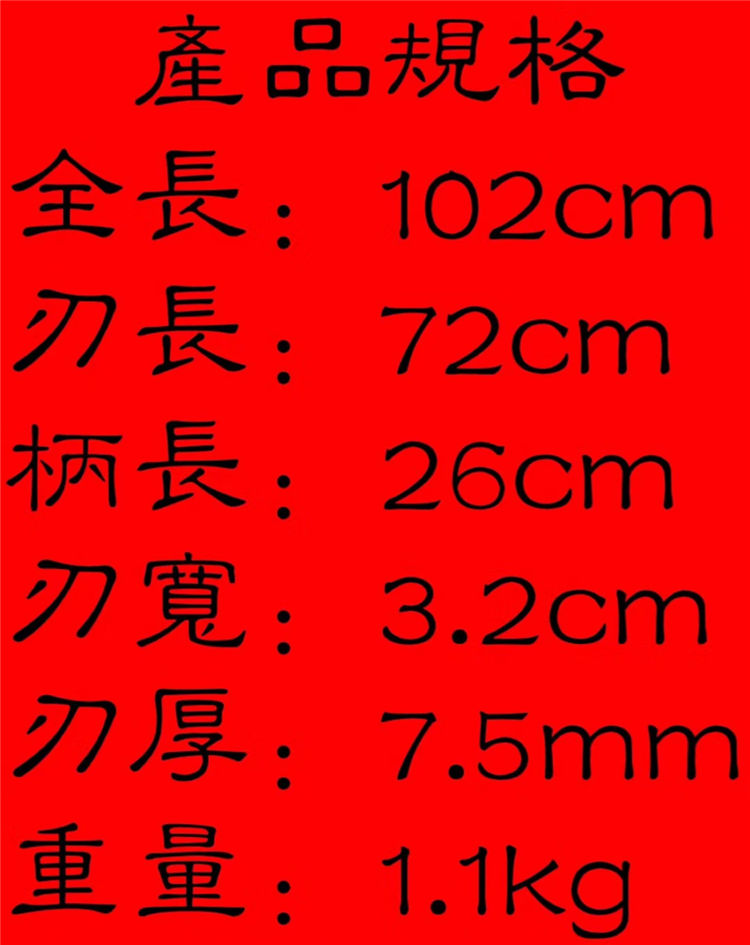勇士武士刀 专业测试、请勿模仿 工艺:古法传统手工艺 装具:无 刃材:高性能猛钢 柄材:实木漆柄 鞘材:实木漆鞘 赠品:锦盒、养护油、布