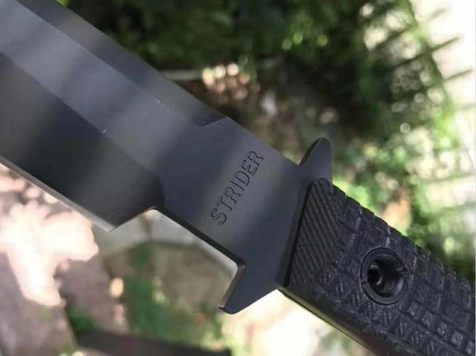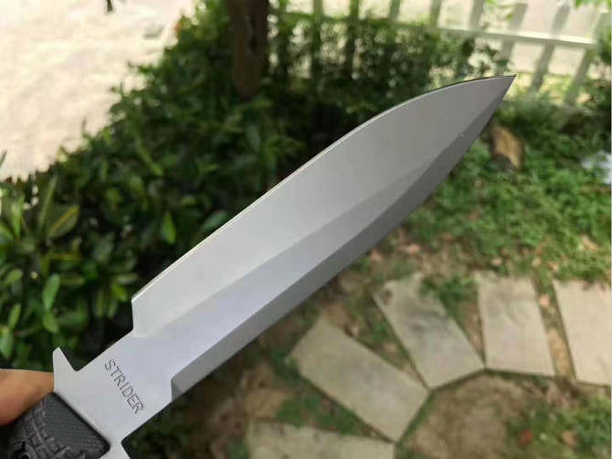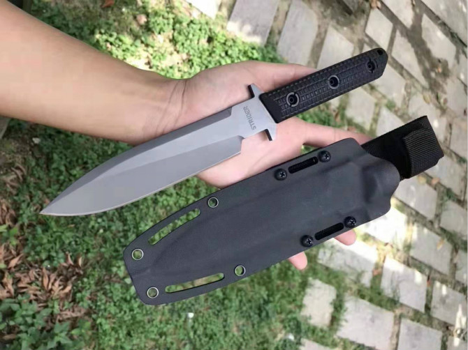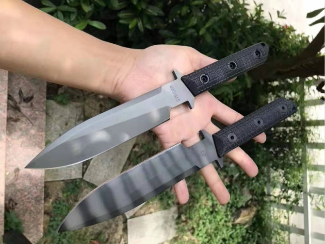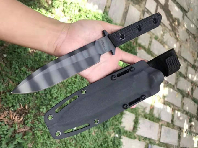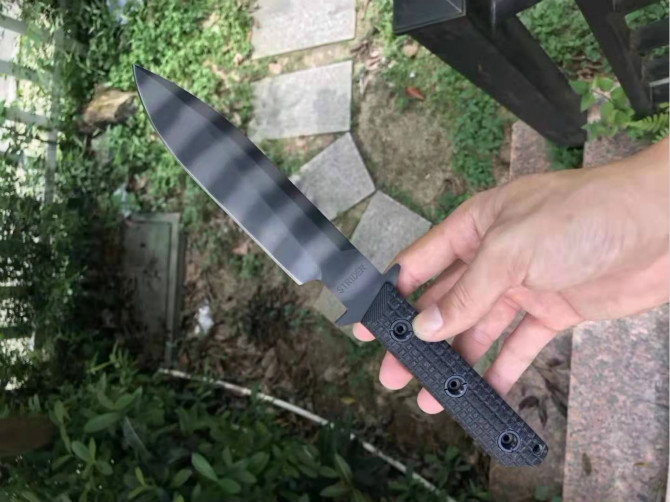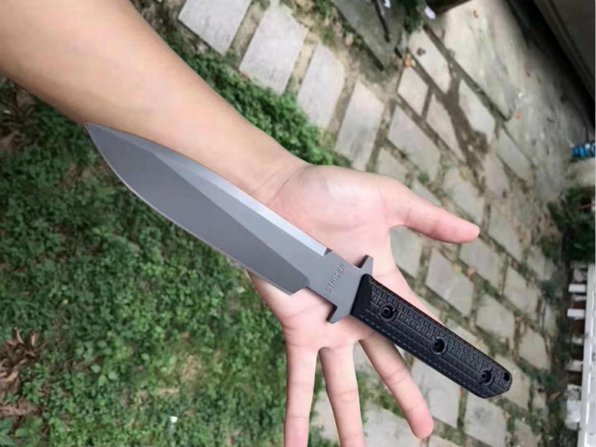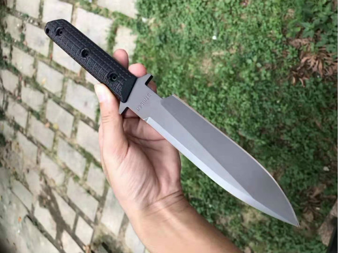 挺进者海豹突击队战士刀 总长:29cm 刃长:14cm 刃宽:3.6cm 刃厚:6mm 刃材:美国CPM-D2 硬度:60-62HRC,韧性保持度很好 热处理:专业真空热处理 表面处理:战术枪钛灰与虎纹 柄材:黑色G10 刀鞘:进口K鞘 做工完美,订单尾货