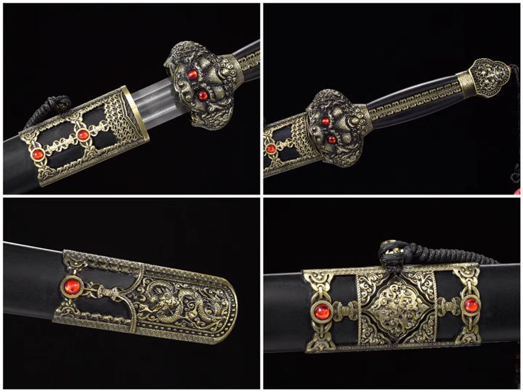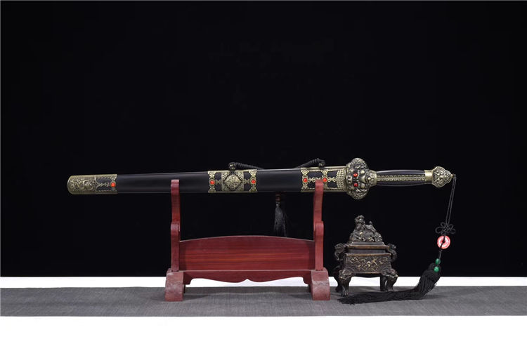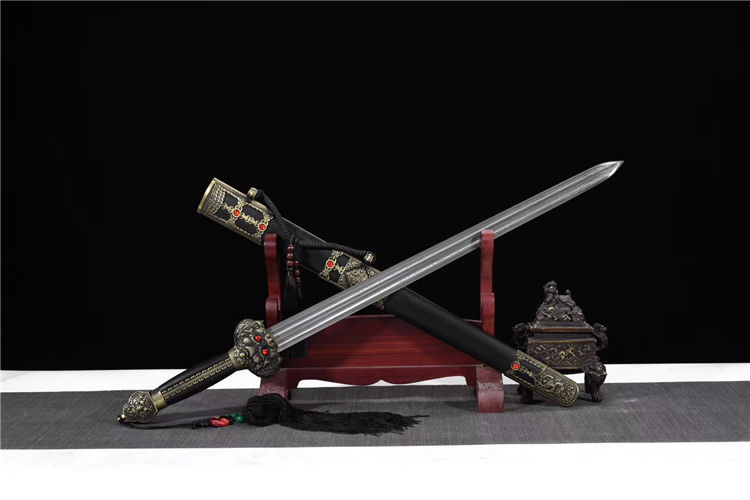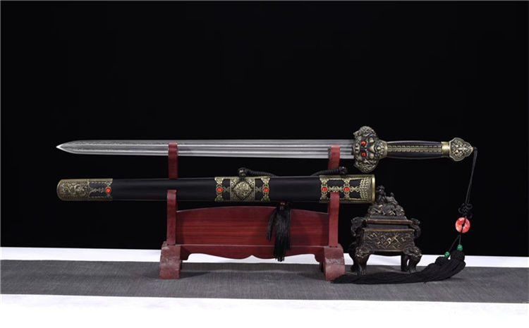大明永乐剑 专业测试、请勿模仿 工艺:龙泉古法传统手工艺 装具:合金 刃材:花纹钢 柄材:乌木 鞘材:乌木 赠品:高端锦盒、养护油、布