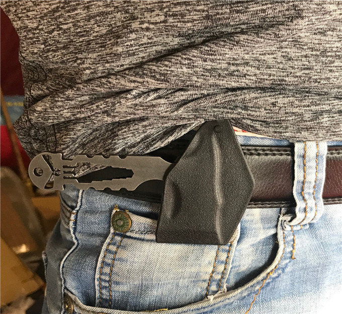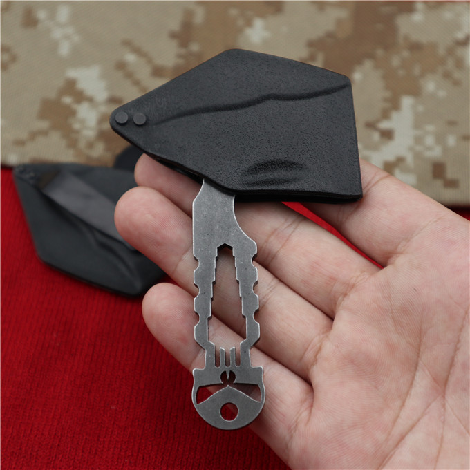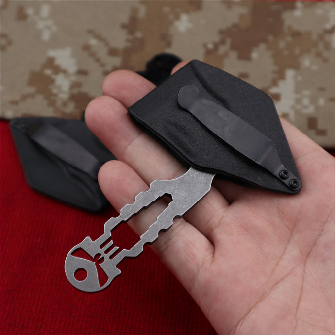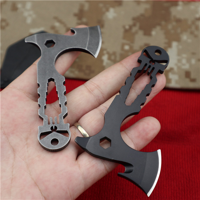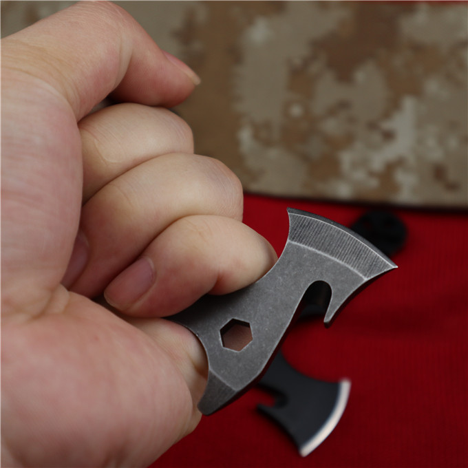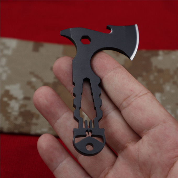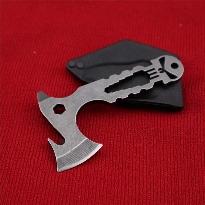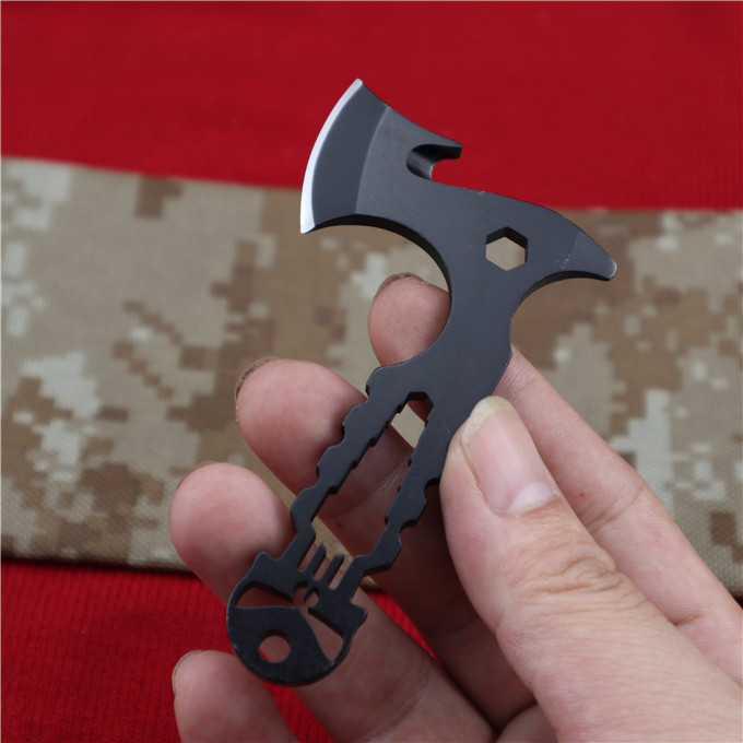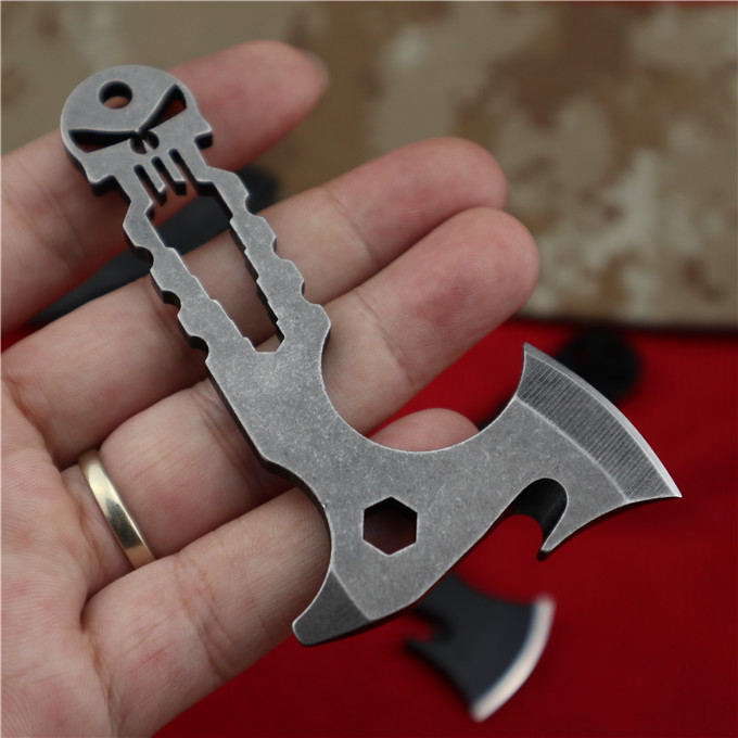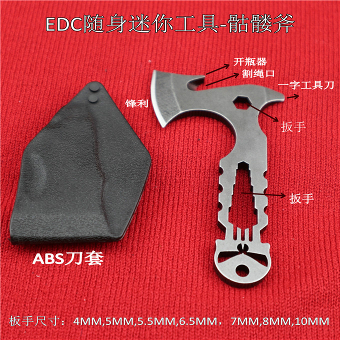EDC迷你骷髅斧 全长:9.1CM 刃长:2.8CM 刃厚:0.4CM 钢材:440 硬度:57HRC(真空油冷热处理) 表面:沧桑石洗或发镀钛 刀套:ABS 净重:39g(刀重) 产品功能:板手(板手尺寸:4MM,5MM,5.5MM,6.5MM,7MM,8MM,10MM),斧头,开瓶器,割绳口,一字螺丝刀