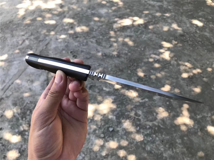 太极二代博弈直刀 总长:25cm 刃长:12.5cm 刃厚:5mm 刃宽:3.6cm 钢材:美国进口DC53合金钢 硬度:60-62HRC 开刃方式:手工哈刃 热处理:真空深冷热处理 表面处理:砂光效果 柄材:进口特种专业部队户外刀专用复合材质,硬度耐磨手感非常好