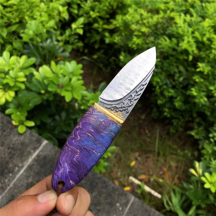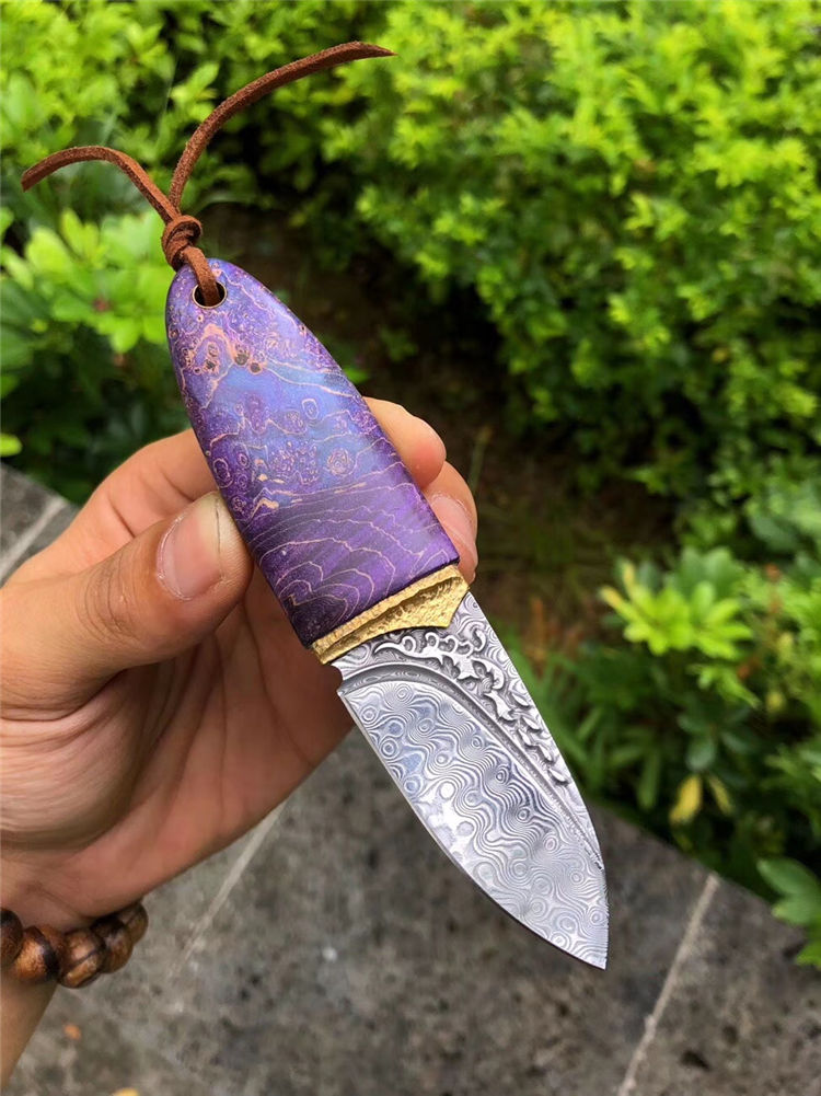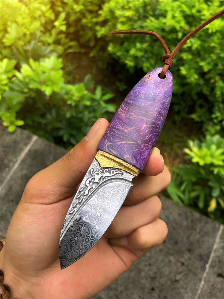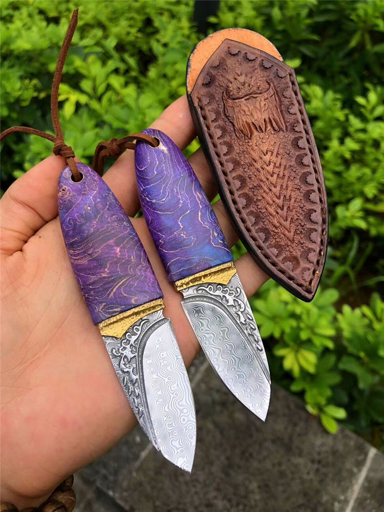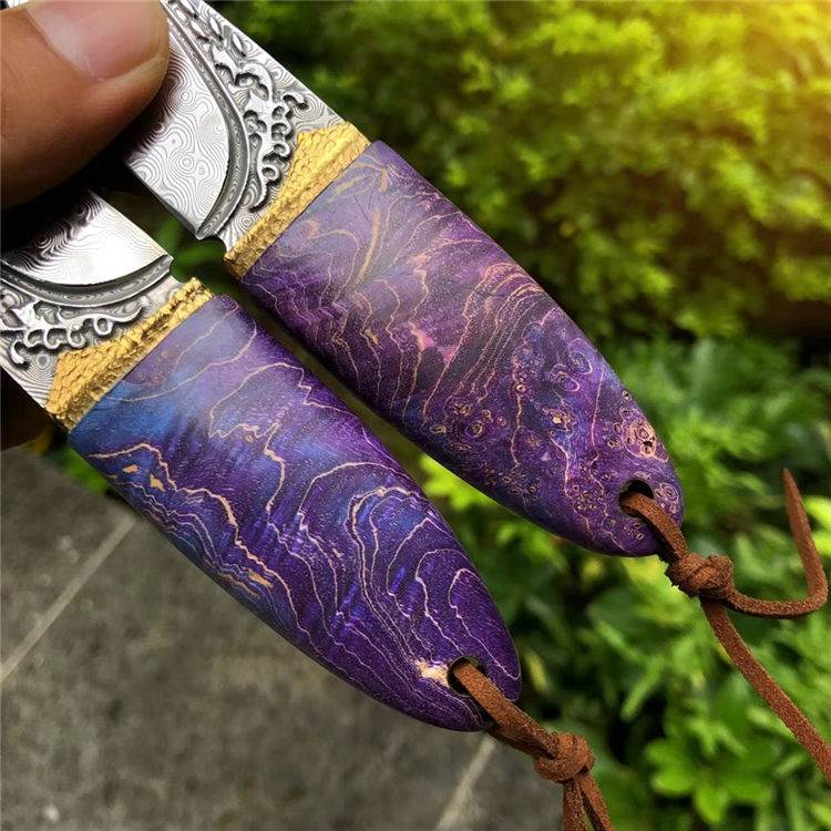 大马士革幻影橄榄直刀 总长:12.5cm 刃长:5cm 刃厚:3mm 刃宽:2.5cm 柄长:7.5cm 刃材:进口锻造无钢芯层大马士革钢 硬度:60HRC,真空高温热处理 开刃方式:手工三道工序开锋 柄材:黄铜金属+进口稳定固化木 包装/皮套:手工黑色小盒+手工缝制复古印第安刀套
