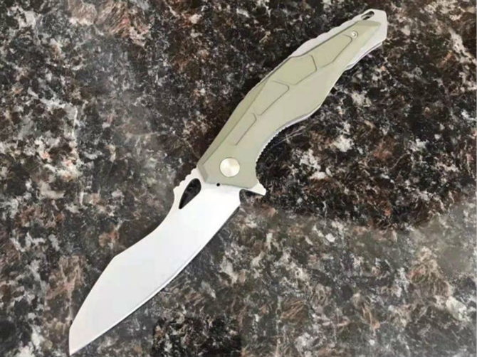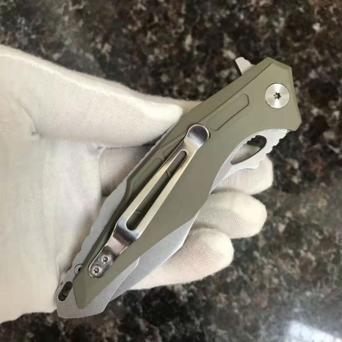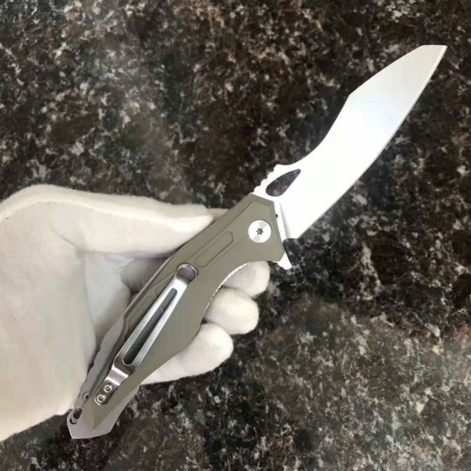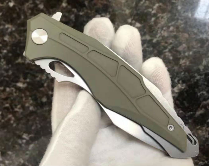 怪兽折刀 总长:230mm 刀长:102mm 柄长:128mm 刃厚:4.1mm 刃材:8Cr13Mov 硬度:57-58HRC 表面处理:石材洗 柄材:钢+胶 系统:轴承