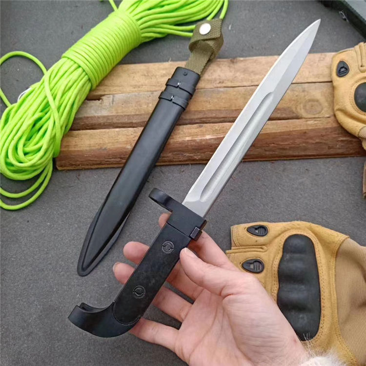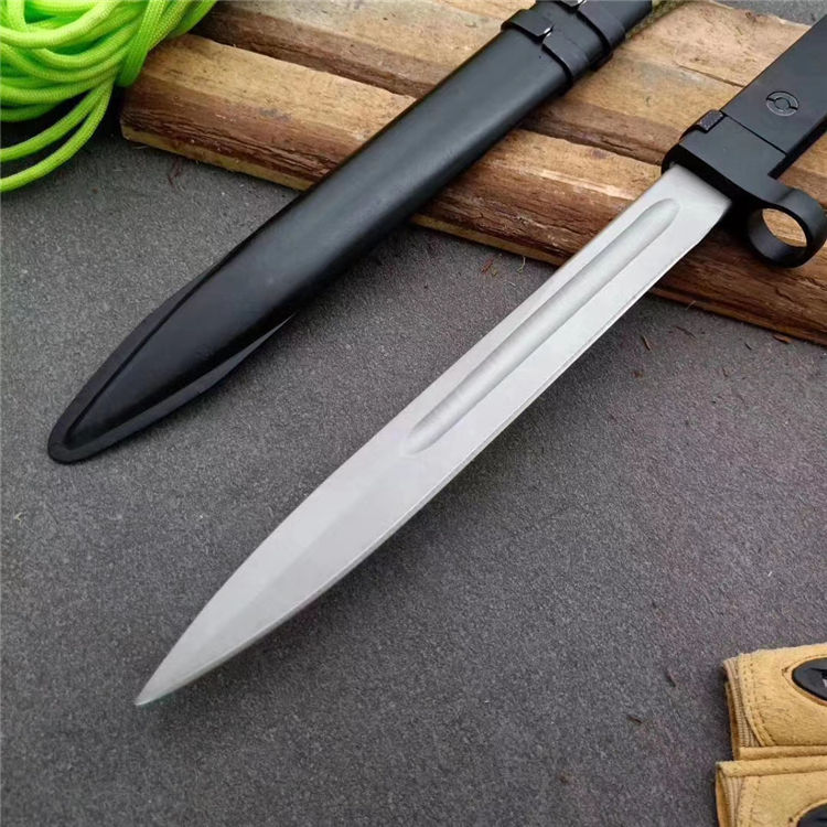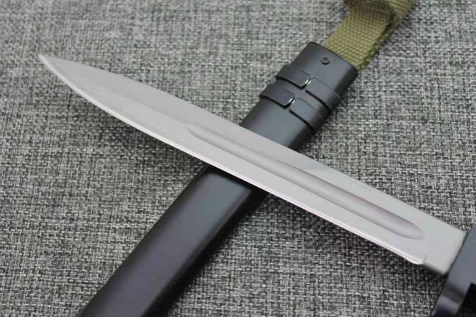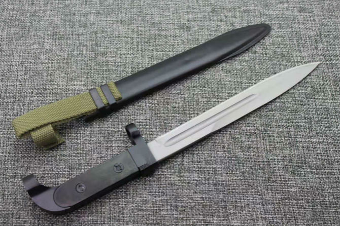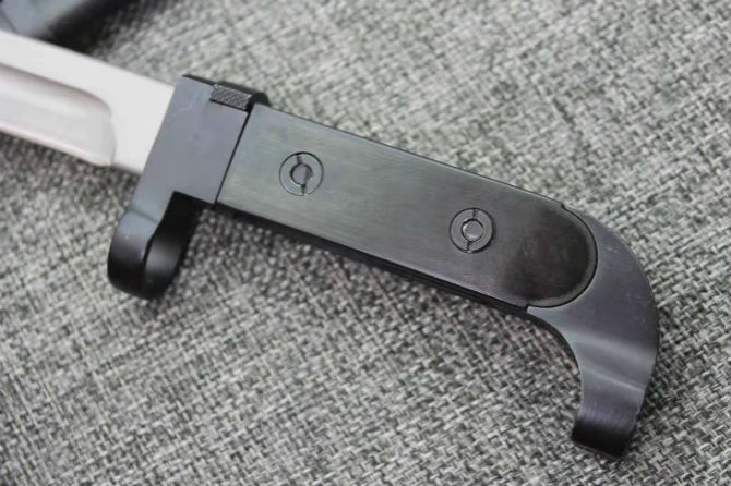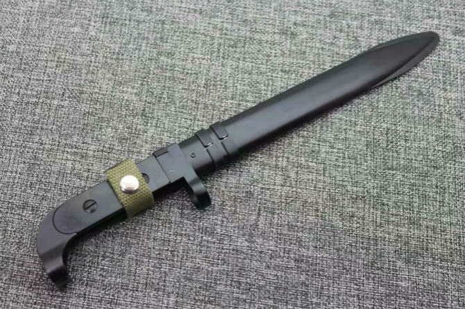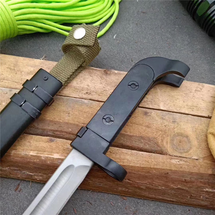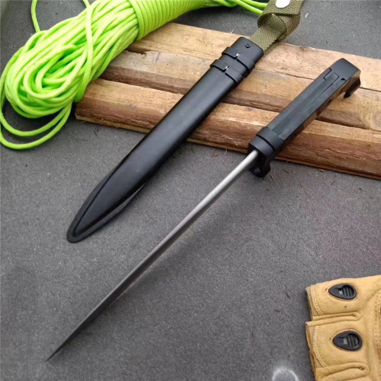 保加利亚黑柄AK47刺刀 类型:军刀 材质:特种钢 硬度:58-59HRC 全长:31厘米 刃长:20厘米 厚度:0.4厘米 宽度:2.2厘米 表面:灰钛 重量:500克(含包装) 刀鞘.钢鞘