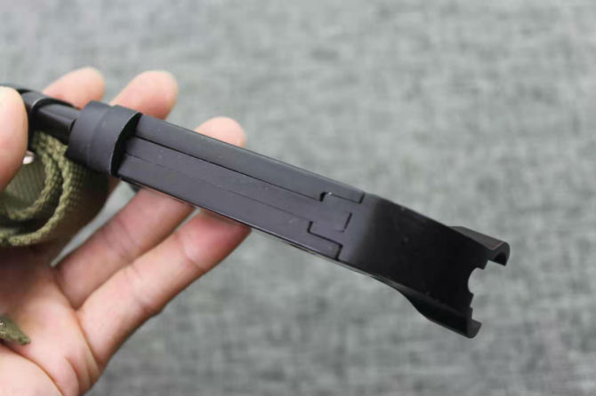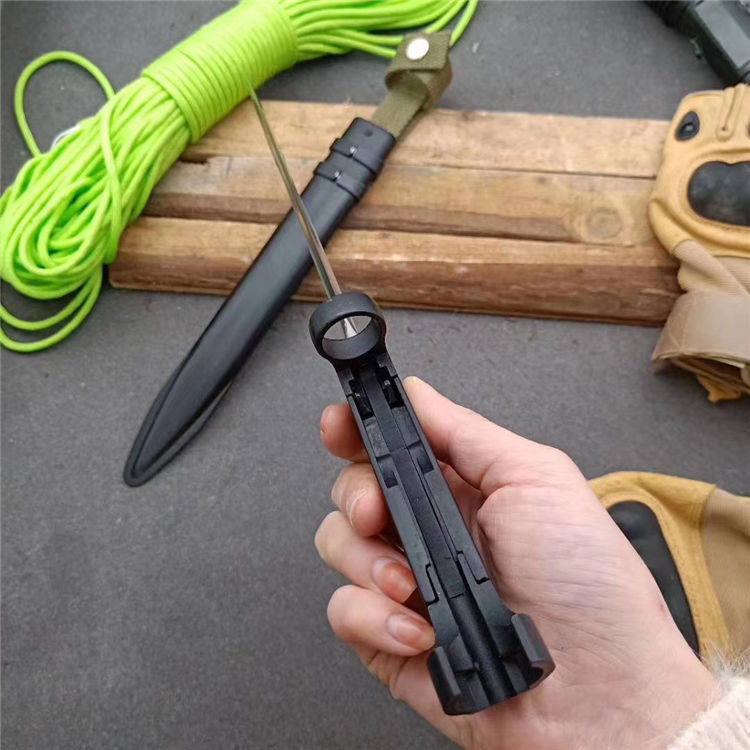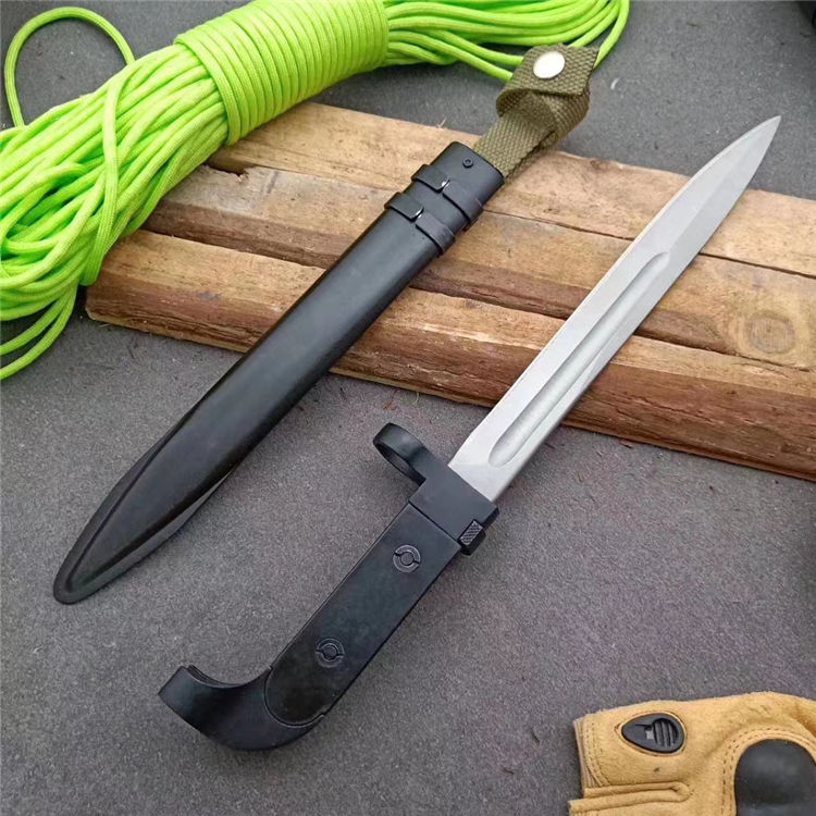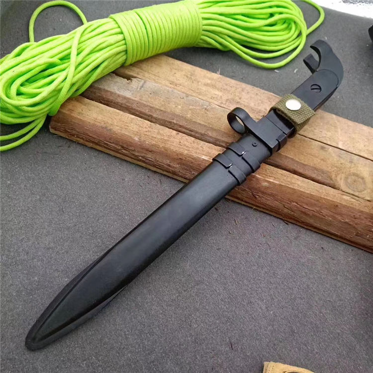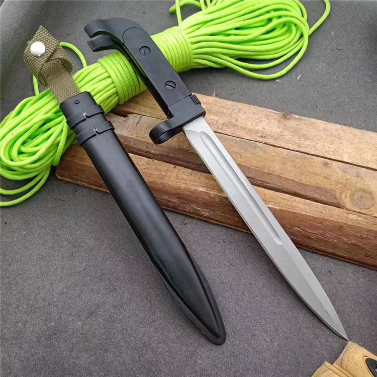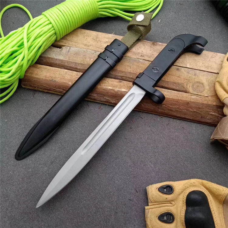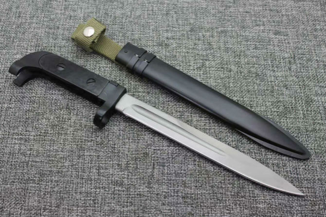 保加利亚黑柄AK47刺刀 类型:军刀 材质:特种钢 硬度:58-59HRC 全长:31厘米 刃长:20厘米 厚度:0.4厘米 宽度:2.2厘米 表面:灰钛 重量:500克(含包装) 刀鞘.钢鞘