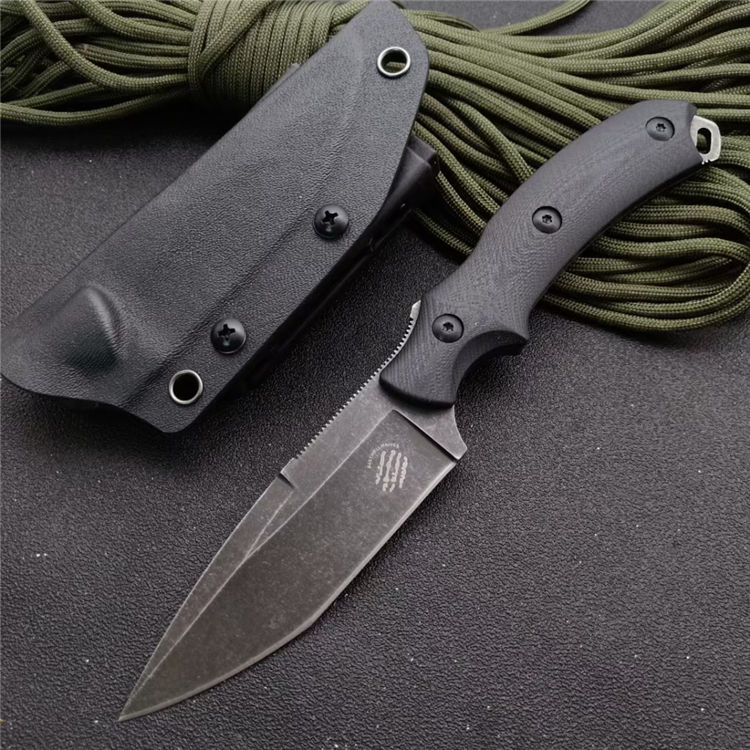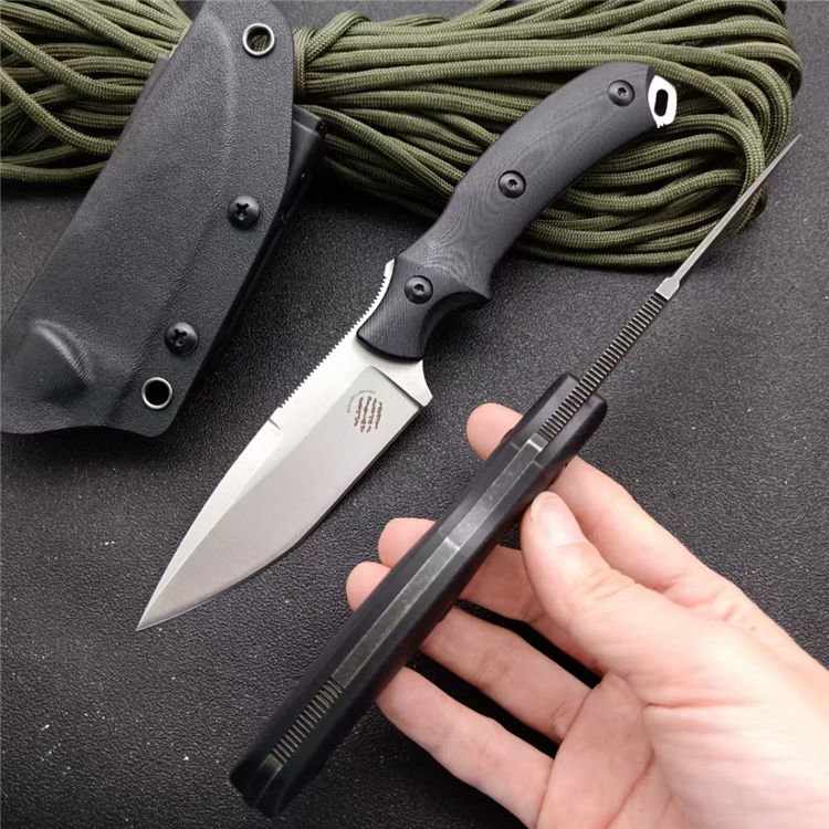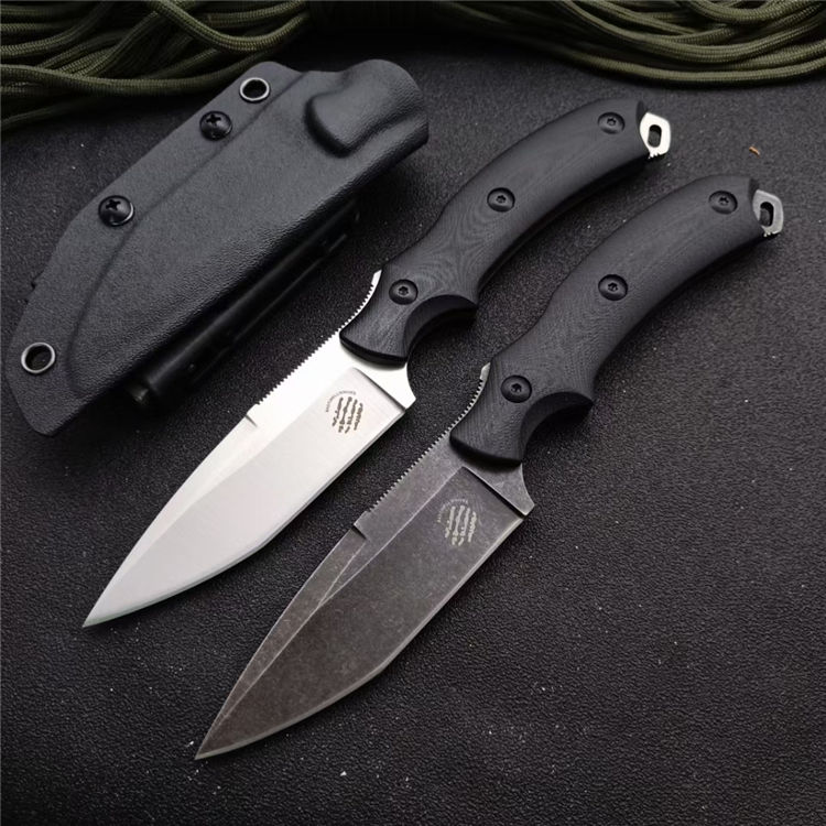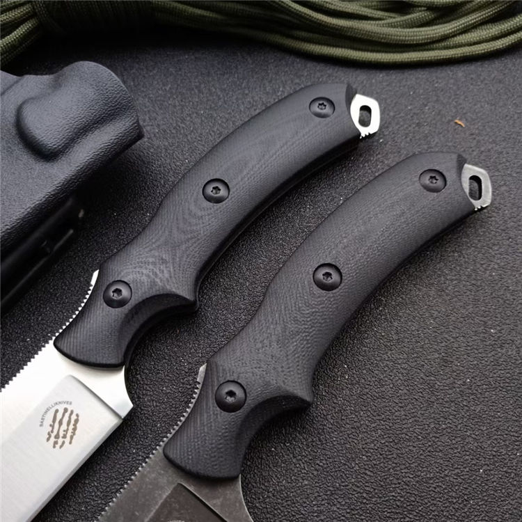 巴斯蒂内利黑豹RAID突击队直刀 型号:BAS03V2 全长:215mm 刃长:98mm 刃厚:4mm 柄长:115mm 刃材:D2钢 表面:砂光或沧桑石洗 柄材:G10 硬度:59-60HRC(真空油冷热处理) 刀鞘:Kydex鞘 重量:350g(含包装) 包装:黑色礼品盒