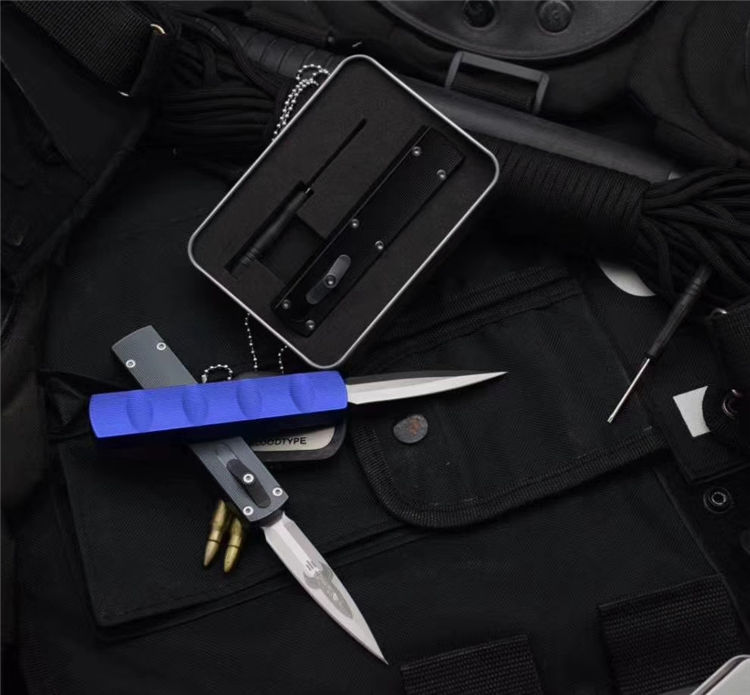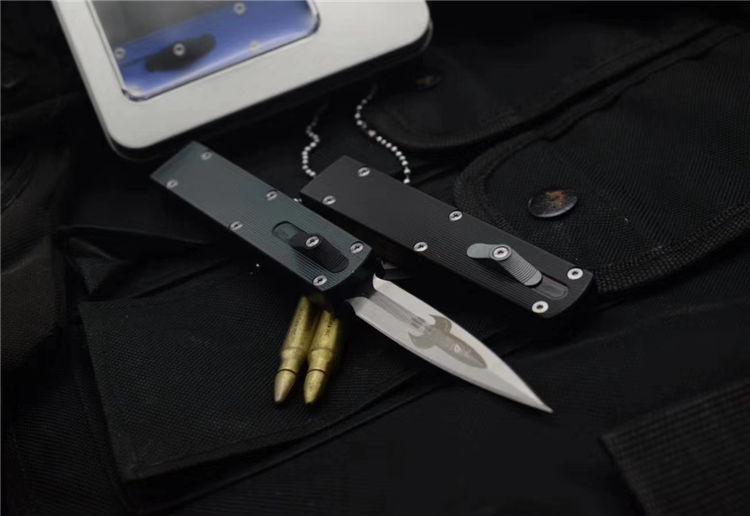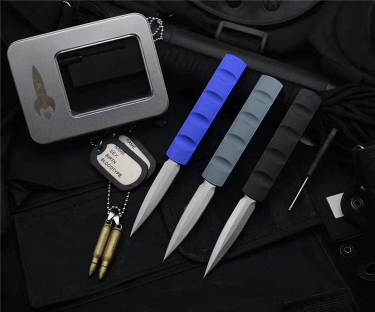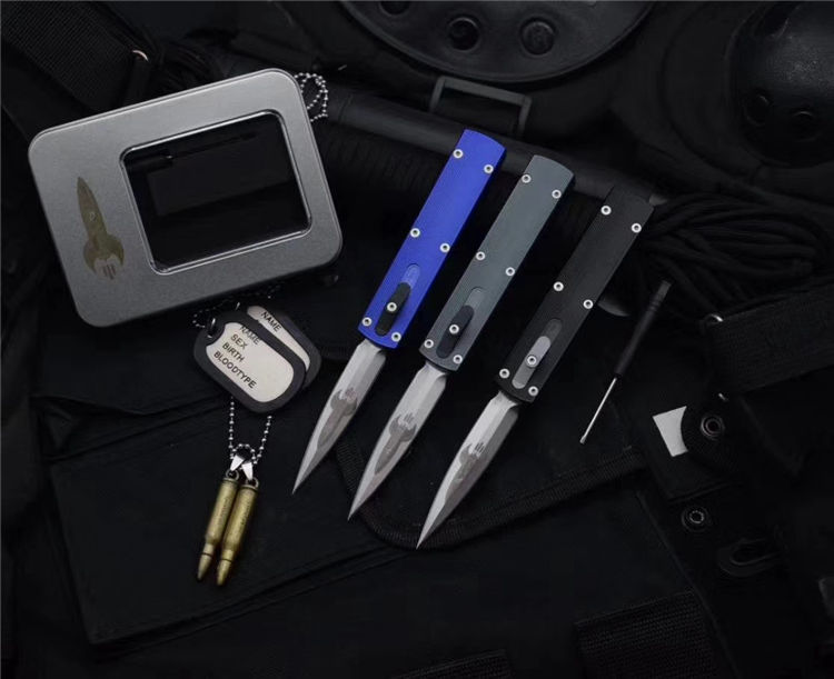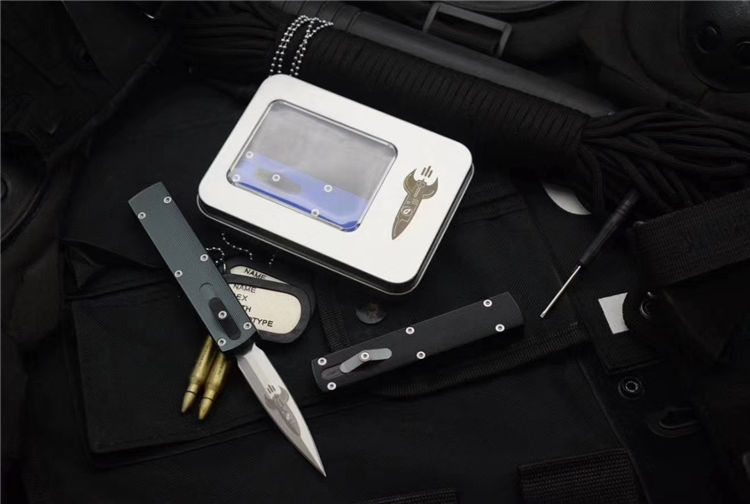 MICROTECH美国微技术火箭直出跳刀 全长:17.5CM 刃材:ELMAX 刃长:7CM 柄宽:2CM 刃厚:0.43CM 柄材:铝合金 刀型:直跳 锁定类型:推钮锁刀 重量:61克 附件:精品礼盒 整刀用,CNC,电脑锣,线切割制作而成,手工,精密度非常高,很值得收藏的一把刀