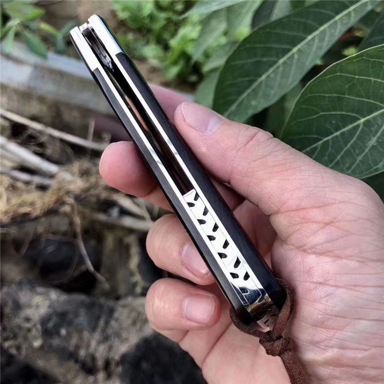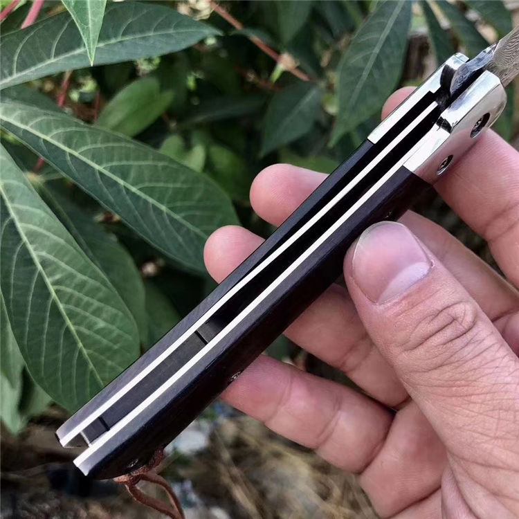 大马士革雕刻折刀 全长:21.3cm 刃长:9.5cm 柄长:11.8cm 刃厚:0.28cm 刃宽:1.9cm(最宽出) 刃材:大马士革VG10 柄材:黑檀木 硬度:60HRC 净重:108g 毛重:161g