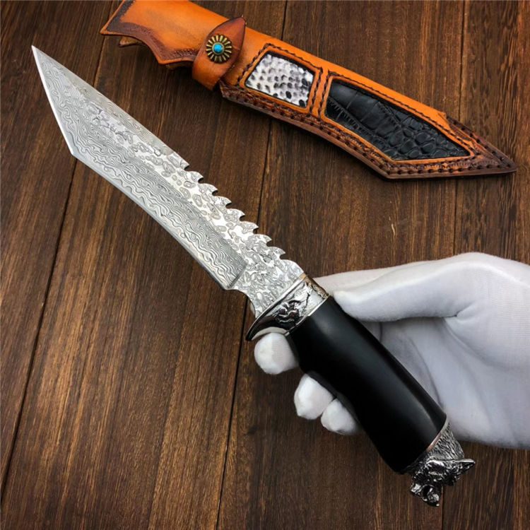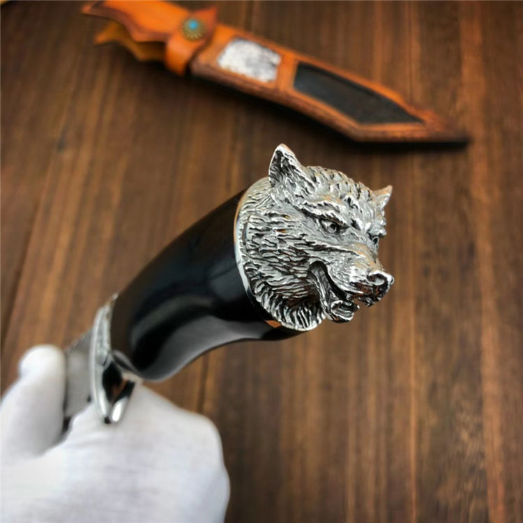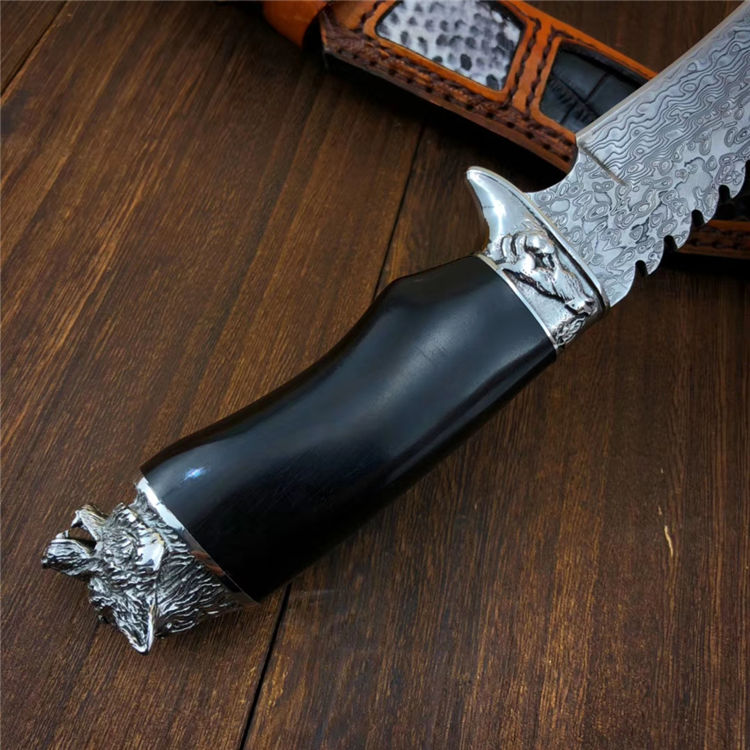 大马士革野狼直刀 总长:28.5cm 刃长:14.5cm 手柄:12cm 刃厚:4mm 硬度:60HRC 钢材:大马士革钢 柄材:野狼外形钢头+黑檀木 包装:高端竹盒+保养油+抹刀布
