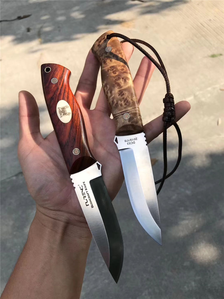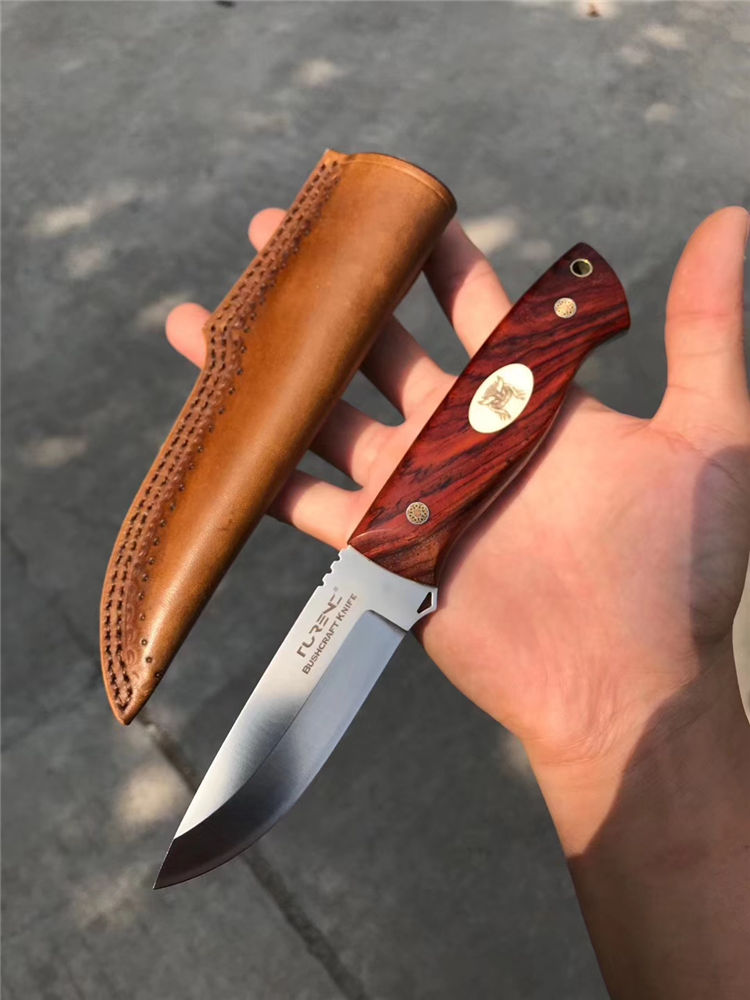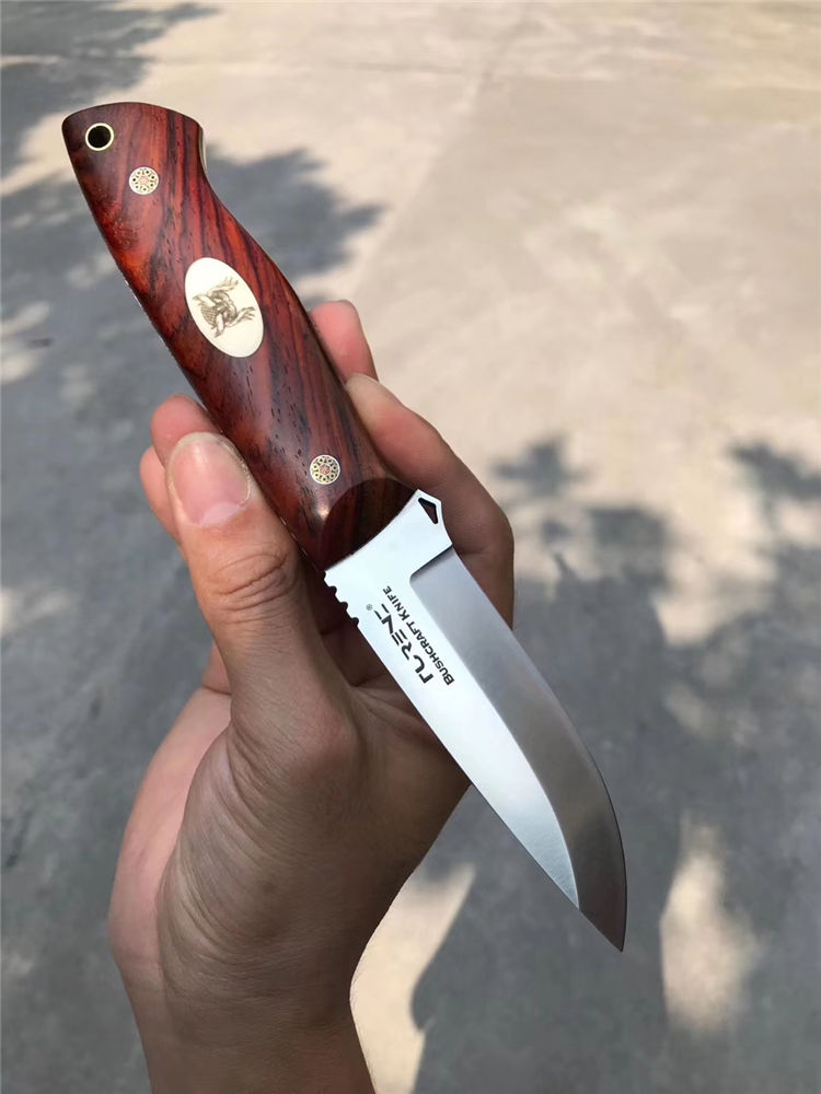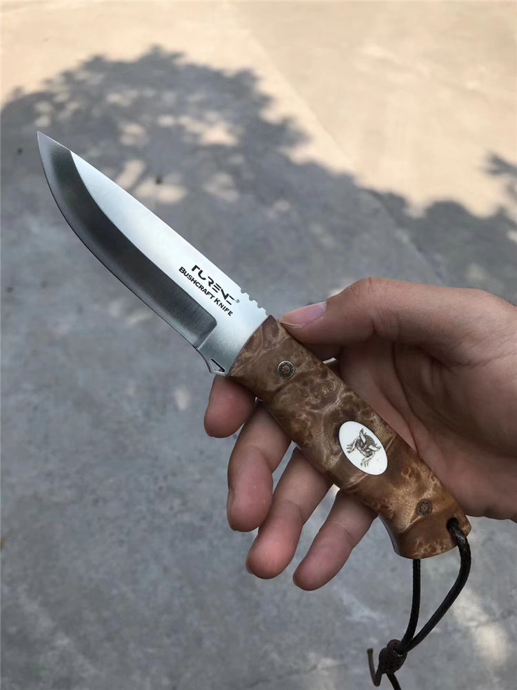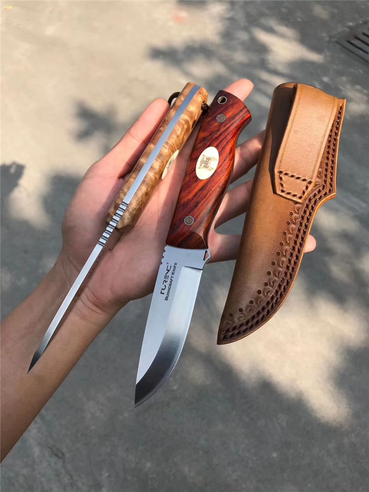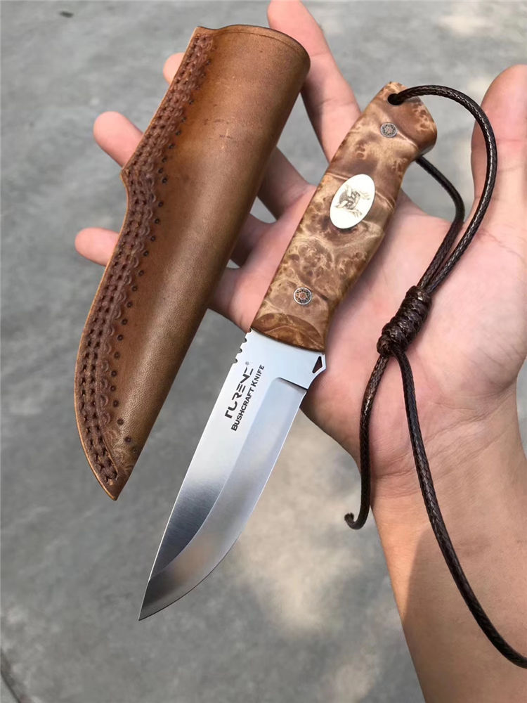 雷胖子猫鹰直刀 总长:21cm 刃长:9cm 刃厚:4mm 刃宽:2.8mm 重量:167g 钢材:美规进口DC53合金模具钢 热处理:真空热处理 硬度:60-62HRC 结构方式:刀刃一体龙骨设计,安全牢固 表面效果:砂光效果 柄材:微微黄檀木/白影木,镶嵌牛骨图案,马赛克铆钉固定装饰 开刃方式:斯堪式V磨直穿方式,锋利度超好 皮套;意大利进口优质手工雕花植物鞣皮,手工做旧复古工艺着色,手工雕花缝线,高端大气上档次 包装:手工盒子包装