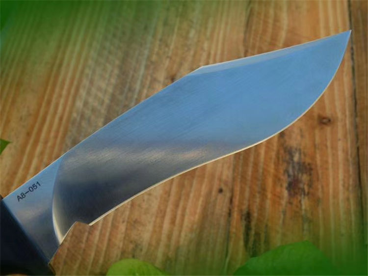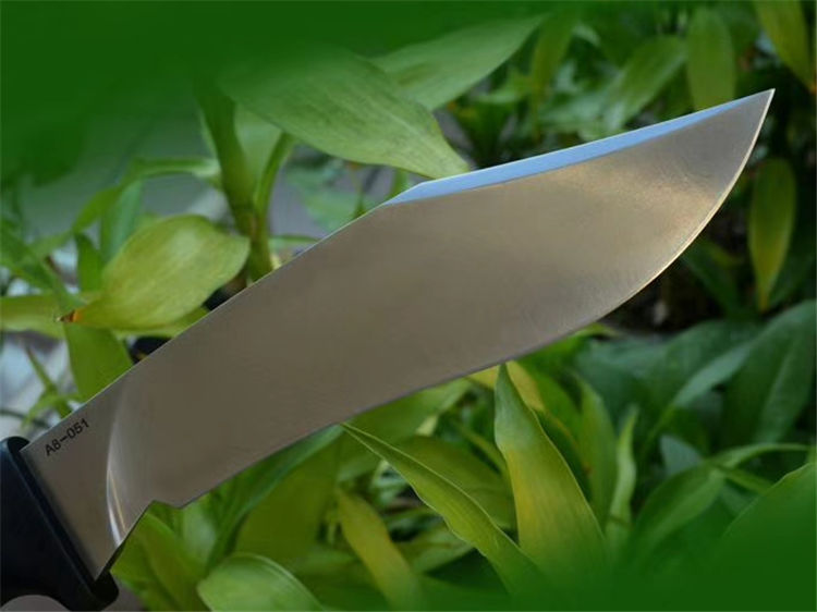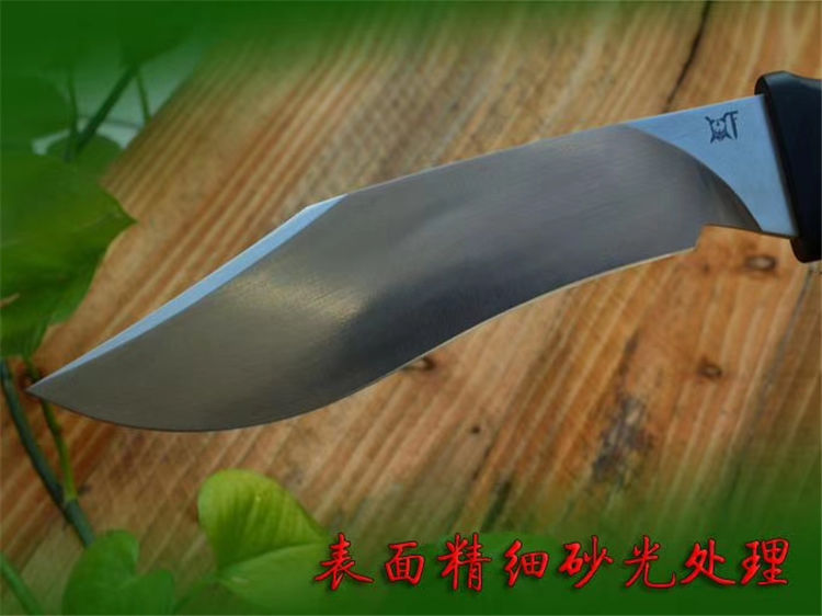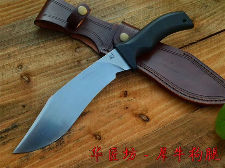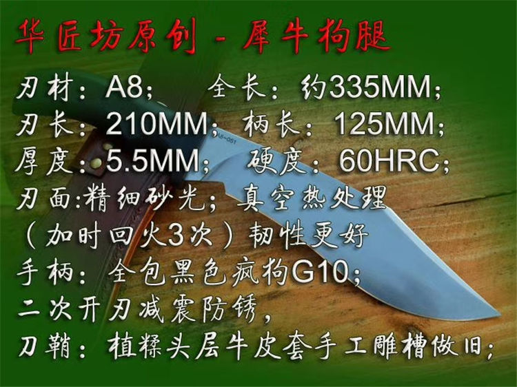 华匠坊犀牛狗腿弯刀 全长:约335MM 刃长:210MM 柄长:125MM 厚度:5.5MM 硬度:60HRC 材质:A8 刃面砂光真空热处理(加时回火3次)韧性更好手柄全包黑色疯狗G10手柄二次开刃减震防锈,植糅皮套手工雕槽做旧黑色礼盒包装