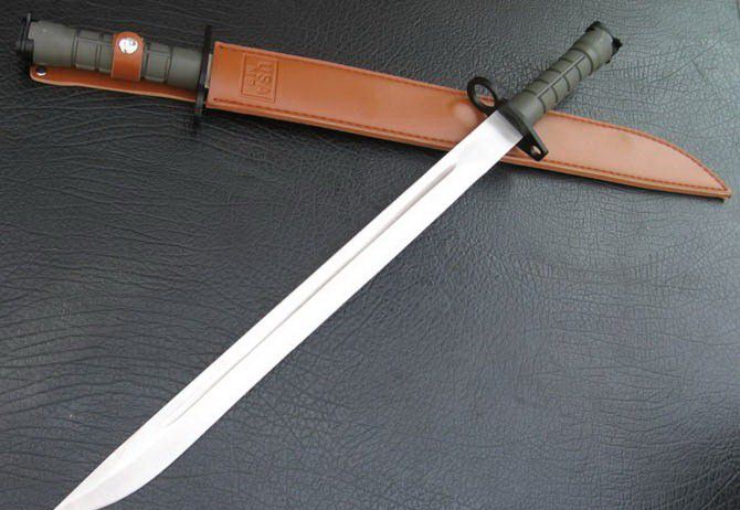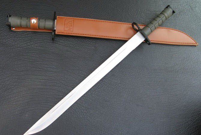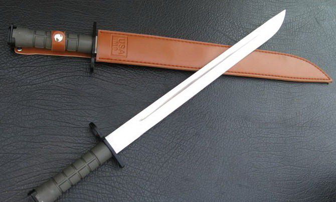 M9军刺尖头(大号) 全 长:52cm 刃 长:39cm 刃 厚:4mm 刃 材:420A 柄 材:ABS塑料 硬 度:56Hrc 表 面:砂光 刀 套:人造皮革 净 重:400g