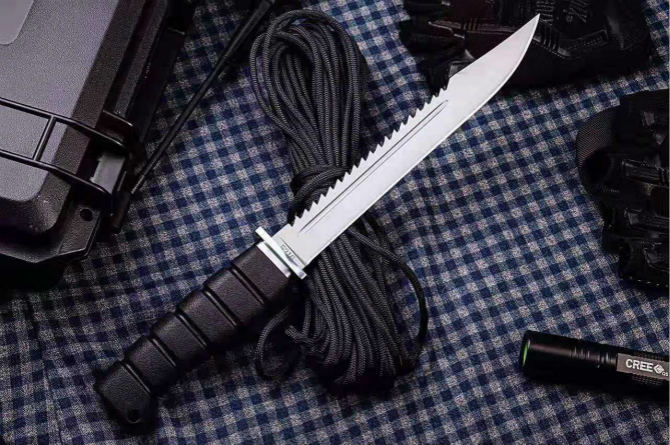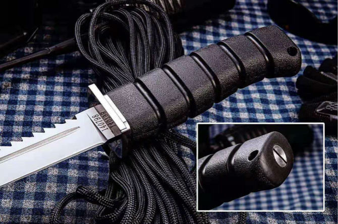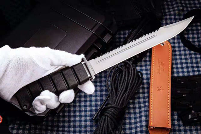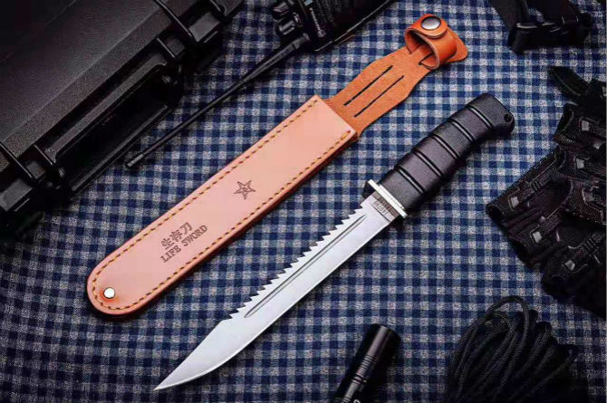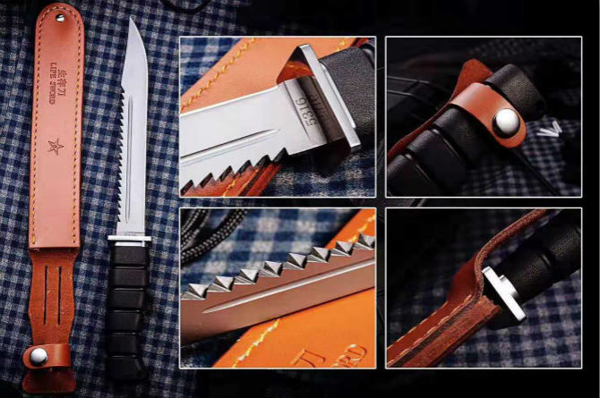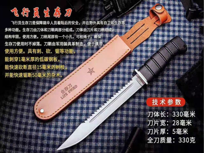 飞行员生存刀是保障跳伞人员着陆后的安全,并在野外具有自卫和生存等多种功能,生存刀由刀体和刀鞘两部分组成,刀体由刀片和刀柄组成,结构牢固,使用方便,刀柄尾部有一个小孔,可栓绳子,确保生存刀使用时不掉落,刀鞘由军用装具革制造,便于携带,使用方便,具有刺、砍、锯等功能,能刺穿1毫米厚的低碳钢板,能快速砍断直径15毫米的树枝,并能快速锯断50毫米的杂木