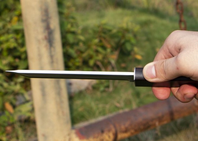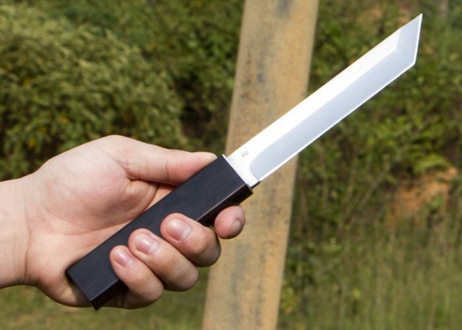 黑旋风D2钢武士刀 总长:27cm 刃长:14cm 刃厚:4mm 刃宽:2.5cm 钢材:D2钢 硬度:58真空热处理 表面处理:抛镜光效果 柄材:进口黑檀木 刀鞘:黑檀木料 包装:礼品盒
