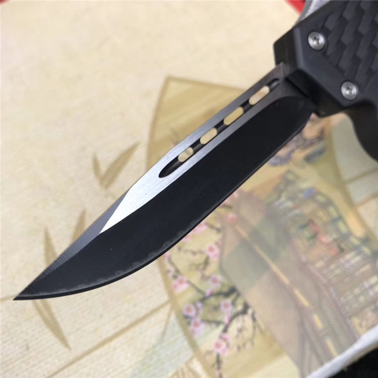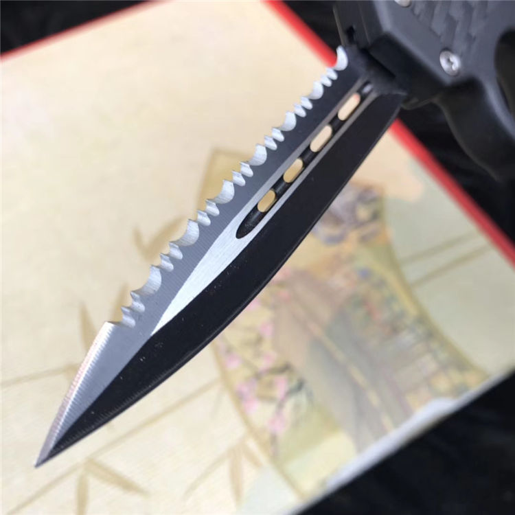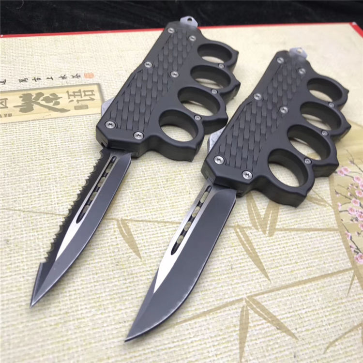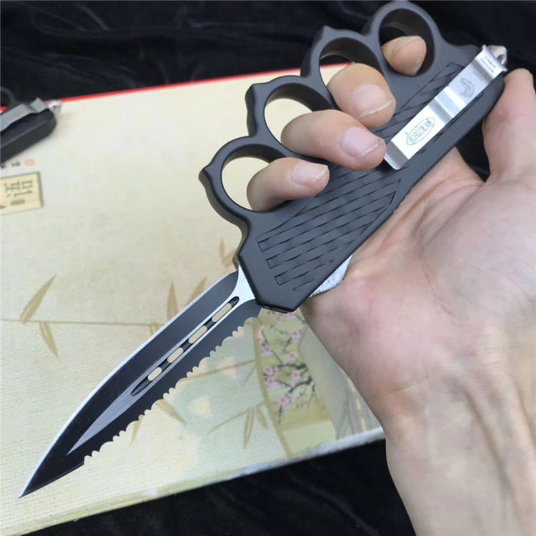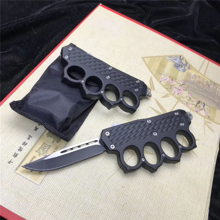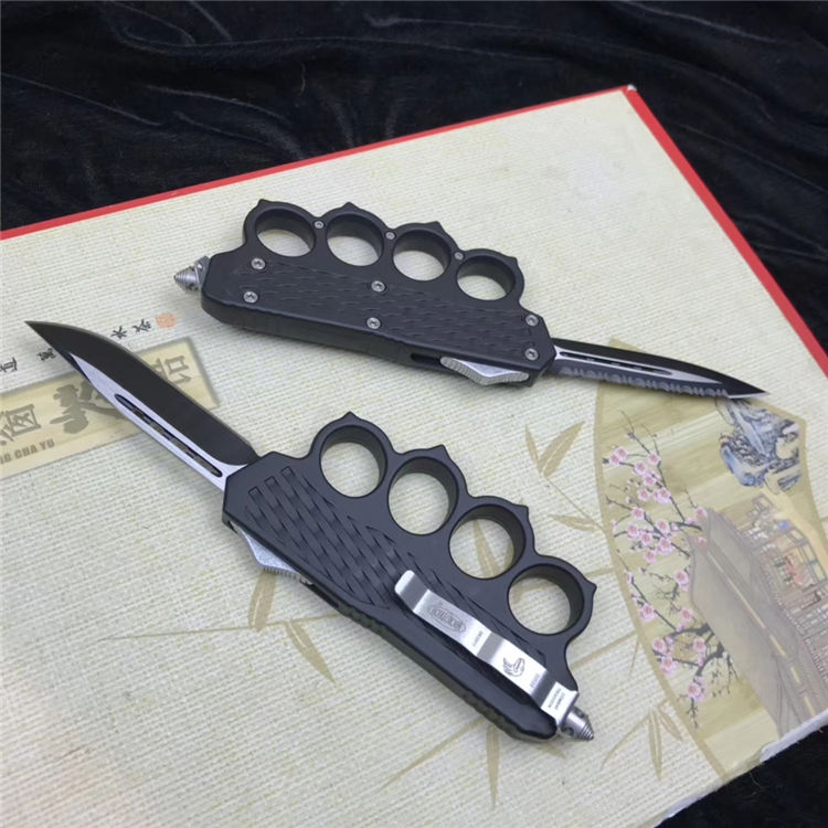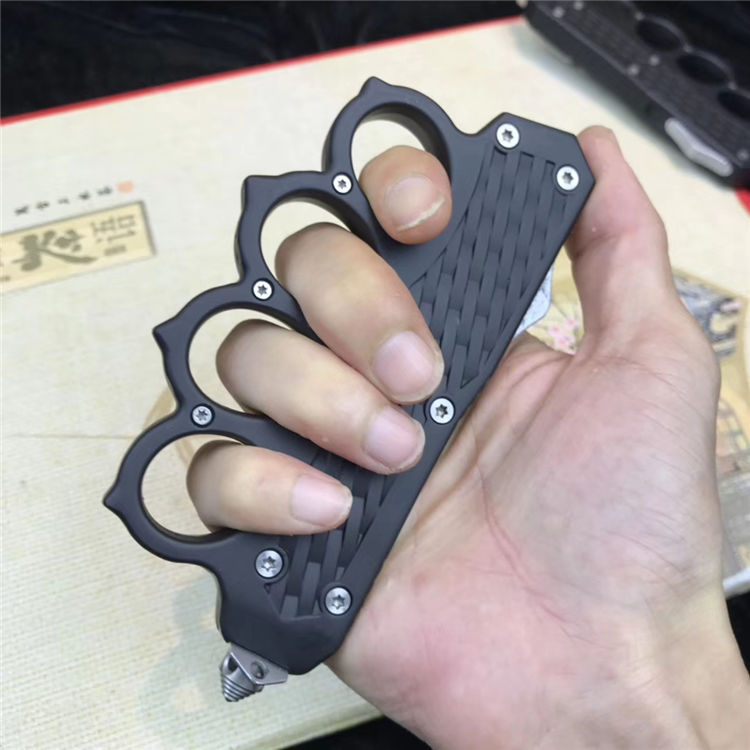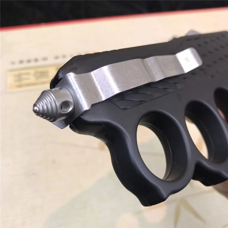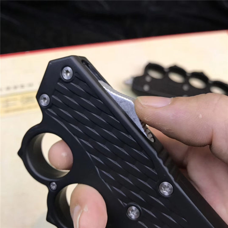 捍卫拳套直出跳刀 全长:22.5cm 刃长:9cm 刃厚:2.1mm 刃材:440 硬度:57HRC 刀重:220g 毛重:340g 表面:氧化白 柄材:锌铝合金 刀鞘:尼龙 锁闭:直出弹簧+拳套