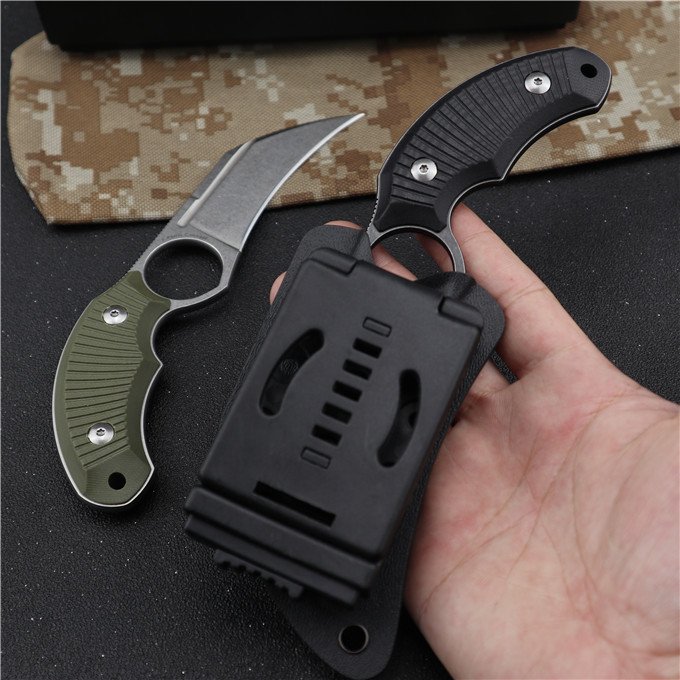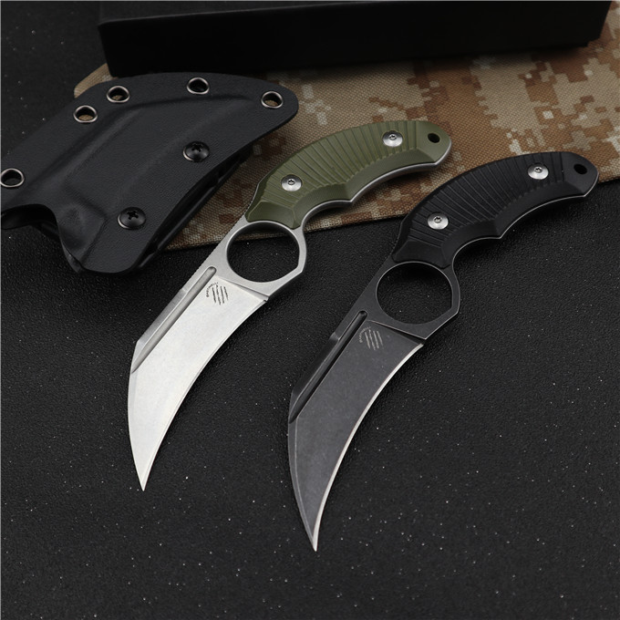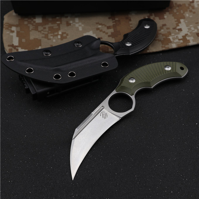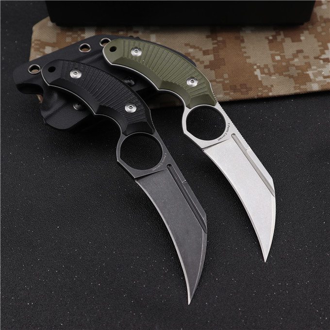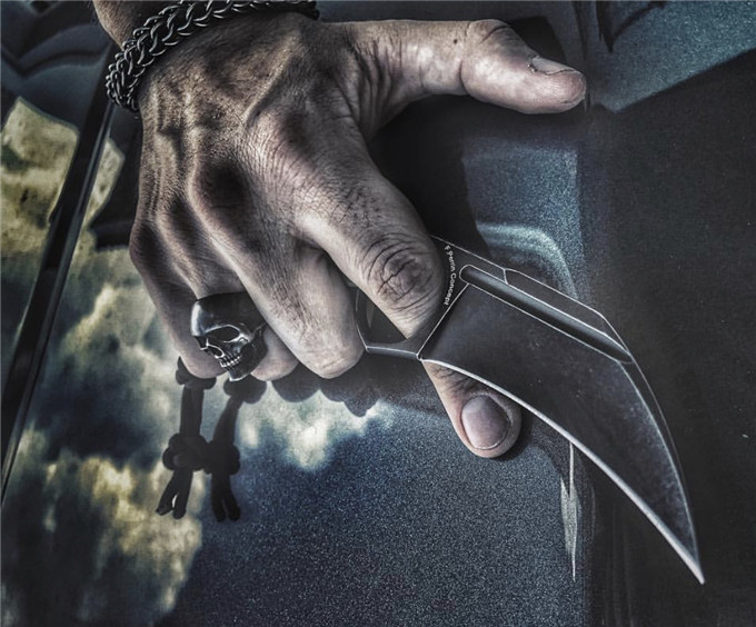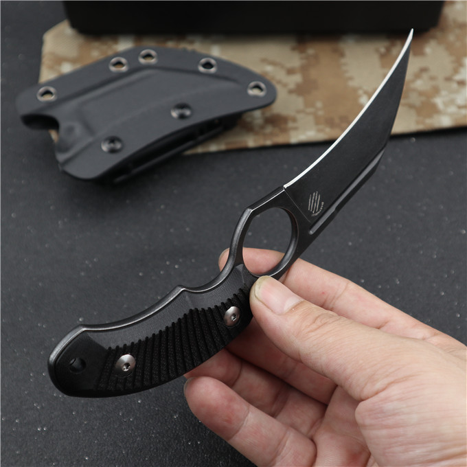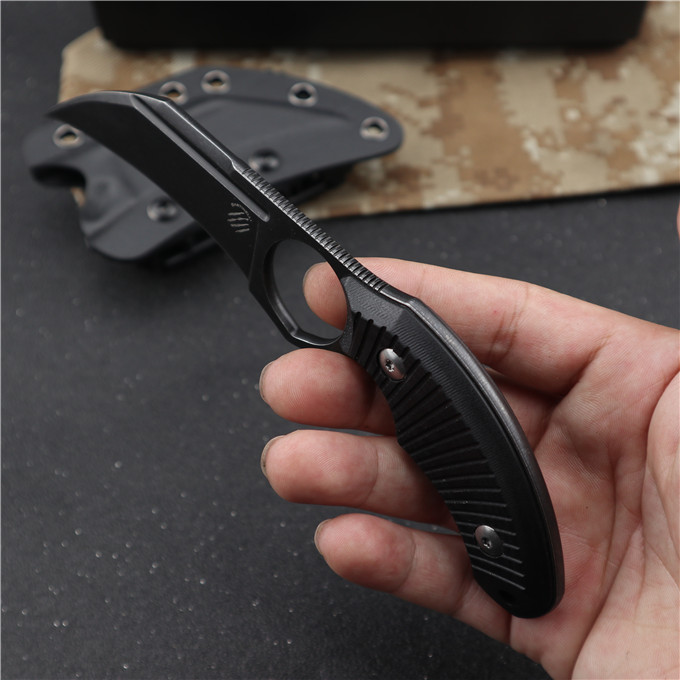 巴斯哈皮战术爪刀 全长:18.3CM 刃长:7.5CM 刃厚:0.5CM 刀柄:8.7CM 刃宽:2.6CM 钢材:DC53 硬度:59-60HRC(真空油冷热处理) 表面:沧桑石洗或石洗 刀柄:黑色G10 刀套:K鞘 净重:116(刀重) 重量:240g(含包装) 包装:黑色礼品盒.