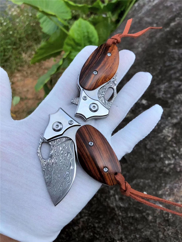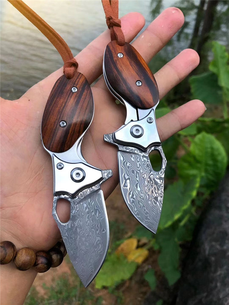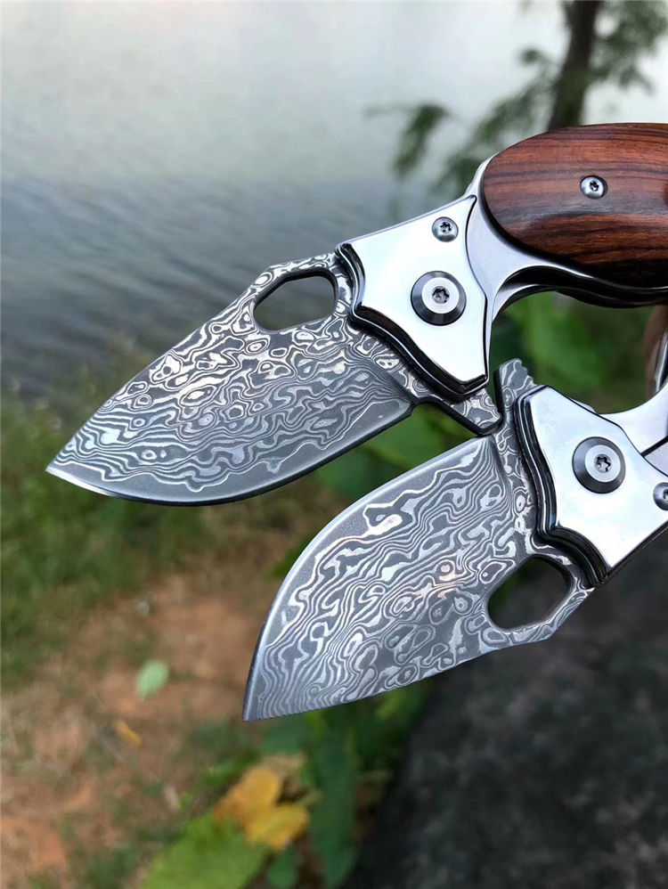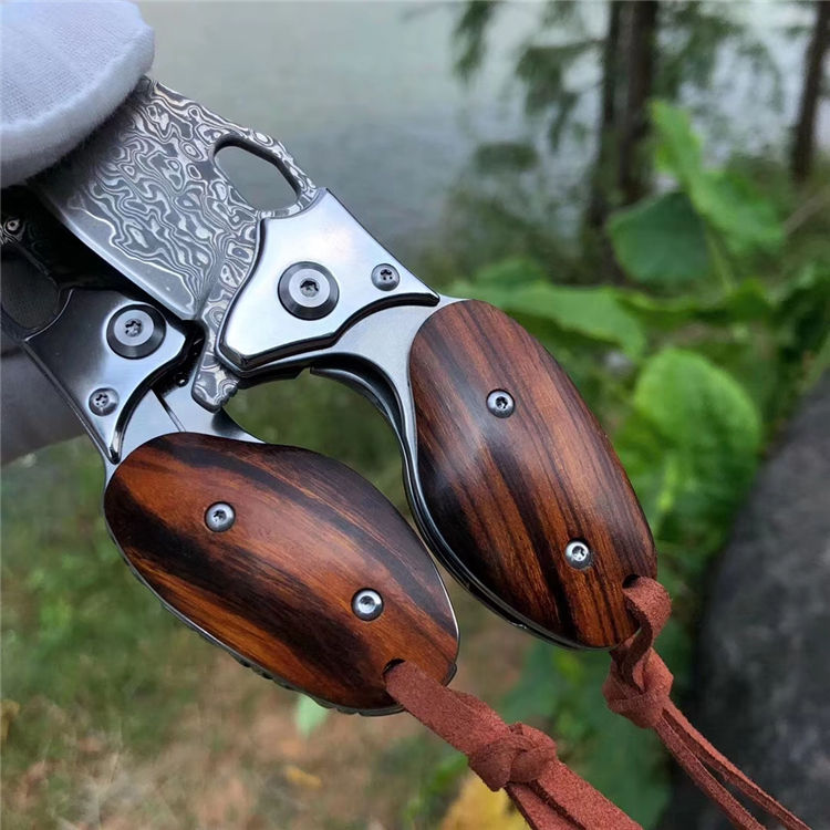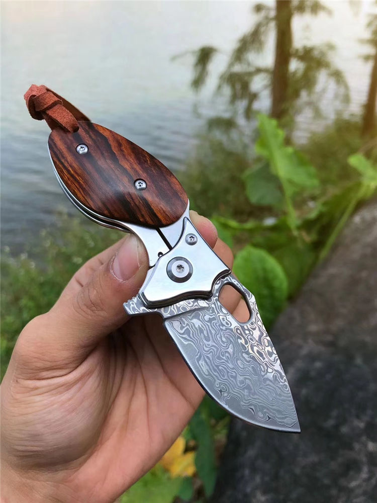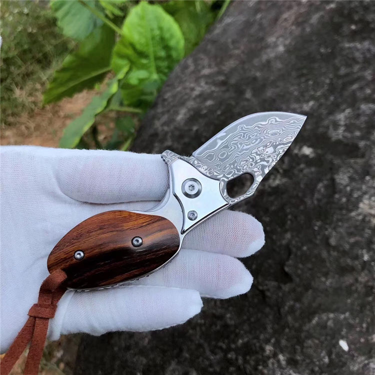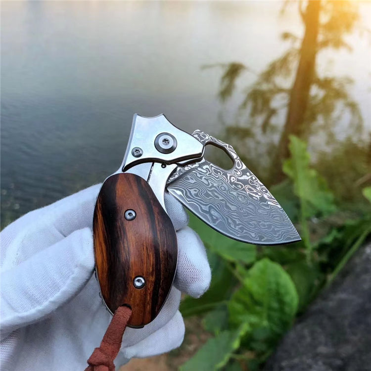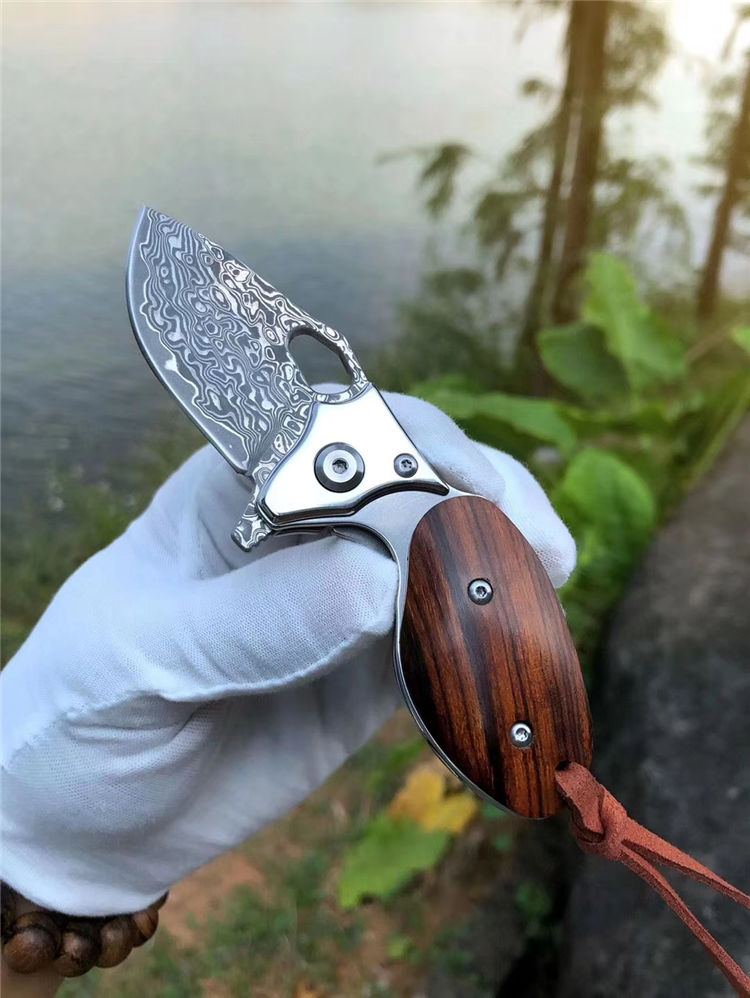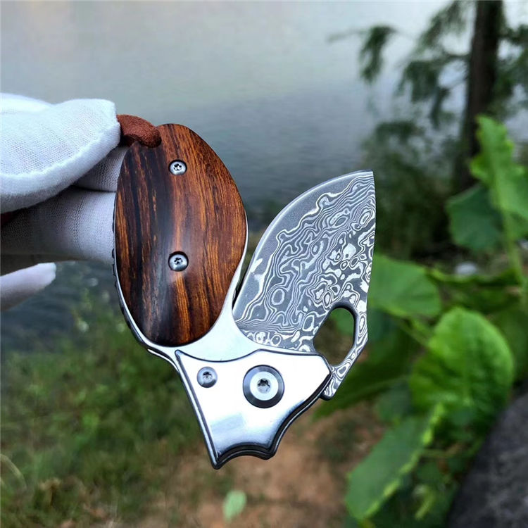 大马士革沼泽鼠快开折刀 总长:12.5cm 刃长:5cm 柄长:7.5cm 刃宽:3cm 刃厚:2.8cm 刃材:进口锻造大马士革VG10钢 硬度:60HRC,真空深冷热处理 柄材:进口美国沙铁木 内部结构:滚珠轴承快开 包装:原出口黑色小盒装