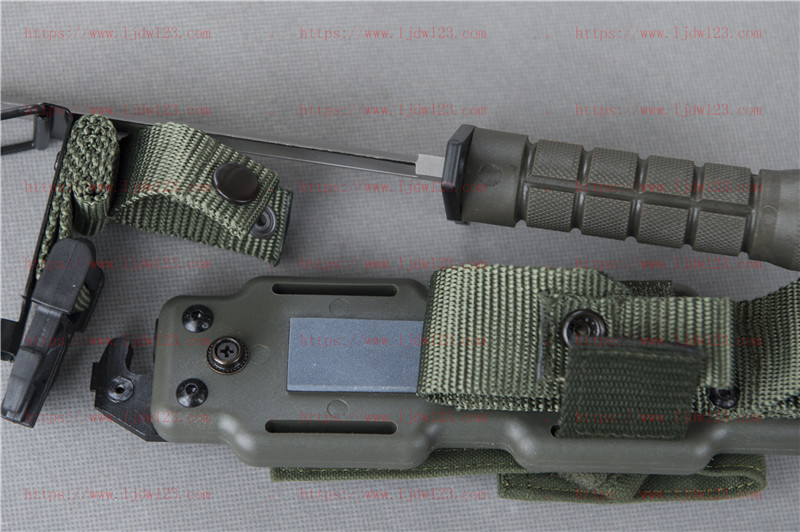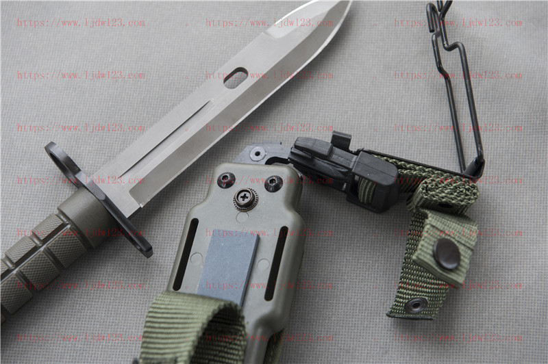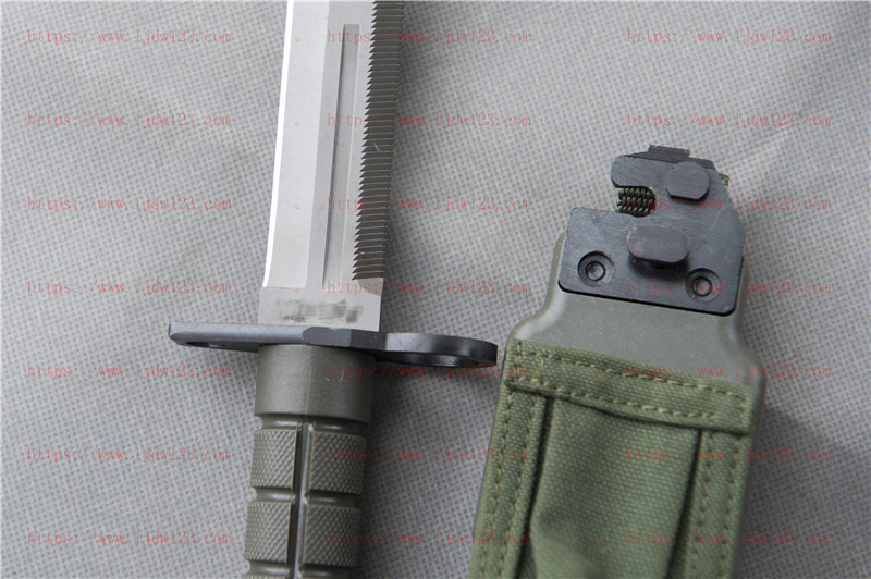 全长:30.8 cm 刃长:18 cm 刃厚:0.6 cm 锯齿段:7.4 cm 重量:780 g 刃材:高品质440H 硬度:58-60H M9式刺刀是在弗罗比斯公司的巴克马斯特狩猎刀的基础上改进而成的。 标准型M9军刀的主要诸元: 刺,割,砍、削、劈都可以