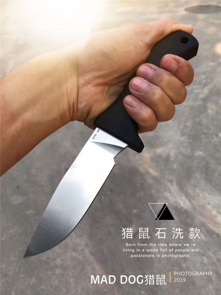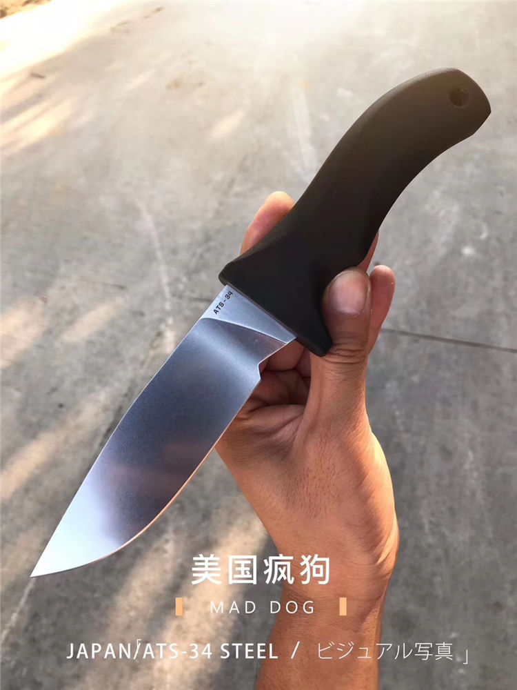 美国疯狗猎鼠直刀 总长:24cm 刃长:10.5cm 刃厚:5mm 刃宽:3.3.cm 重量:236g 钢材:日立公司ATS-34合金不锈钢 热处理:专业真空热处理 硬度:60-61HRC 表面工艺:钢本色石洗/缎面砂光 开刃方式:水冷多次开刃 柄材:黑色G10复合材质全包手柄 刀套:进口K鞘+金刚磨刀是+活动夹子 包装:出口黄色简包装 产地:美国公司提供图纸材质订单在中国大陆阳江生产